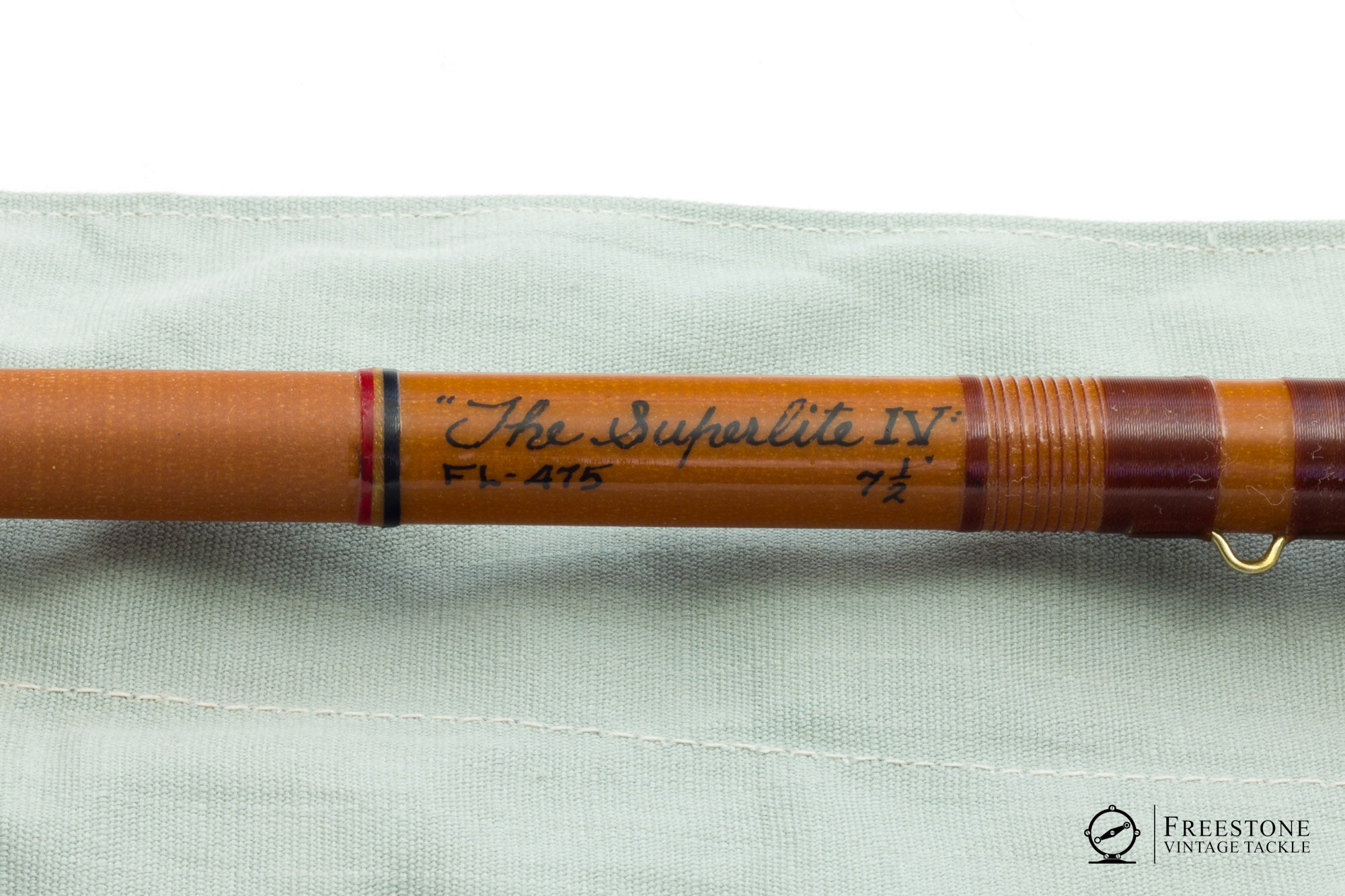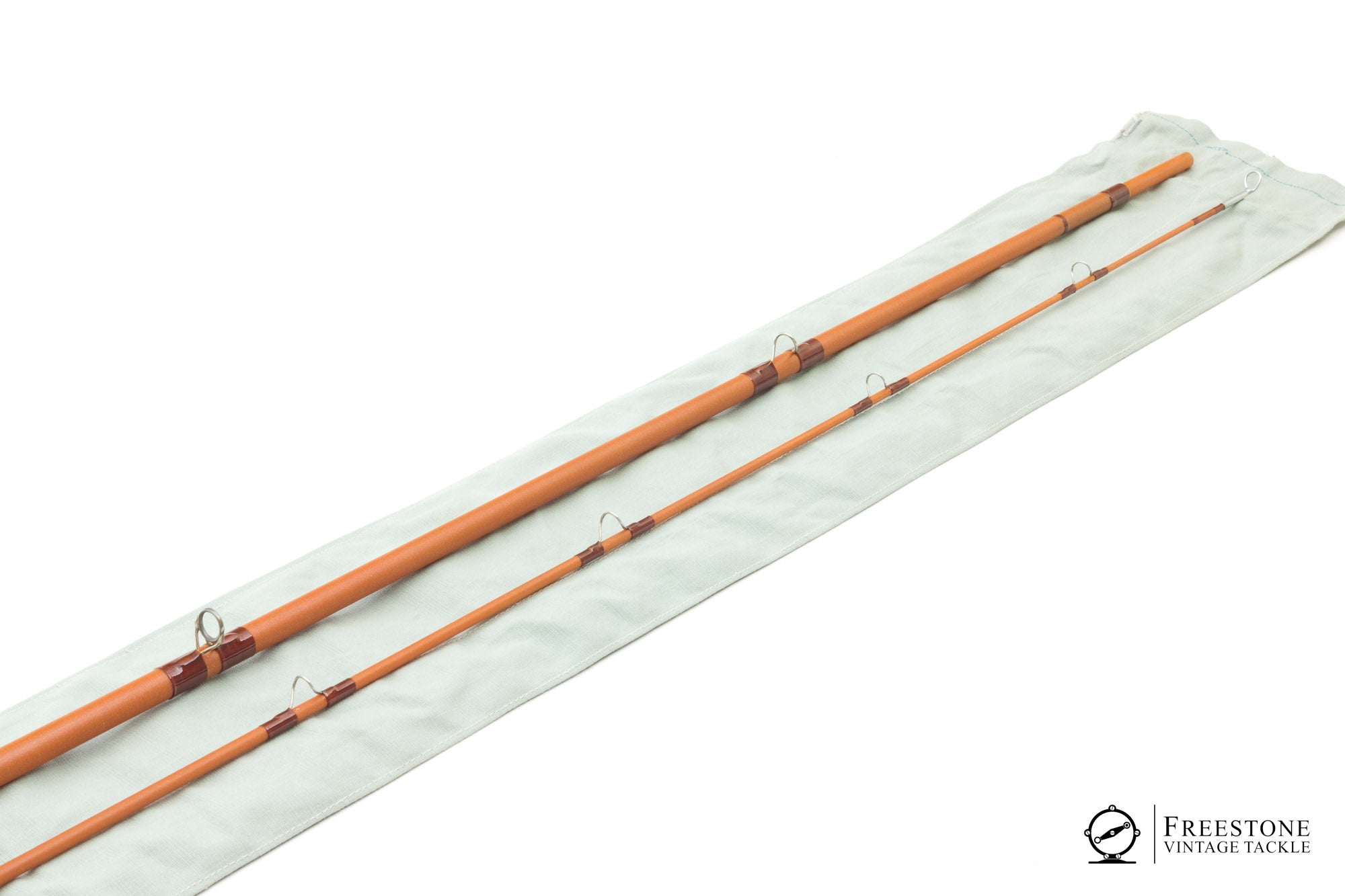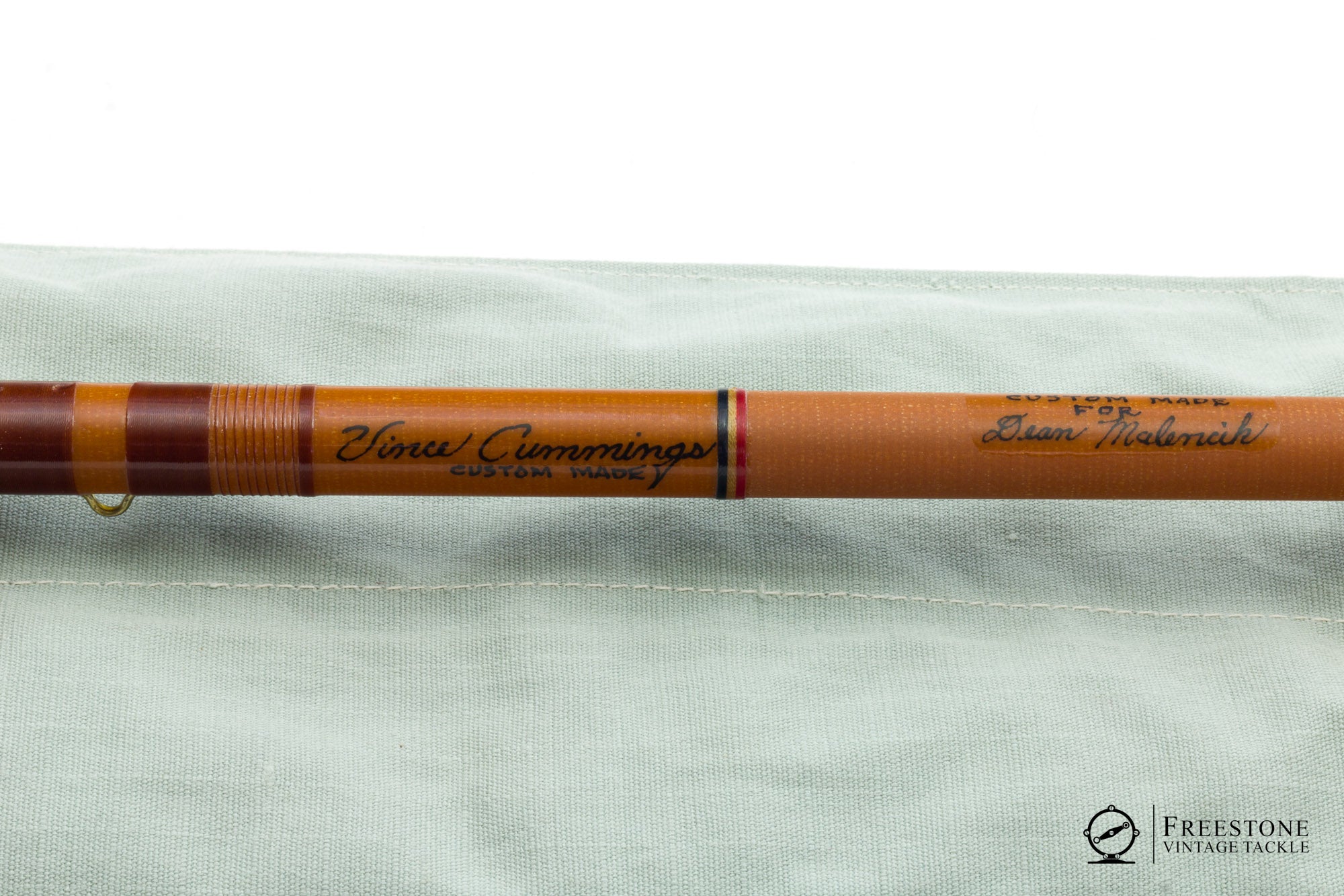 For sale here is a scarce Vince Cummings 87'6" 2pc 4wt "Superlite IV" fiberglass rod in excellent+ condition. Built on a sanded orange blank with bright guides and dark brown wraps. Spigot ferrules fit perfectly with a gap to allow for wear. The original owner's name is inked on the butt. Skeleton grip & reel seat with dual aluminum slide bands. The cork is smooth with light soiling; the rod has seen very little use. Weight is 2.57oz. Medium-fast fiberglass action, the rod loads nicely with a WF4 and recovers quickly. Vince Cummings' rods don't come up for sale very often and his lighter glass rods are highly coveted. This one packs into the original bag and tube with the maker's label affixed. This item comes from Dean Malencik’s generous donation of vintage rods & reels to Trout Unlimited. Proceeds from the sale benefit both the national organization of Trout Unlimited and your local chapters. Learn more about Dean’s gift in the March 2025 issue of Trout Magazine.