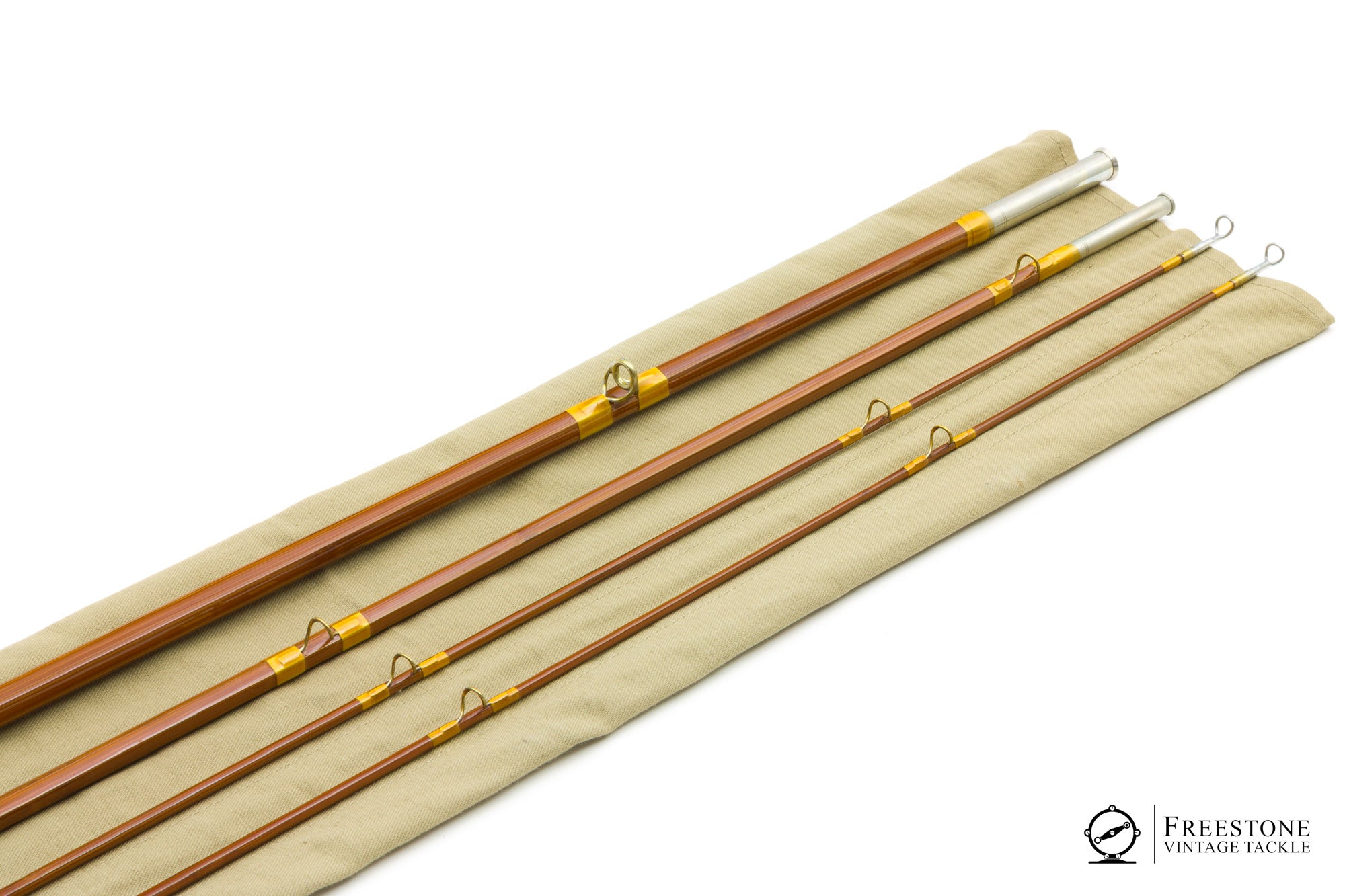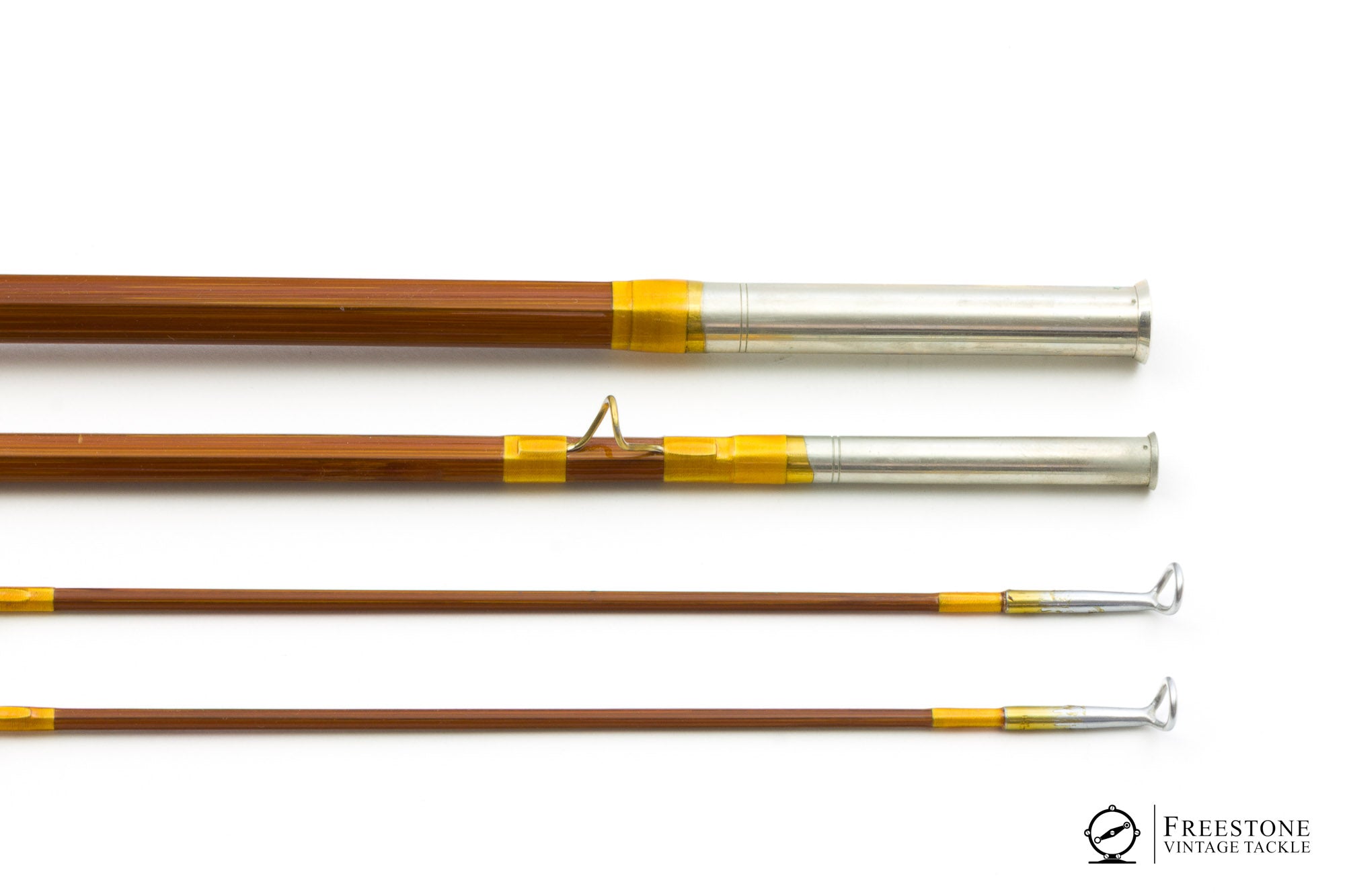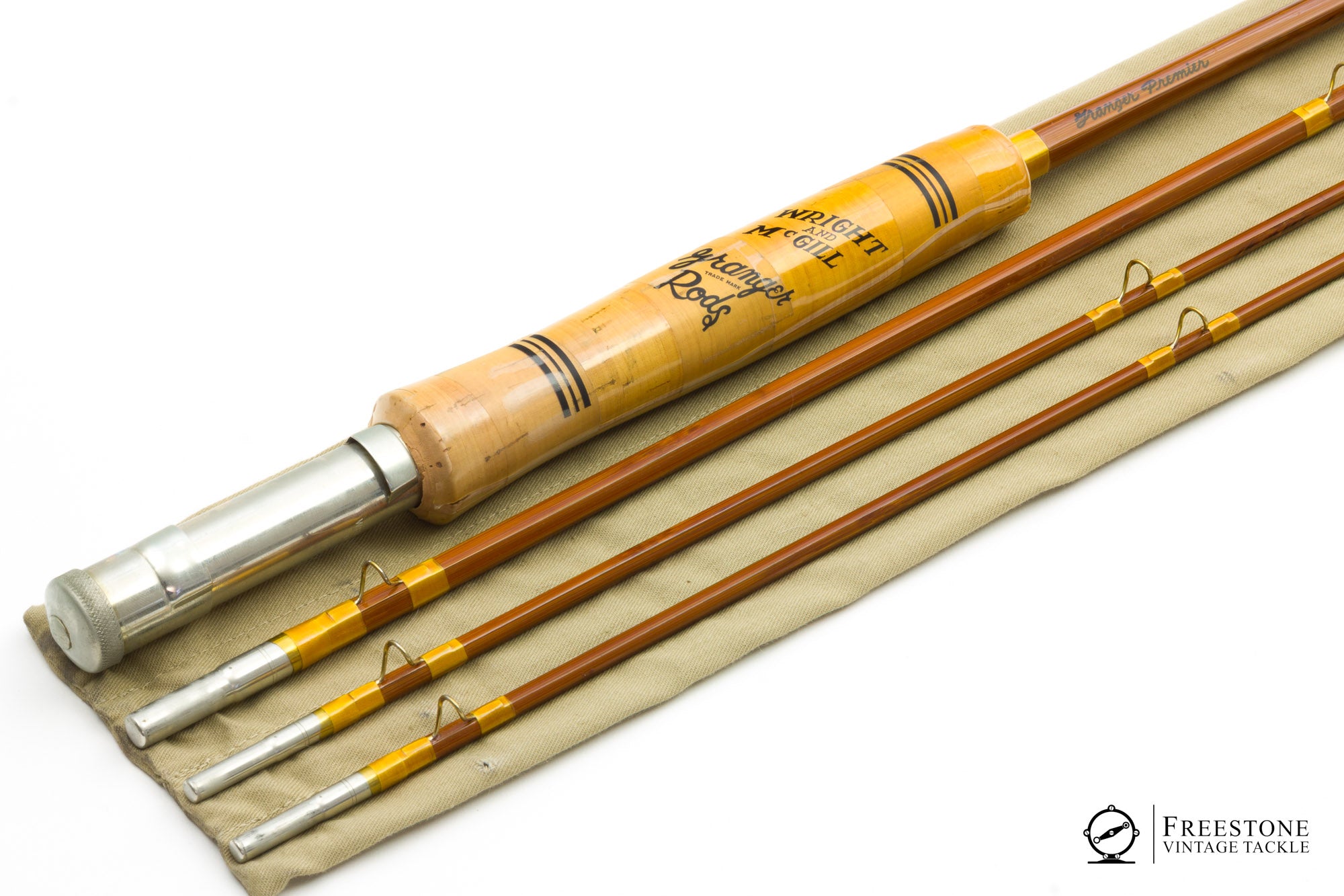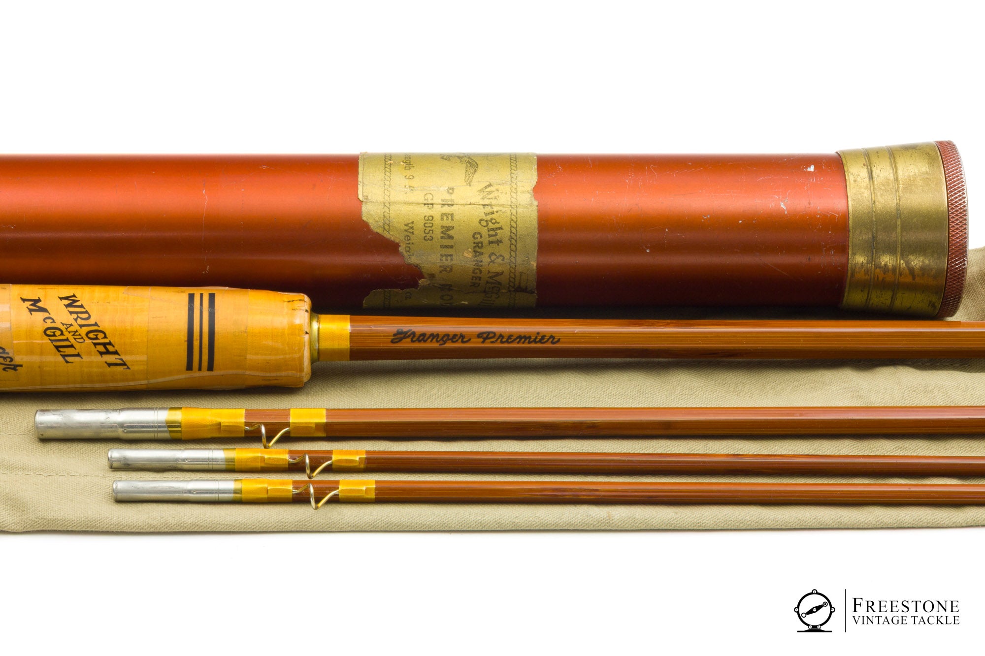 For sale here is a rare Wright & McGill 'Granger Premier' 9053, 9' 3/2 8wt bamboo rod. Excellent+ condition, the rod looks like it made have been lawn cast/carefully used although the original plastic wrap is taped in place on the cork handle. Ammoniated cane with golden yellow wraps and bright guides. The finish is in excellent shape and the ferrules fit perfectly. All sections are straight & full length. A heavy duty 9-footer, best with an 8wt although some may enjoy it with a 9. A fine example of the second highest grade Granger rod (behind the vaunted 'Registered' grade). Sold in the original bag and tube with partial label.
