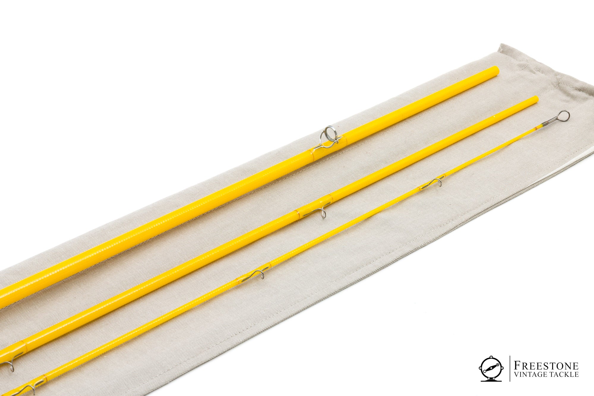For sale here is a Graywolf Rods "Heritage Gold" 8' 3pc 5wt fiberglass rod. Built on a yellow, unsanded blank. Bright guides wrapped in transparent windings with red tipping. Serial #2128. 6.5" full-Wells grip is clean and smooth, and the rod is fitted with a down-locking anodized reel seat over wood spacer. Weight is 4.09oz. Medium fiberglass action, the taper feels progressive. A versatile 8-footer from Shane Gray at Graywolf rods, sold in the original bag and tube.