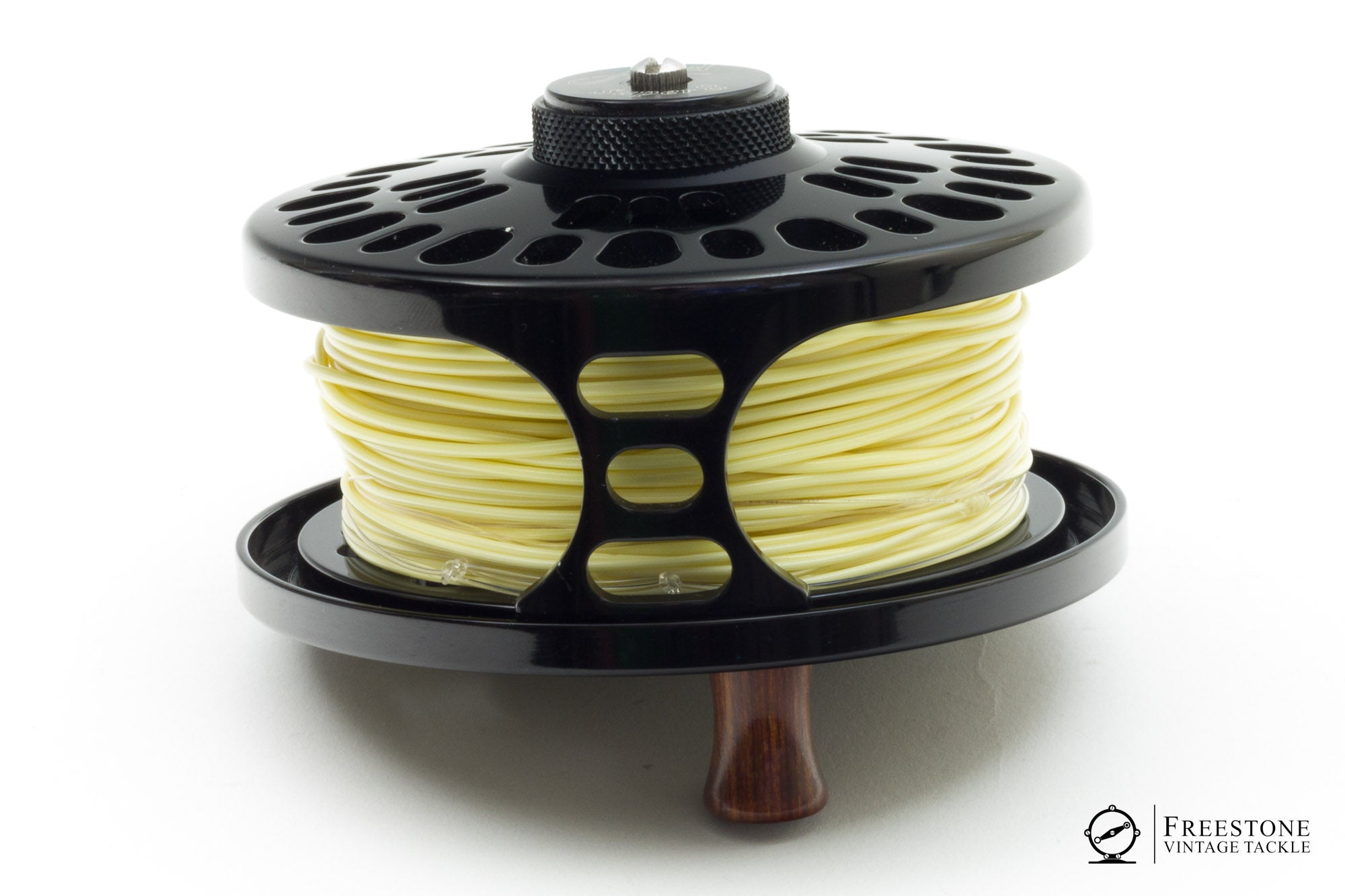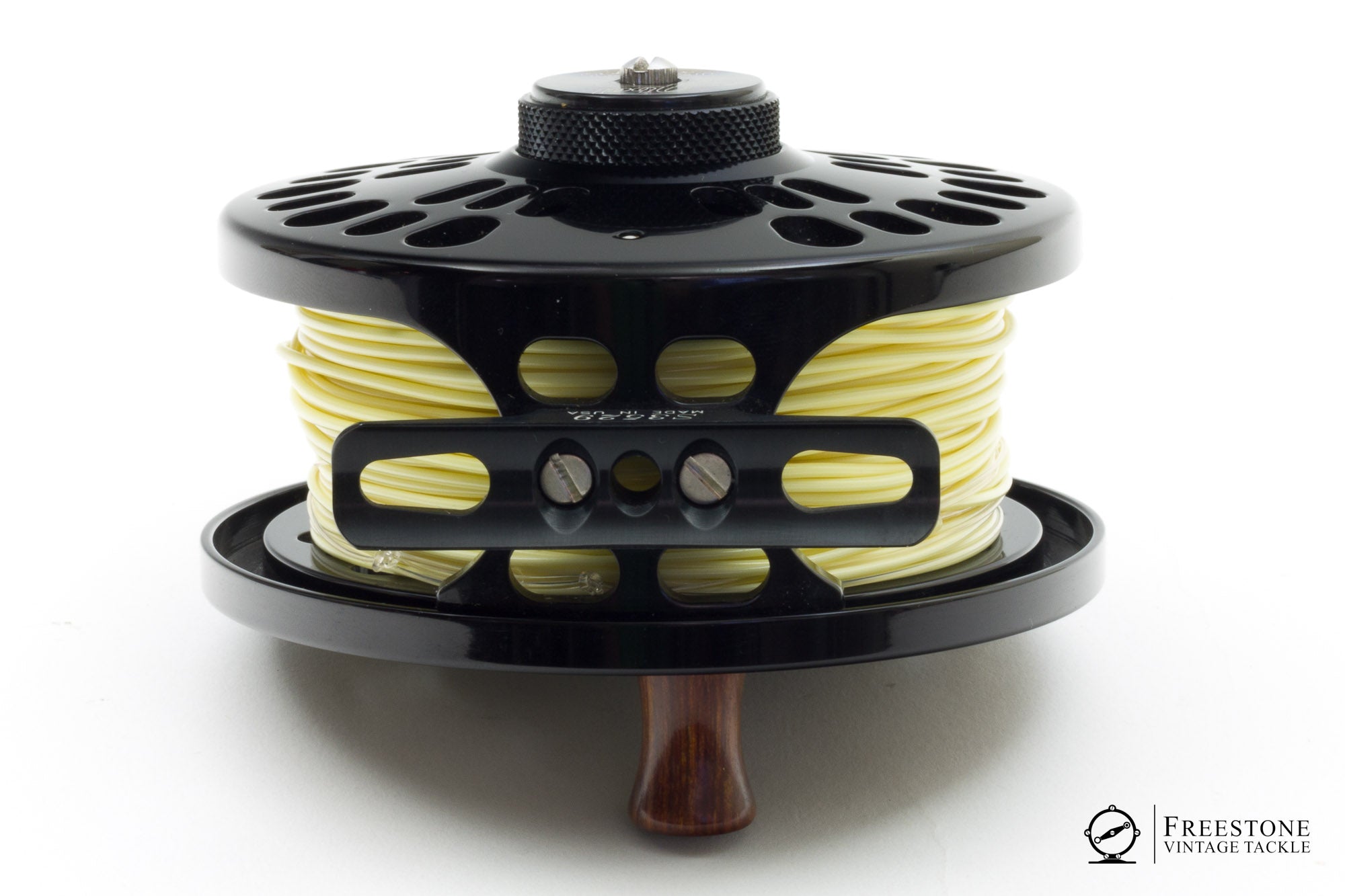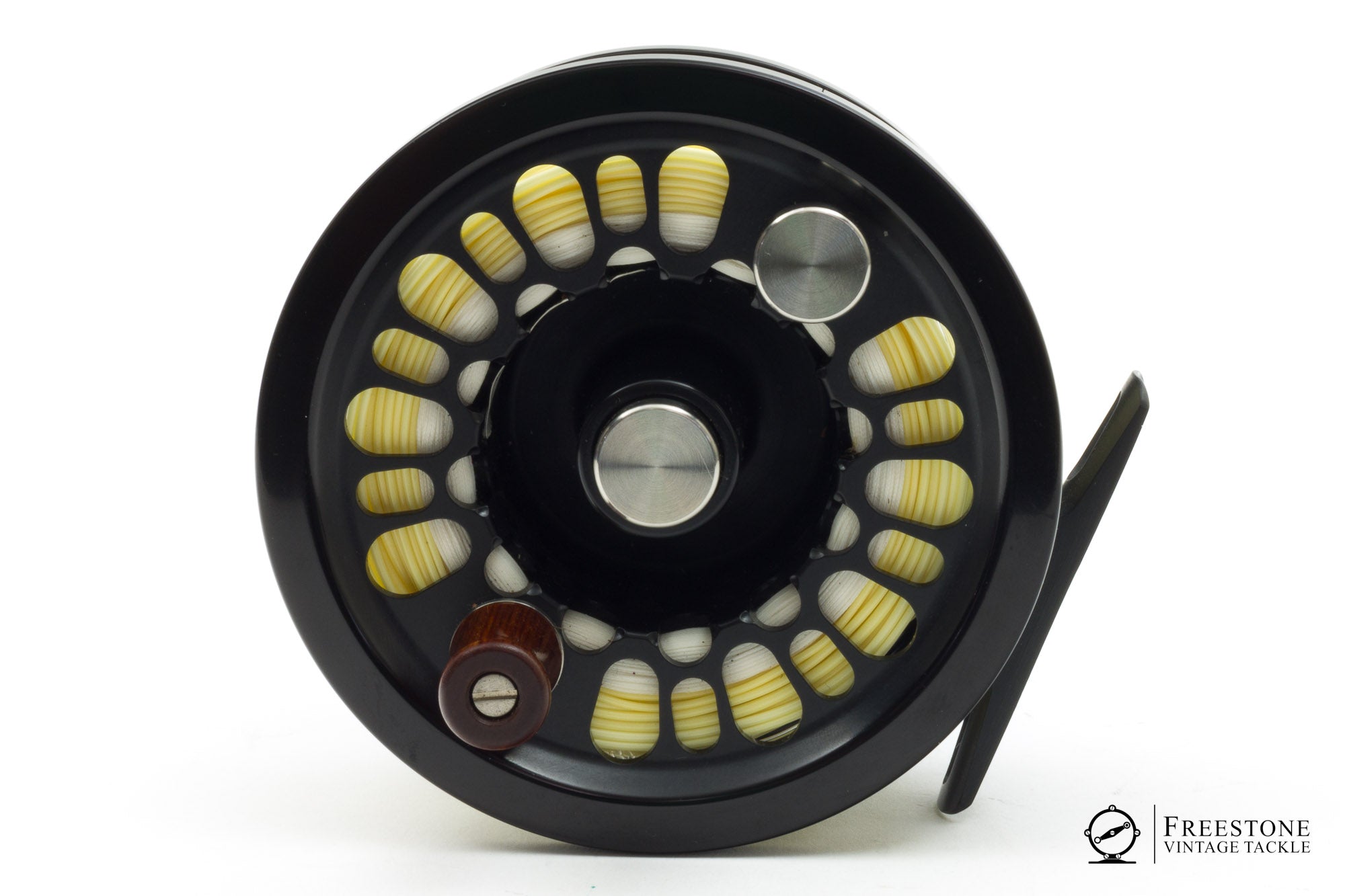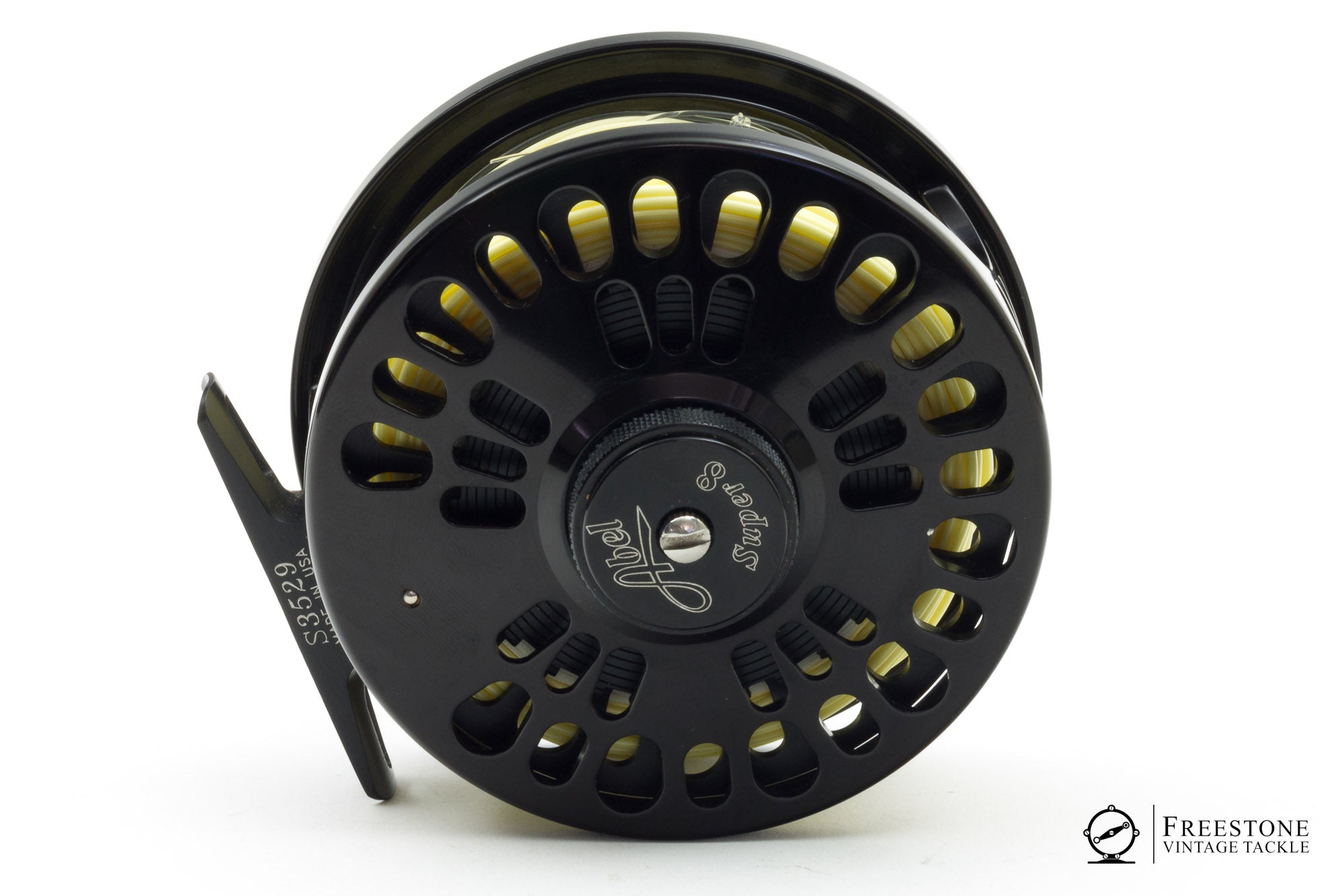 For sale here is an Abel Super 8 fly reel in very good used condition. Set up LHW but converts easily. Jet black anodized finish, fully ported frame and spool. Strong cork drag and exposed palming rim for putting the brakes on large fish. Signs of light use, including a series of small dings on the palming rim (purely cosmetic). The Super 8 is a nice size for 7/8/9wt fishing. Official capacity is for a WF8 + 220yds of 20lb Dacron. 3.9" diameter with a spool width of 0.85". Weight is 10.44oz loaded with a floating 8wt line and backing. Sold in the original green Abel pouch.