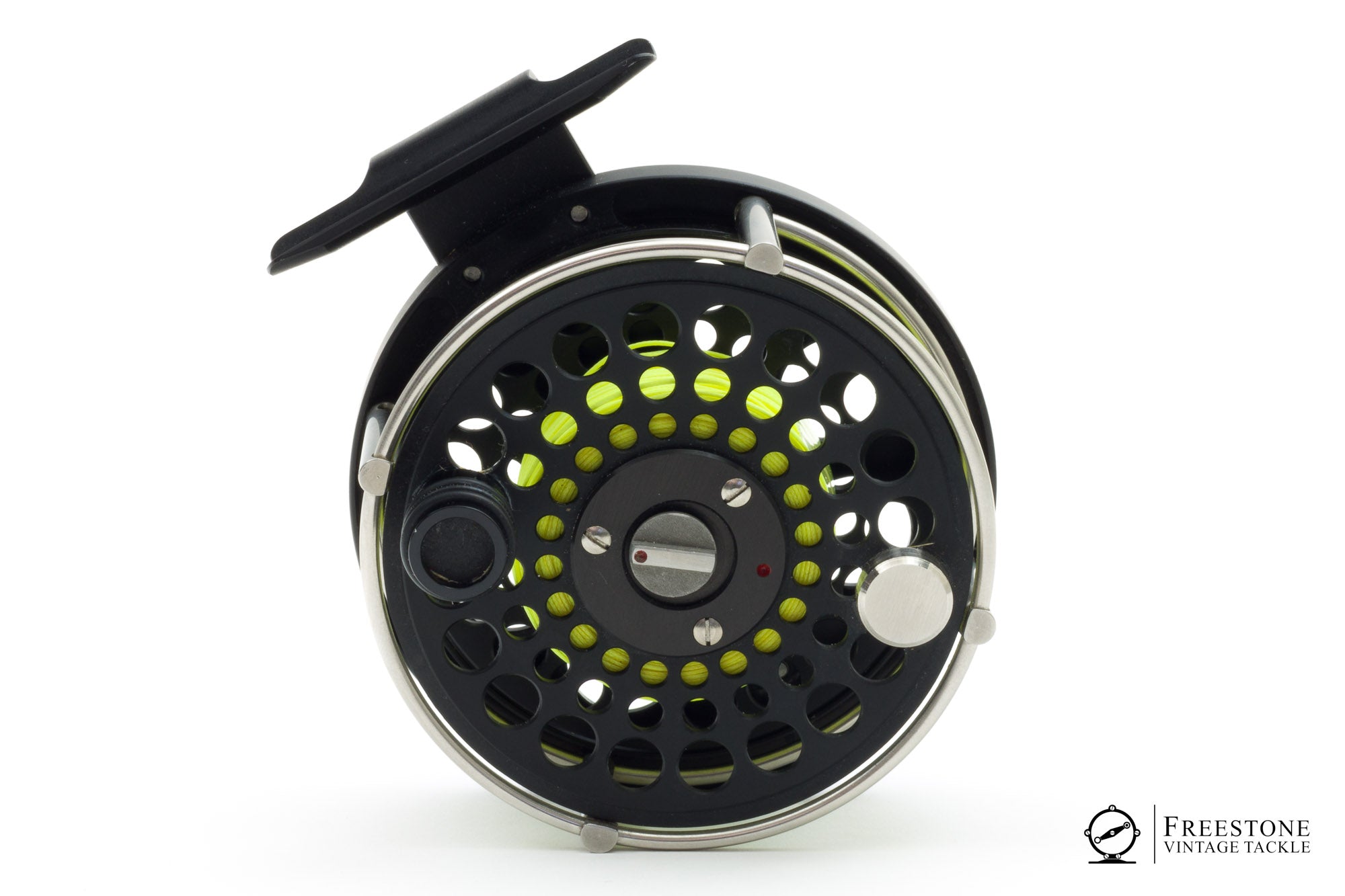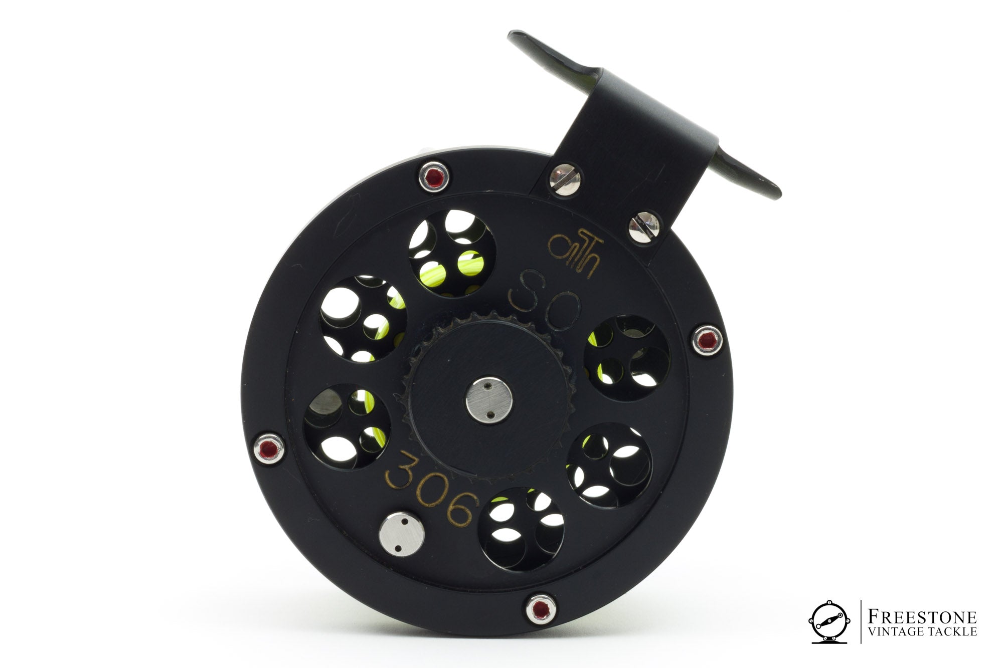 For sale here is an Ari 't Hart S0 fly reel in excellent used condition. LHW, serial #306, made in Holland. Black anodized frame and spool. 3.35" (85mm)frame diameter with a spool width of 0.81" (20mm), best with 5/6/7wt lines. Light mounting marks to the foot, otherwise the reel looks nearly perfect. Mechanically tight with strong adjustable cork drag and on/off clicker. Weight is 6.88oz loaded with backing. Sold in an aftermarket neoprene case.