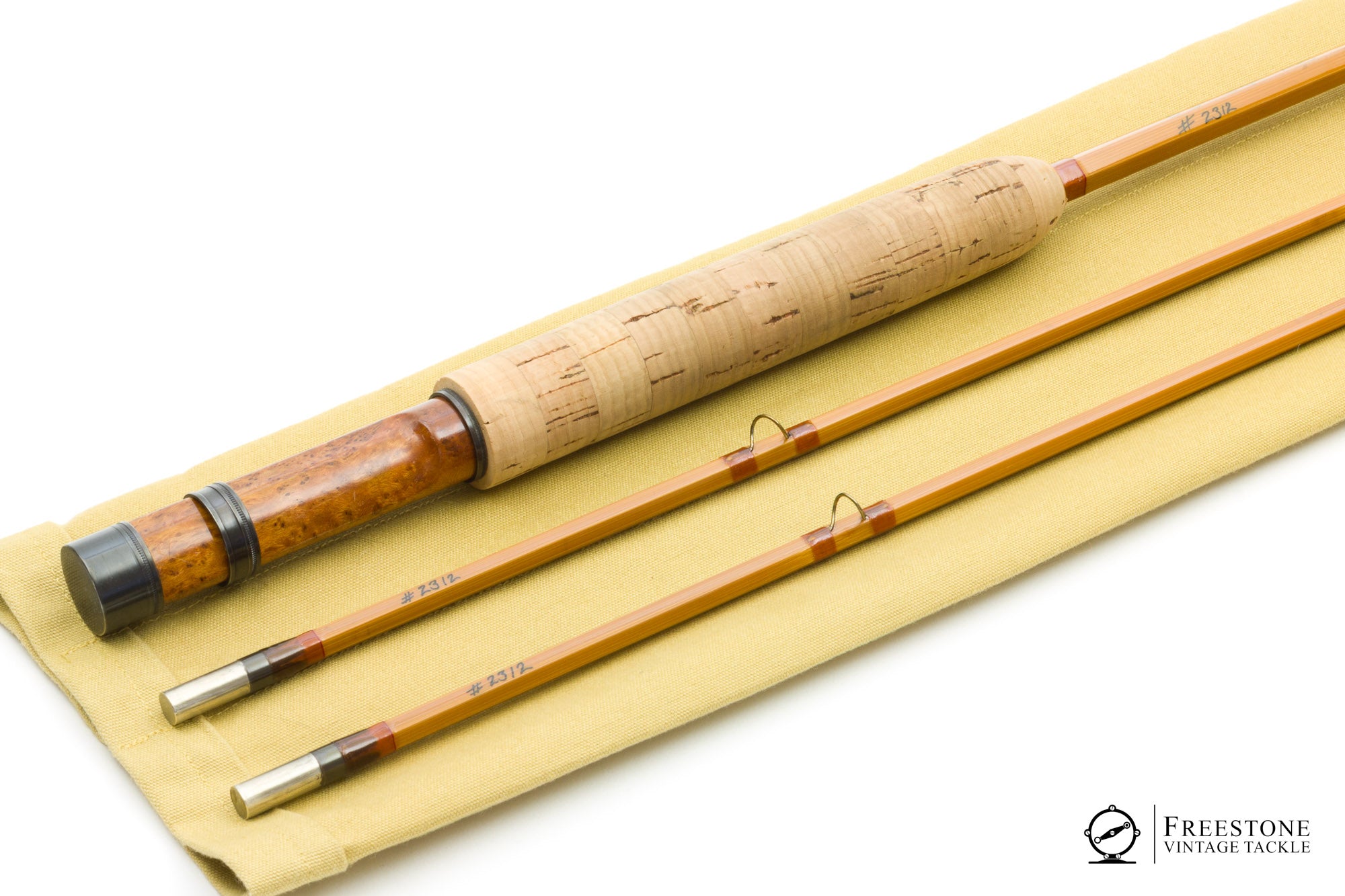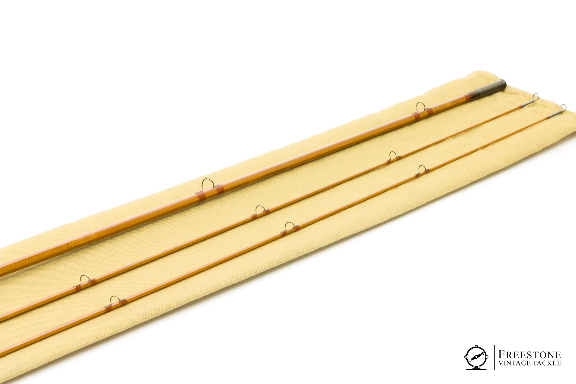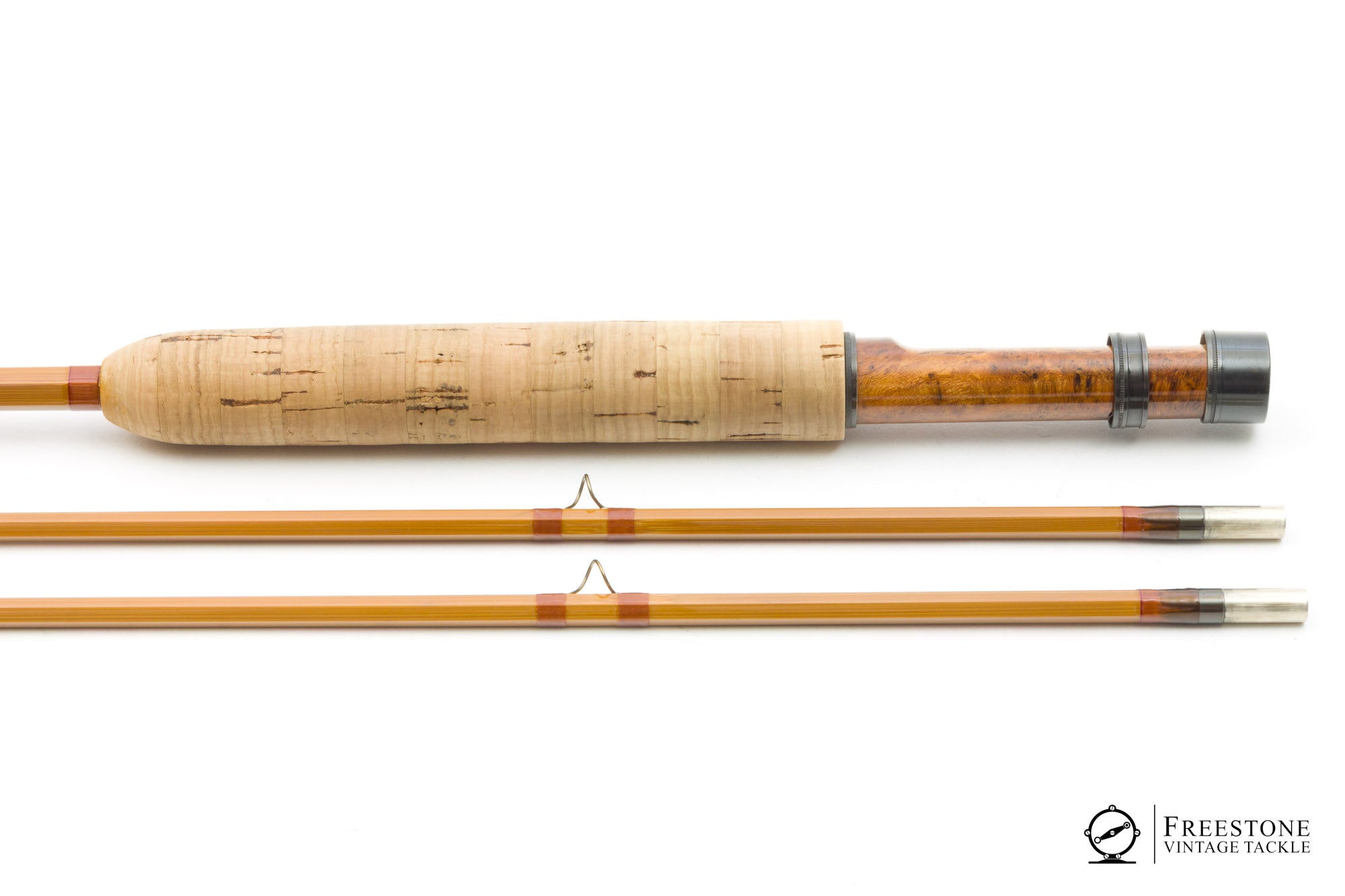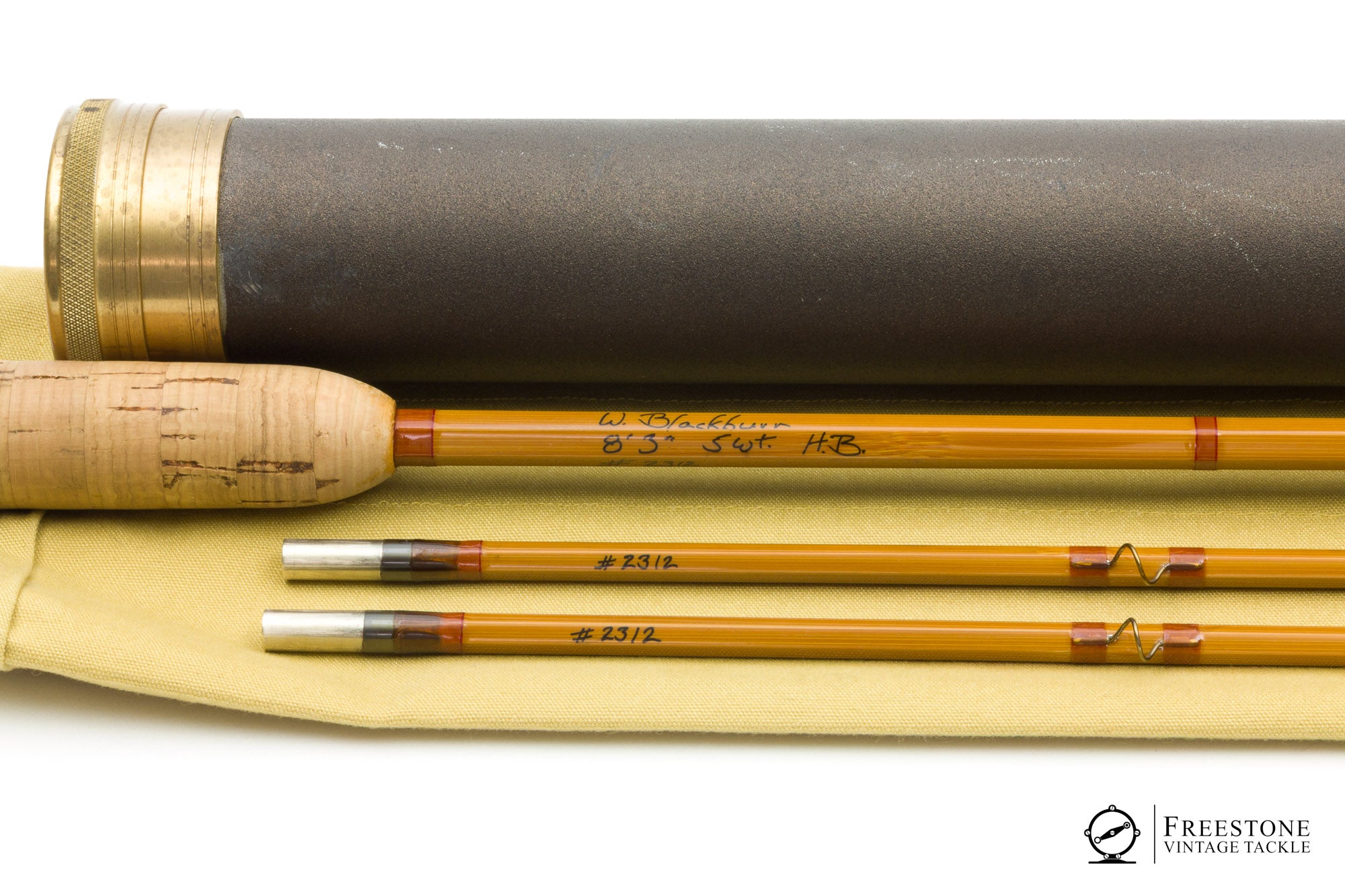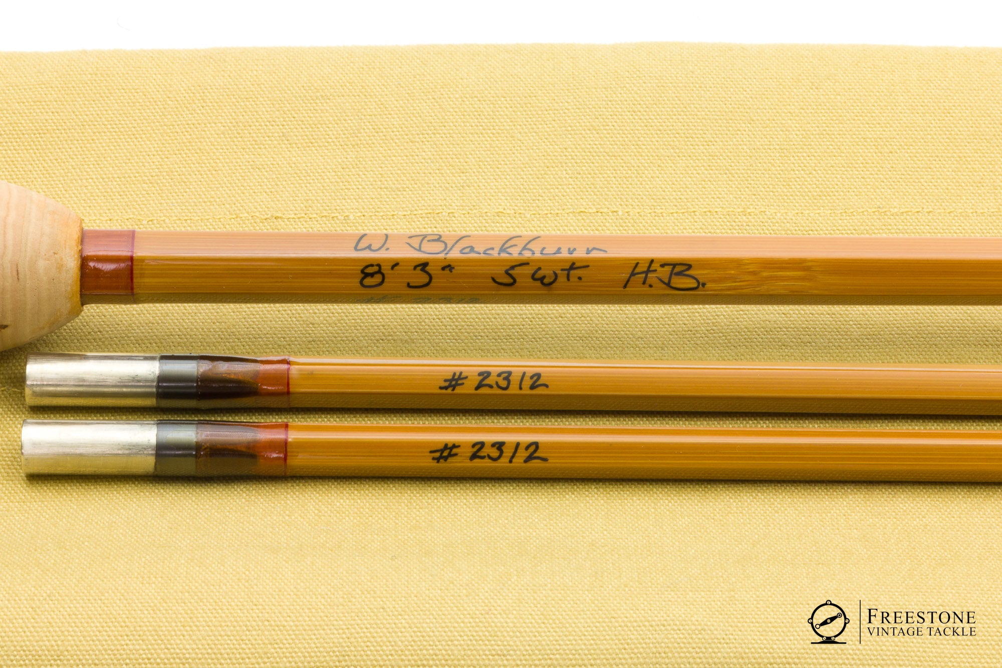 For sale here is a Bill Blackburn 8'3" 2/2 5wt hollow built bamboo rod in excellent+ condition. Medium tempered cane with dark guides and transparent amber windings. Blued ferrules fit perfectly, and all sections are full length, straight & serialized (#2312). 6" cork grip is smooth and clean, and the rod is fitted with a blued cap & ring reel seat over mortised burl spacer. Weight is 4.16oz. A powerful 5wt with medium fast action, I like it with a WF5. A great taper from Mr. Blackburn in fantastic condition. Sold in the original bag and heavy brass capped tube.