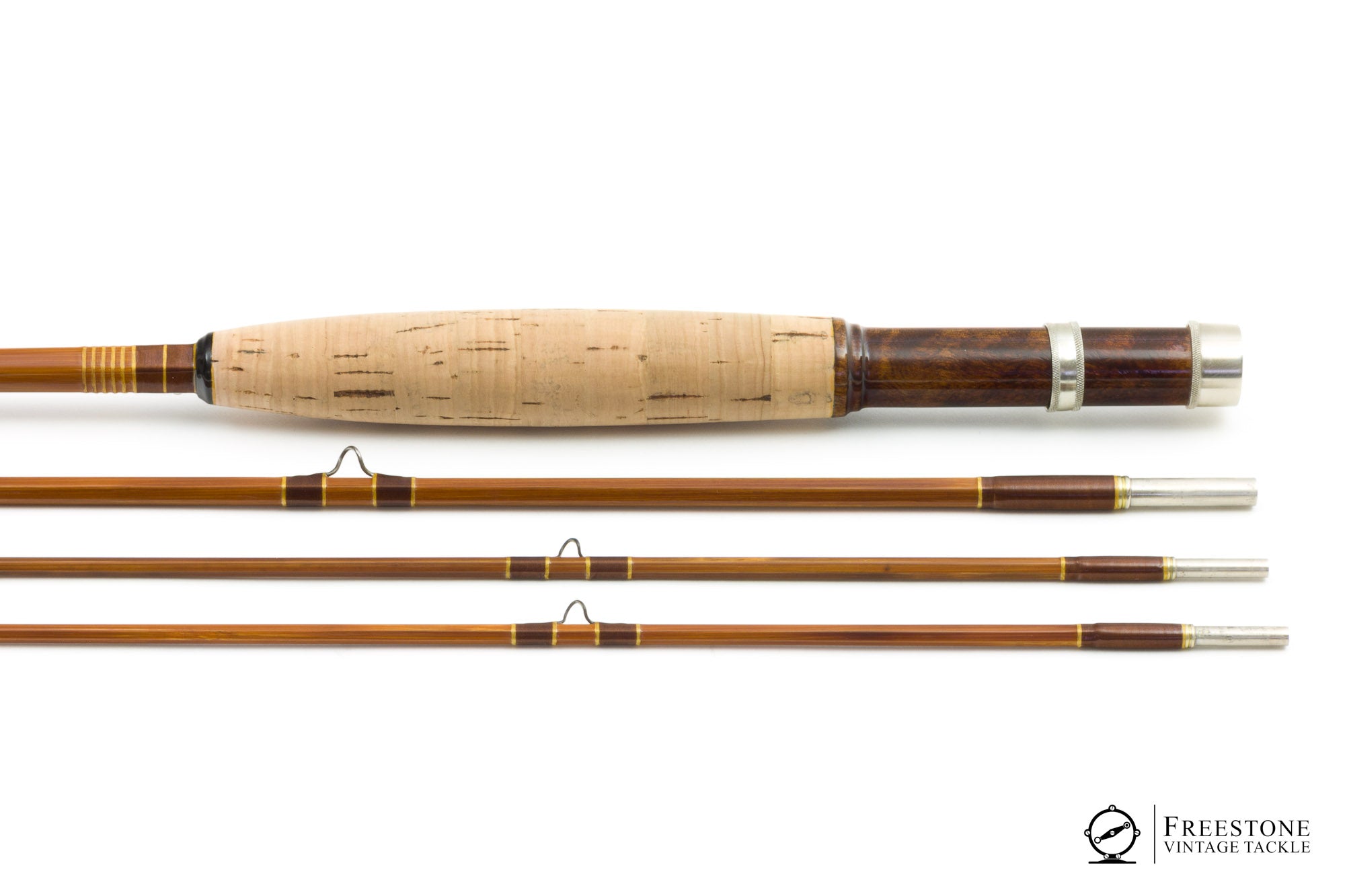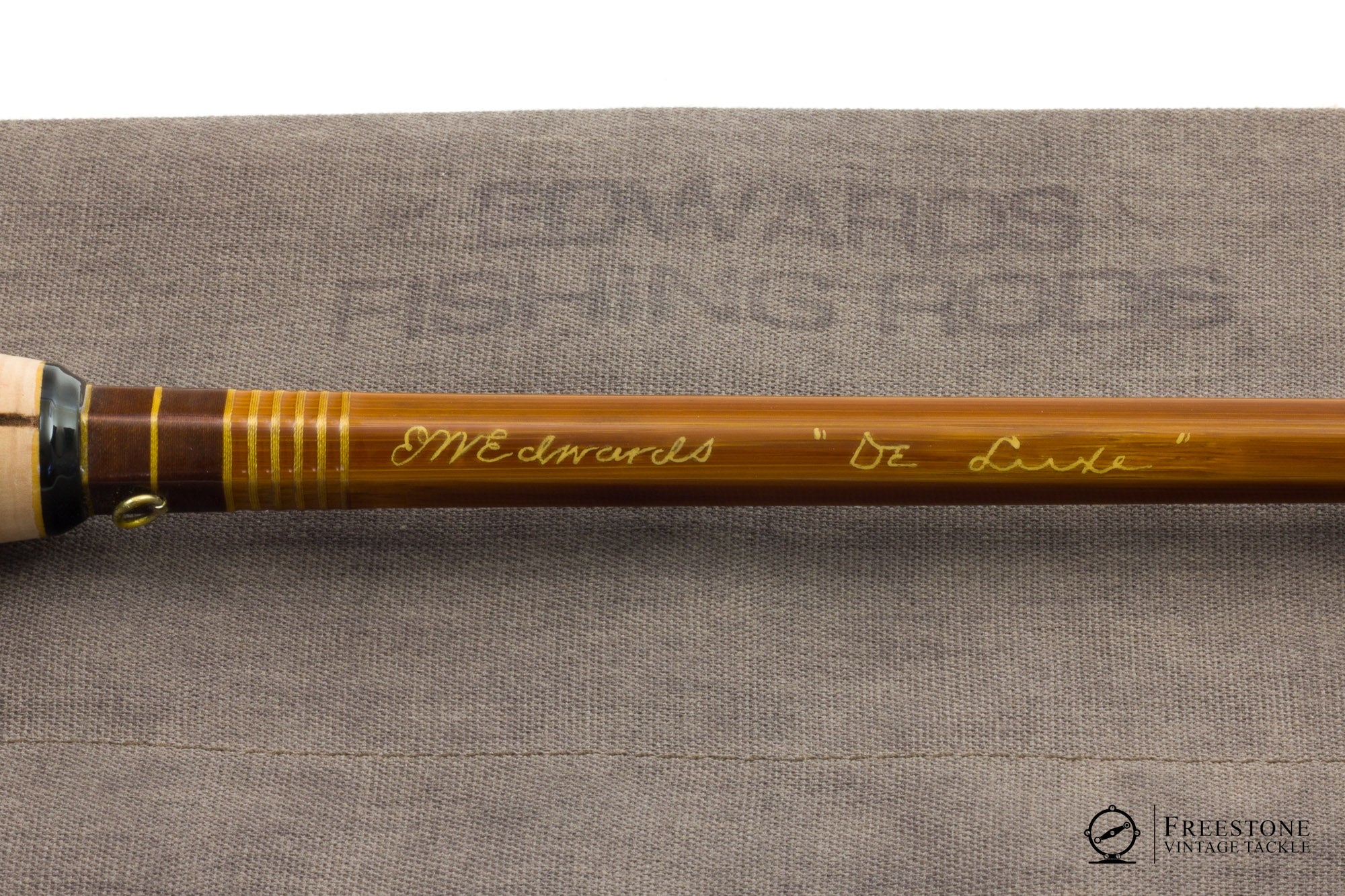 For sale here is an E.W. Edwards Deluxe 7'6" 3/2 4-5wt bamboo rod in excellent+ restored condition. Restored by Steve Blake, the rod has seen little use since. Dark flamed cane with Edwards snake guides and red agate stripping guide. Wraps are chestnut brown with pongee tipping. Ferrules fit perfectly and all sections are straight & full length. The script on the butt is re-written. Strap & ring hook keeper, black Bakelite winding check and 5" cork grip is smooth and clean. The cap & ring reel seat over dark wood spacer looks like a replacement. Weight is 3.81oz. Smooth, medium action, I like it with a DT5 but it will cast a DT4 also. A nicely restored Edwards Deluxe in a very desirable length. Sold in the original bag and tube with partial Mt. Carmel label, ready to fish!