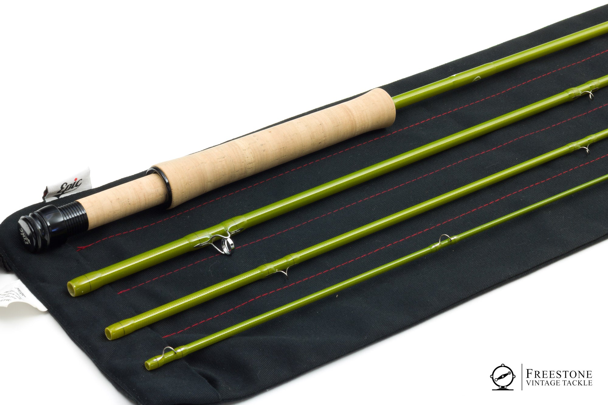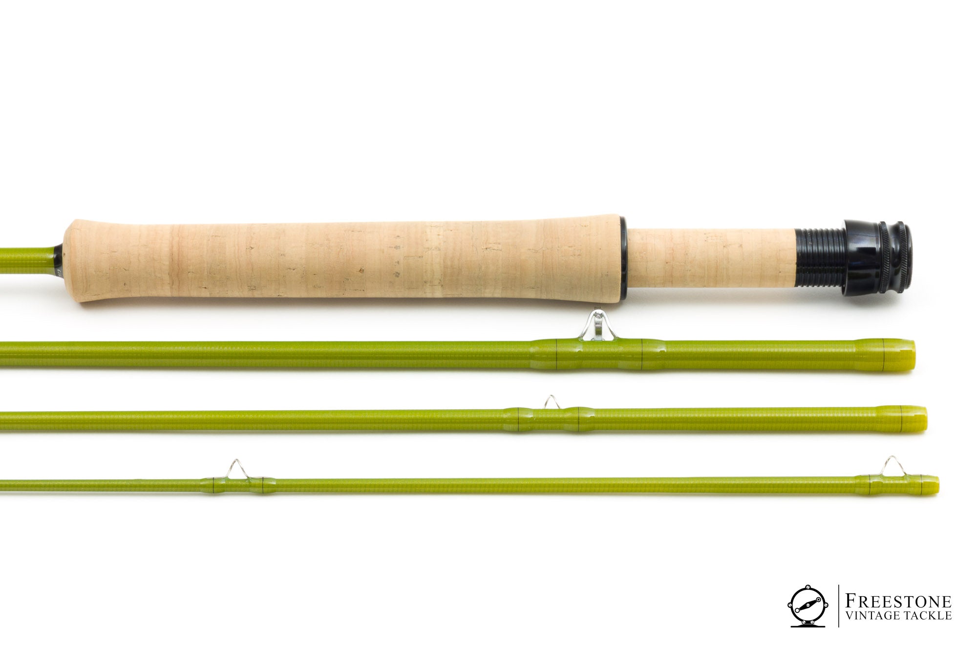 For sale here is an Epic FastGlass 3700, 7' 4pc 3wt fiberglass rod. Near mint condition, I can see the faintest imprint of a reel seat on the cork spacer but otherwise the rod is mint. Built on a green unsanded blank with matching green wraps. The cork is clean and bright, and the serial number (#2973) is on the winding check. Weight is 2.68oz. Medium fast fiberglass action, it loads nicely with a WF3 or DT3. Sold in the original bag and fiberglass tube.