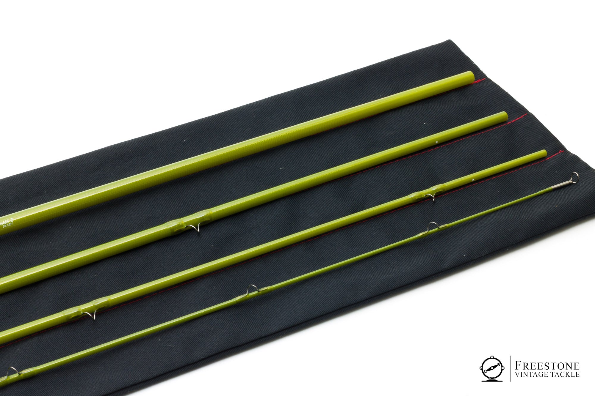 For sale here is an Epic FastGlass 580, 8' 4pc 5wt fiberglass rod. Near mint condition, the ferrules have light scratches from being assembled but the rod looks practically new. Built on a green unsanded blank with matching green wraps. The cork is clean and bright, and the reel seat spacer is made of the same unidirectional S-glass. Weight is 3.77oz and the serial is #1807-021. Smooth 5wt action, on the medium-fast end of the spectrum, especially for fiberglass. Sold in the original bag and tube.