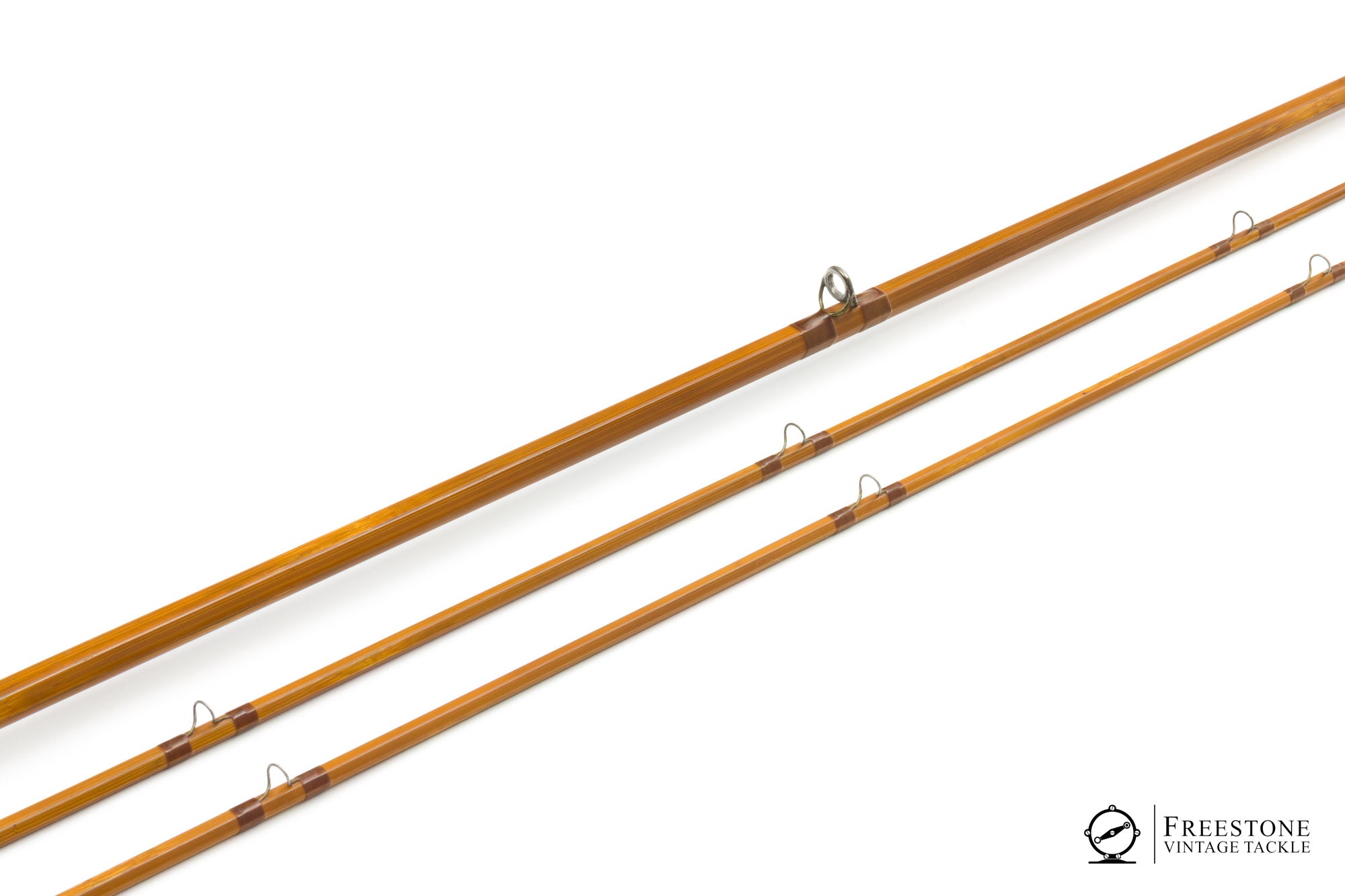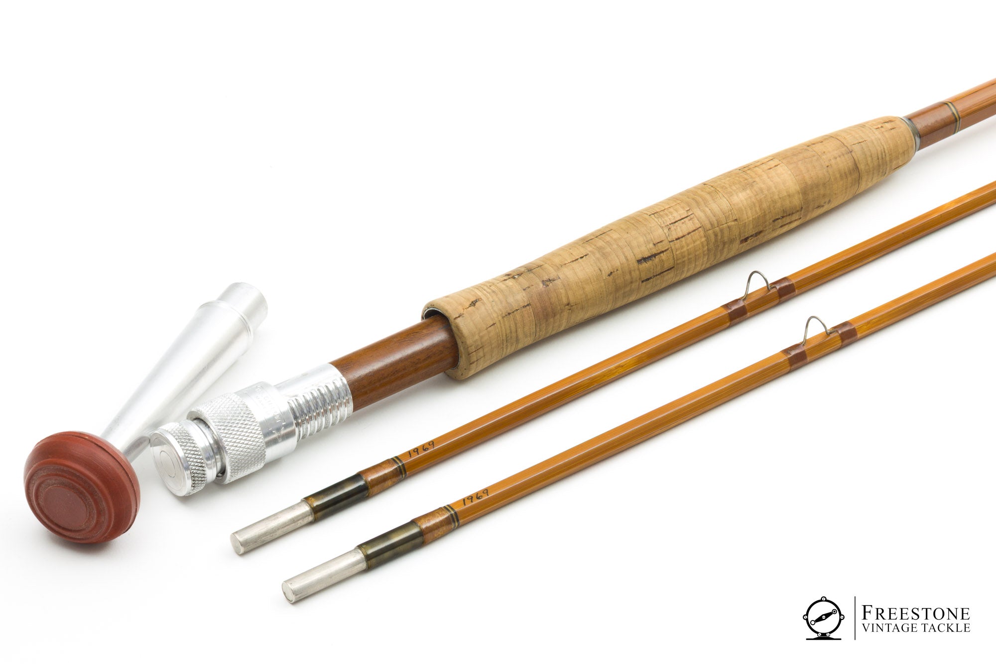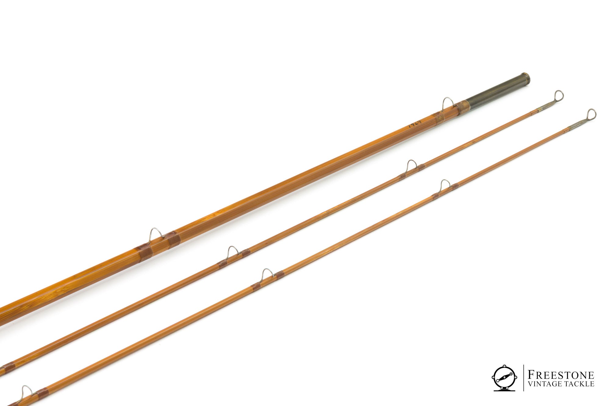 For sale here is a Pinky Gillum 9' 2/2 8wt salmon rod in excellent used condition. All original with medium toned cane, oxidized guides and brown wraps. Blued ferrules fit perfectly, and all sections are full length, straight & serialized (I-969). Black & white signature wraps above the winding check, 7' cork grip (smooth & soiled), and up-locking reel seat over mahogany spacer. The screw collar retains the H.S. Gillum stamping and the butt cap removed to accept a 4.75" fighting butt. Weight is 7.16oz. The only condition note I have is a small varnish chip on one tip about 2" below the tip top. It appears to be surficial, although the next owner may way to address it. A stout 8wt, purpose built for salmon & steelhead. Sold in a replacement bag and leather clad tube. The fighting butt packs into its own separate cloth bag.
