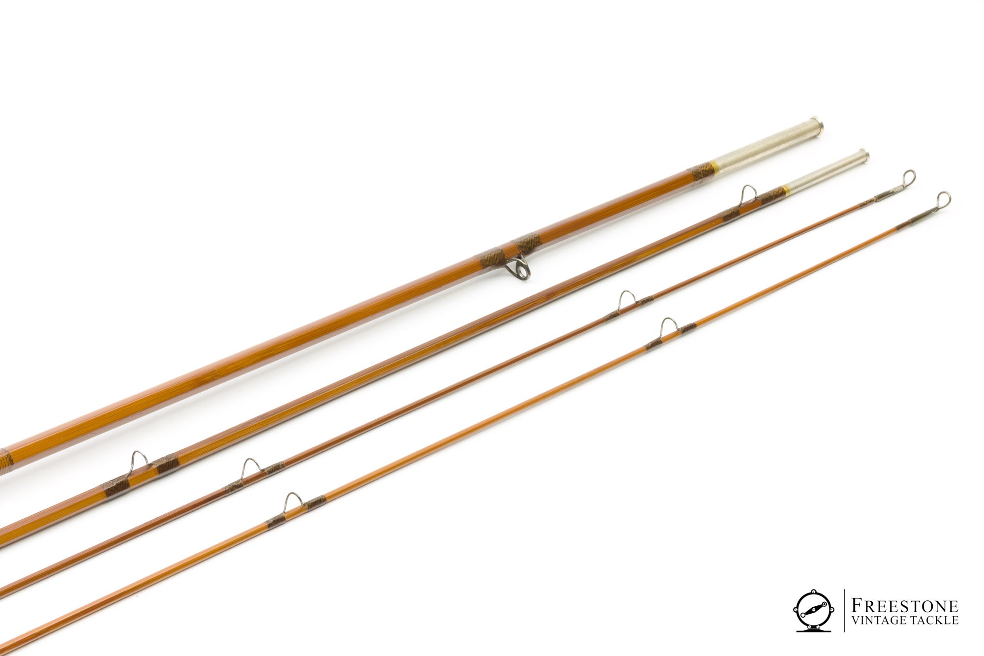 For sale here is a Wright & McGill Granger Victory 8040, 8' 3/2 5wt bamboo rod. Good used condition, the mid had been refinished and the bottom snake guide is a replacement. One tip has a much lighter tone to the cane, and I believe it is a replacement. Ammoniated cane with dark guides and variegated wraps. Ferrules fit perfectly and all sections are full length. Both tips’ ferrules are mounted slightly off center, but the bamboo is straight. Rubber stamps are faint but intact on the butt section above the grip, one reading "Wright & McGill" and the other reading "Granger Victory". 6.5" cork grip is soiled with light ridging, and the rod is fitted with the patented screw lock reel seat. Weight is 4.71oz. Medium fast action, a smooth casting 5wt and maybe the best "all around" Granger tapers. Sold in the correct back and fiber tube with paper label intact.