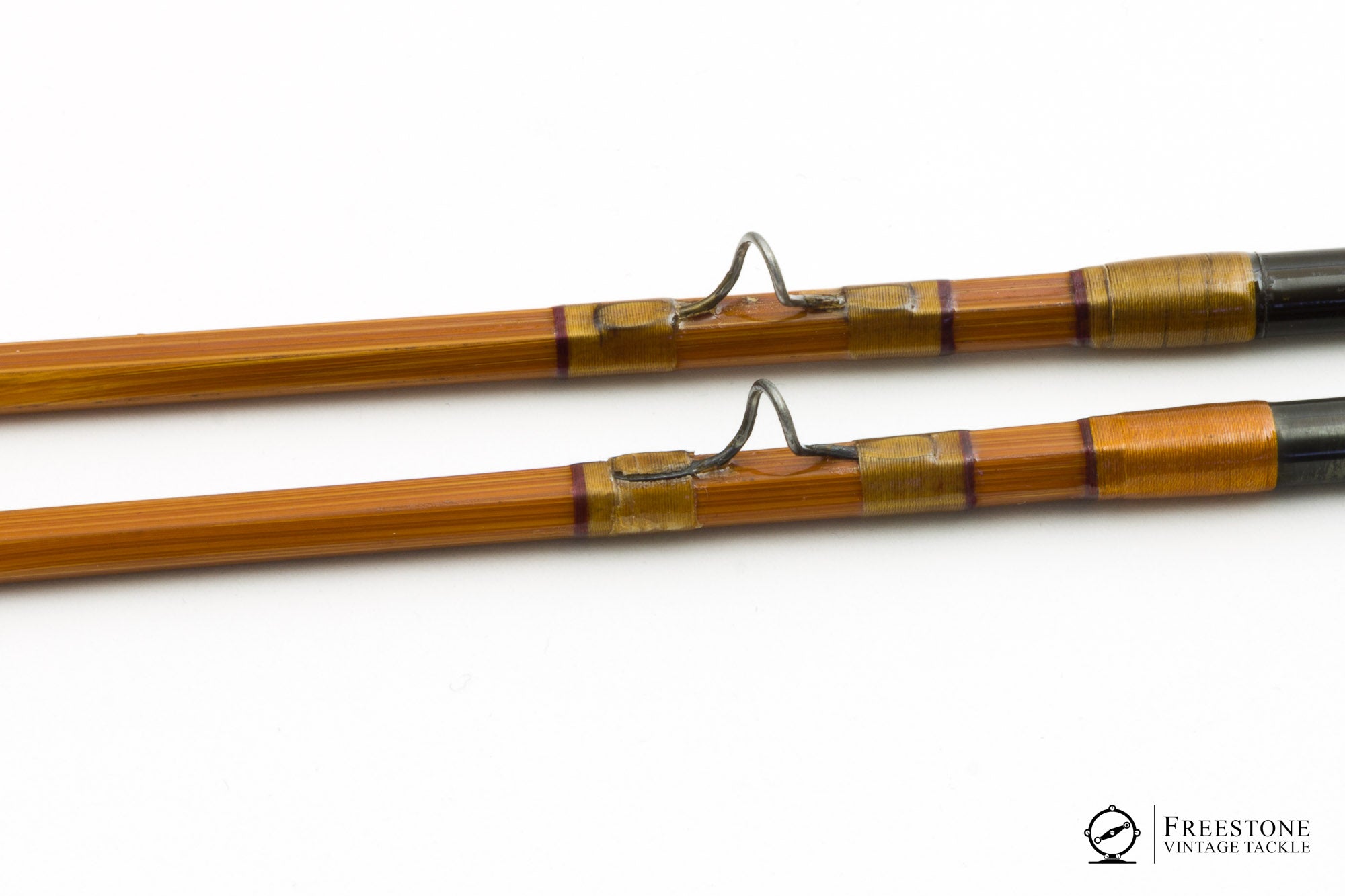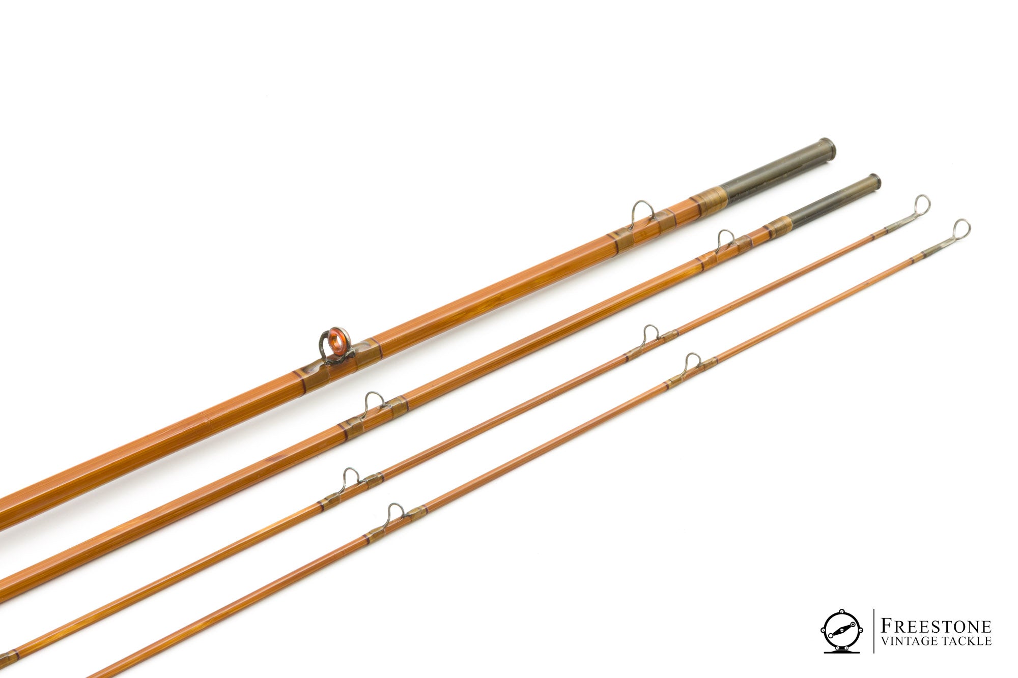 For sale here is a 9' 3/2 5wt bamboo rod made by George Halstead. Very good condition with a few notes. The wraps appear original except one tip ferrule is rewrapped along with the tip snake on the mid section. The bottom snake guide on the tip with the rewrapped ferrule has broken threads on one side; this should be rewrapped prior to use. Also, the varnish shows signs of softening, especially on the butt section. There are a few sags/areas of minor alligatoring but the varnish has hardened up, and I would characterize the issue as purely cosmetic. Golden tan wraps with oxblood tipping, blued ferrules and red agate stripping guide. Ferrules fit perfectly and the sections are all straight & full length. The cork has been cleaned and shows minor ridging. Down-locking reel seat hardware with the G.H. Halstead stamp intact on the collar. Weight is 5.11oz. Medium action, best with a 5wt. An interesting rod, most Halstead 9' rods tend to be heavier action and made for heavier lines. This feels like a true blue 9-foot trout rod. Sold in the original bag and brass capped tube.