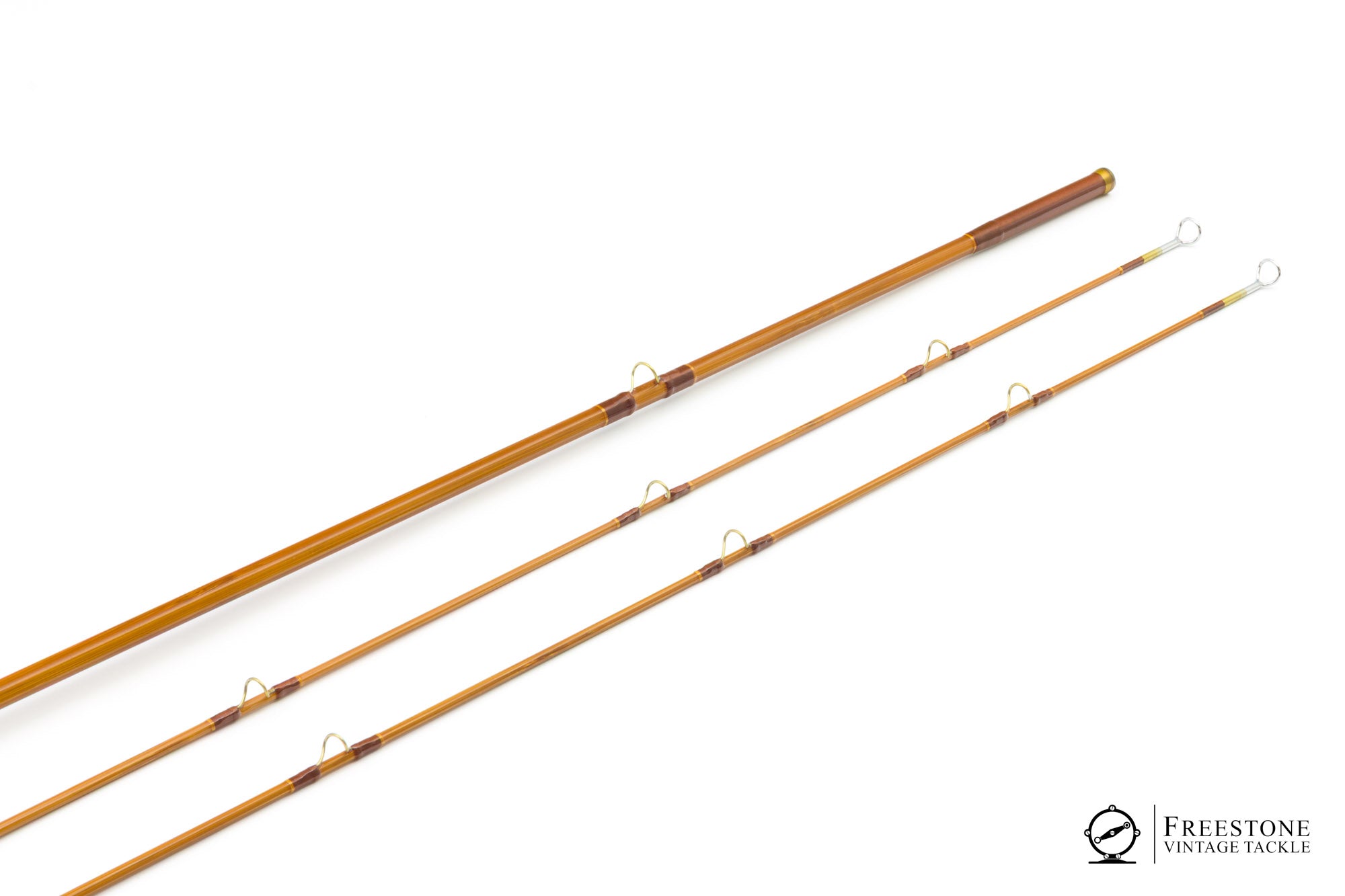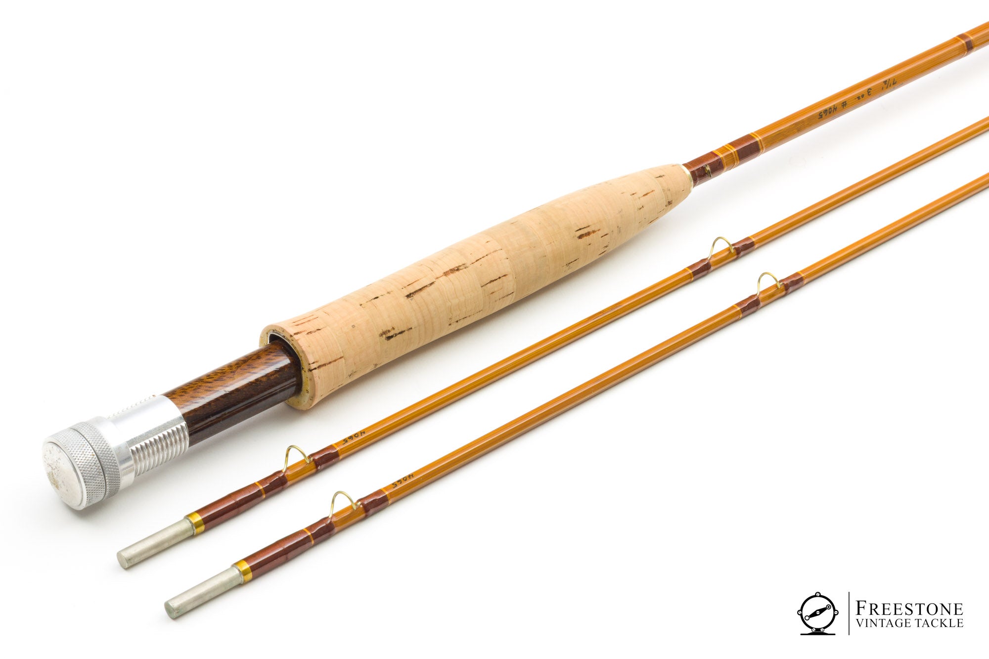 For sale here is a Gary Howells 7'6" 2/2 4wt bamboo rod in excellent+ condition. Serial #4065, made in 1973 for Classic Rods. Medium tempered cane with 3x3 nodes, bright snake guides and carbide stripping guide. Wraps are color preserved chestnut brown with gold tipping. All sections are full length, straight & serialized. 13/64 ferrules fit perfectly, and the female is overwrapped to the welt. 6" Western grip is bright and smooth, and the rod is fitted with Howells' uplocking aluminum reel seat over zebrawood spacer. Actual weight is 3.5oz (1/2oz accounted for by the reel seat). A classic Howells rod with medium action that flexes down to the grip. The rod has been lawn cast and possibly fished sparingly but it shows no obvious signs of use. Sold in the original bag and tube with label affixed.