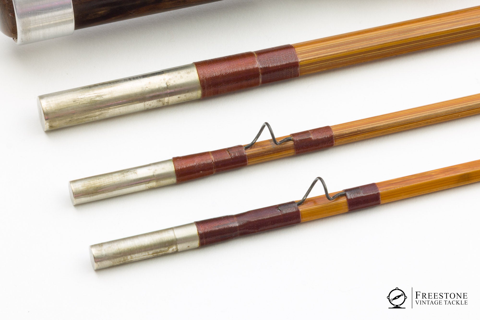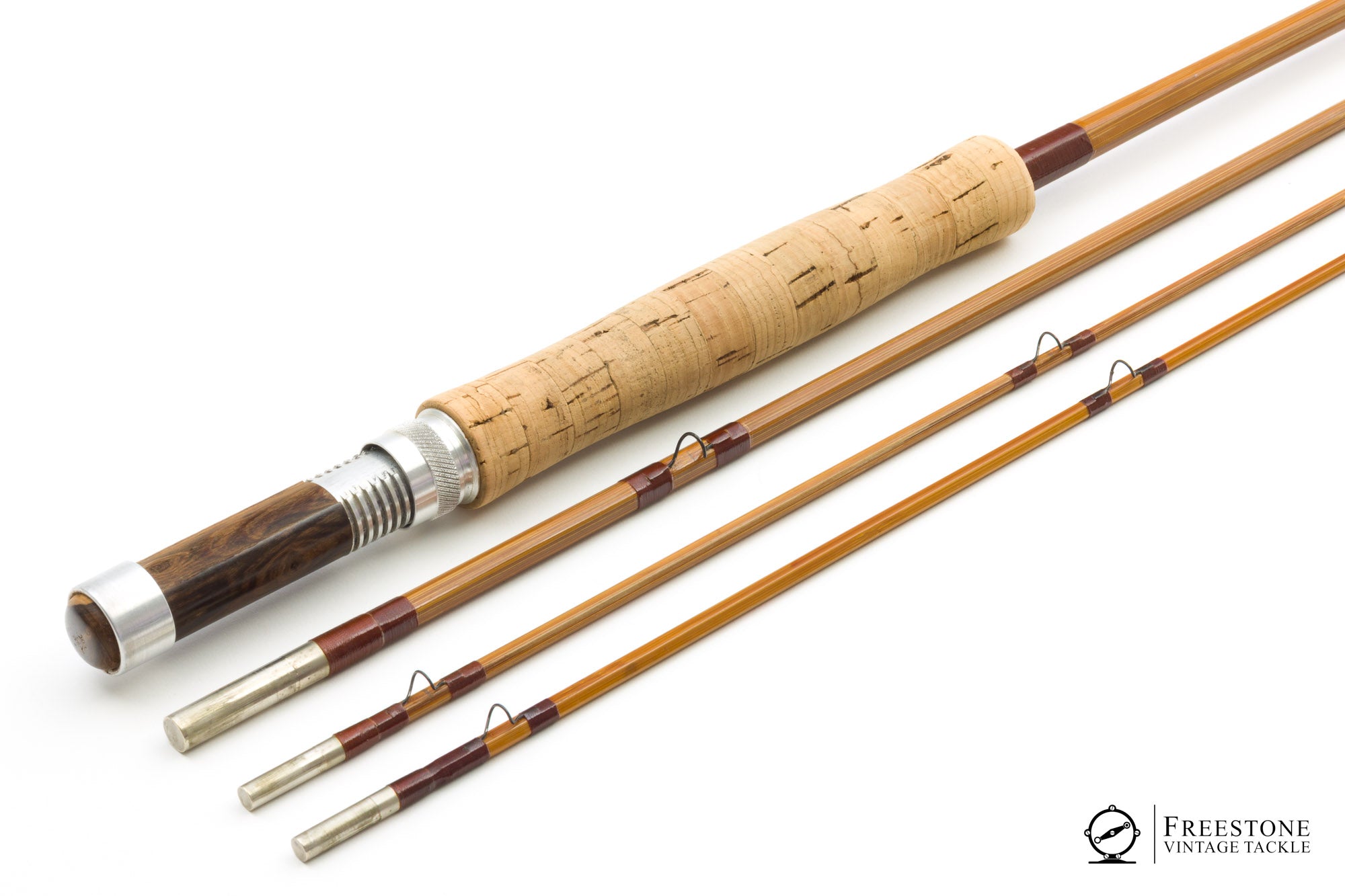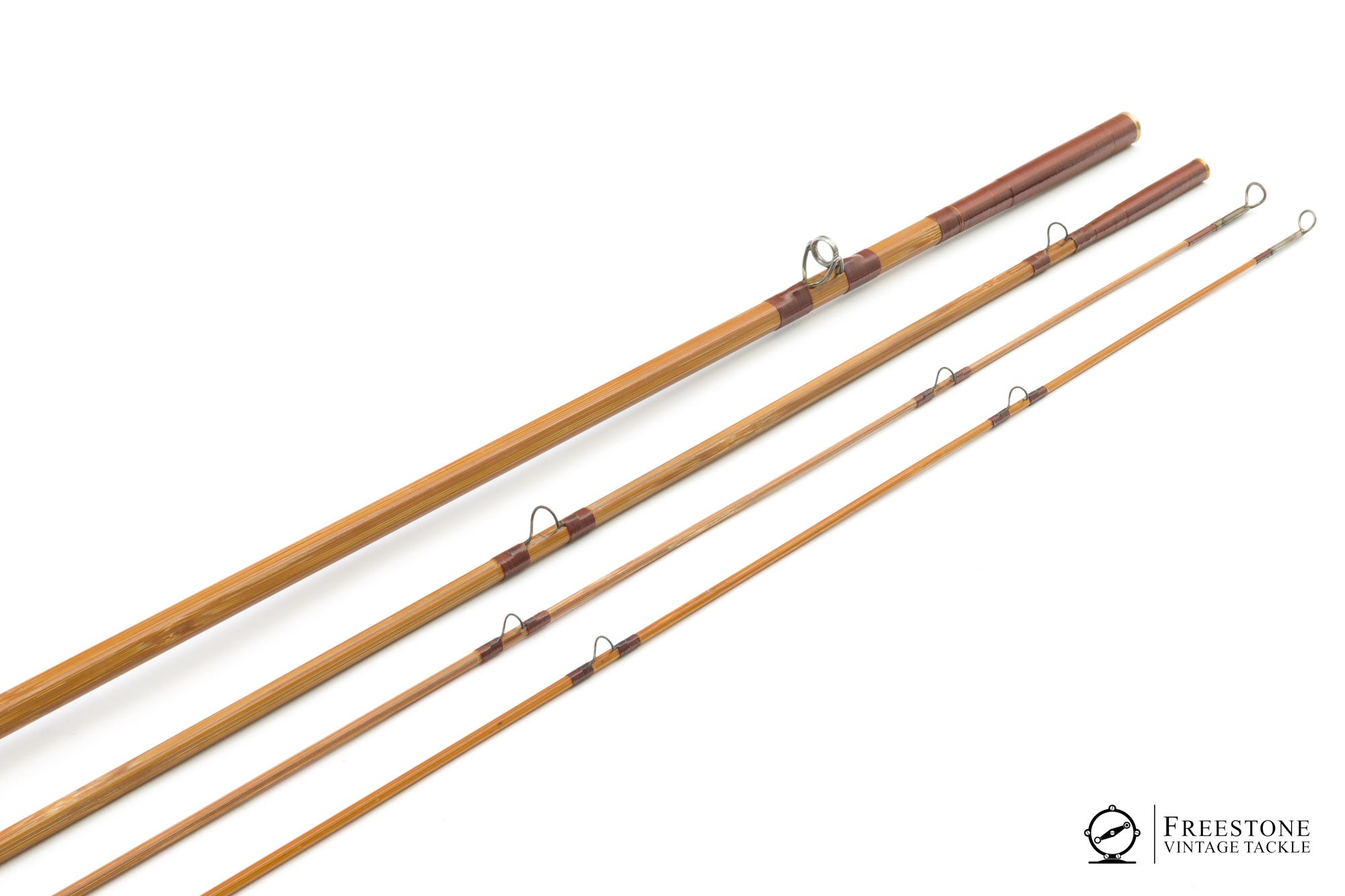 For sale here is a rare 8'6" 3/2 7wt Morris Kushner bamboo rod. Kushner made rods in the Detroit area in the 1960's and after he passed in 1973 his shop was sold to Bob Summers. The butt/mid/one tip are perfect matches in terms of the cane, wraps and finish. The 2nd tip has very similar measurements, but the look of the cane and the wraps is slightly different. Also, the ferrule station is cut ~1/4 higher and you can see this under the wraps. The 2nd tip is a replacement but it's hard to say who made it or when. Chestnut brown wraps with dark guides. Ferrules fit perfectly and the sections are full length with slight sets in both tips. 6.6" grip is smooth with light soiling, and the rod is fitted with a down-locking reel seat over fine wood spacer. The maker's signature graces the butt section near the winding check, although it's a bit faint. Weight is 6.31oz. Medium fast action, I think it's best with a DT7, but some may prefer it with a 6wt. Very few Kushner rods were produced, and people tend to hang on to them. This one packs into a replacement foldover bag and aluminum tube.