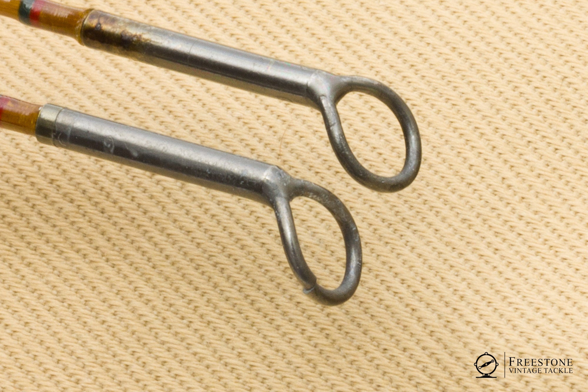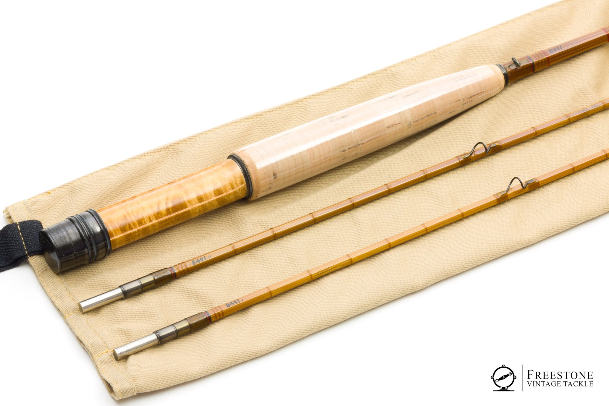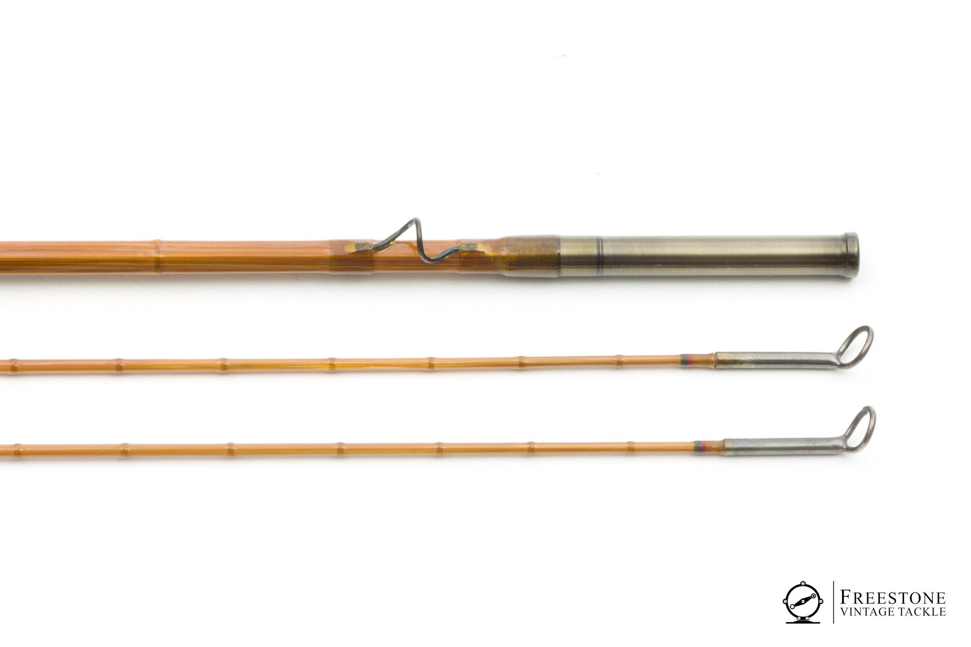 For sale here is an H.L. Leonard Model 38-3 Hunt Special, 7' 2/2 3wt bamboo rod in mint condition. Serial #8491, the rod is unused with the paper still on the grip. The culmination of craftmanship in late-era Leonard rod, this rod has all the deluxe features: blued hardware, full intermediate wraps, red agate stripping guide and decorative windings at the ferrules and hook keeper. Ferrules fit perfectly, and all sections are full length, straight & serialized. Tips are marked for ease of rotation. 5" grip and blued cap & ring reel seat over mortised tiger maple spacer. The bluing is as perfect as the day it left the shop, and the H.L. Leonard roll stamp is crisp and clear on the butt cap. Weight is 2.93oz. Medium, 3wt action. This rod is essentially "new old stock", however I have one condition note: one of the tip tops has a hairline crack in the loop. This should be a straightforward fix, but that decision will be up to the next custodian of this spectacular rod. Glenn Brackett provided a very close match to the tip top, and I will include it in the sale. Sold in the original bag and brass capped tube with H.L. Leonard roll stamp on the collar.
