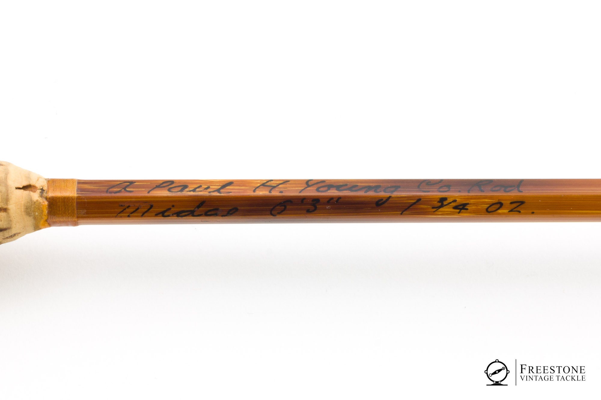 For sale here is a Paul Young Midge, 6'3" 2/2 4wt bamboo rod in very good original condition. Serial #4314, made by Bob Summers in 1966. Medium flamed cane with dark snake guides and carbide stripping guide wrapped in antique gold windings. All sections are straight, full length & serialized. Truncated Super-Z ferrules are blued and the fits are perfect. The butt is inked Bob Summers' hand "A Paul H Young Co. Rod - Midge 6'3" 1 3/4oz". Skeleton grip & reel seat with dual slide bands. The cork is clean with light ridging. The only condition note I have is some of the silk windings are showing their age and most have small cracks in the varnish over the wraps. The guides are snug and the wraps are secure, but a light overcoat wouldn't be out of line. Weight is 2.08oz. Medium fast action with subtle parabolic character that becomes more evident with longer casts. A fine original PHY Midge made by Bob Summers. Sold in the original burnt orange satin bag with brown piping and Champion tube with 30% of the original decal intact.