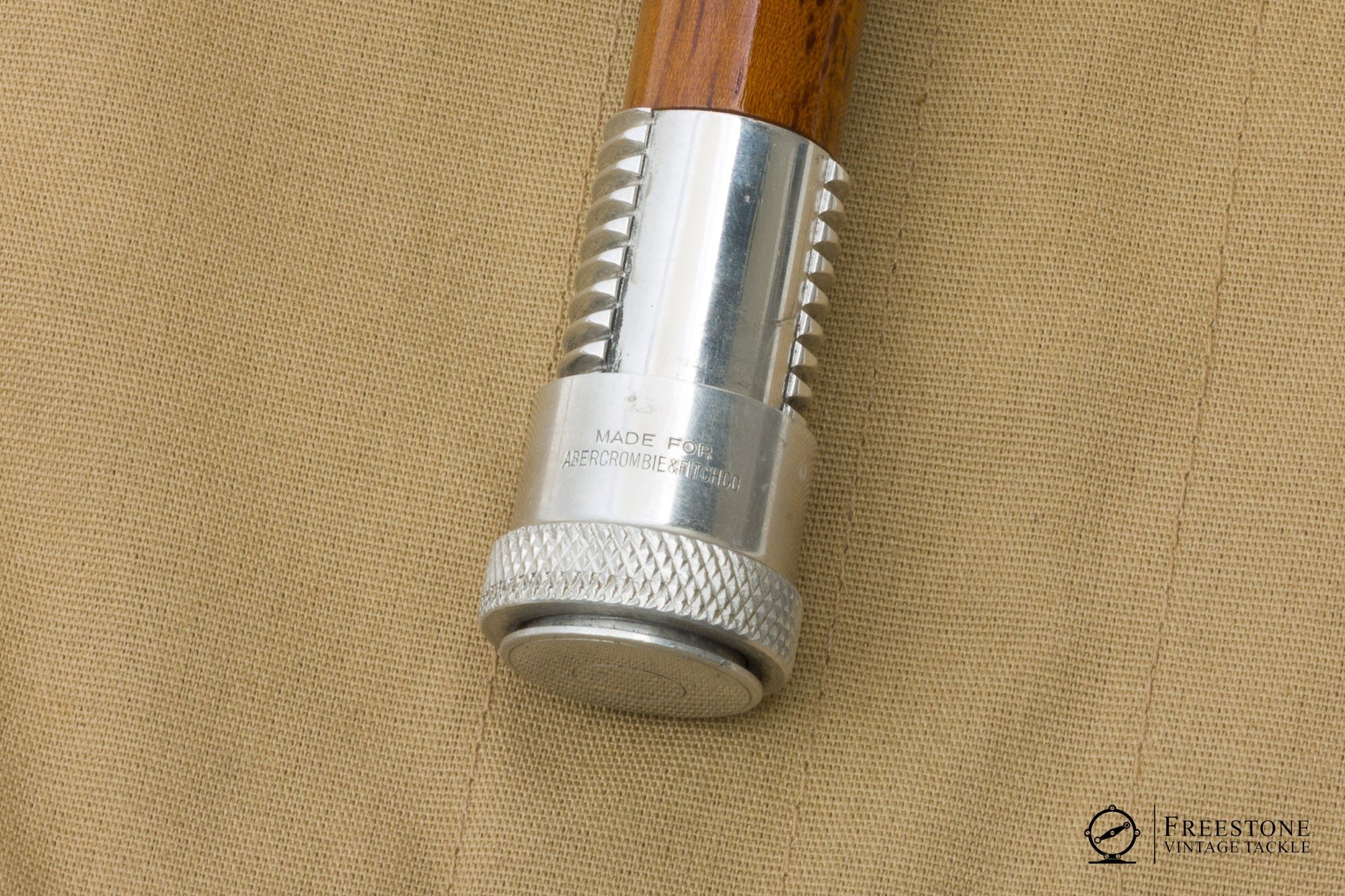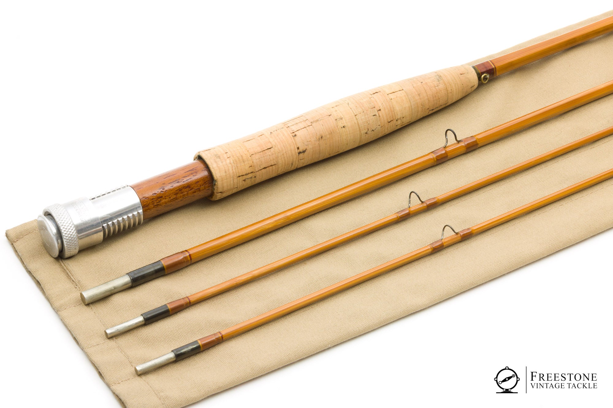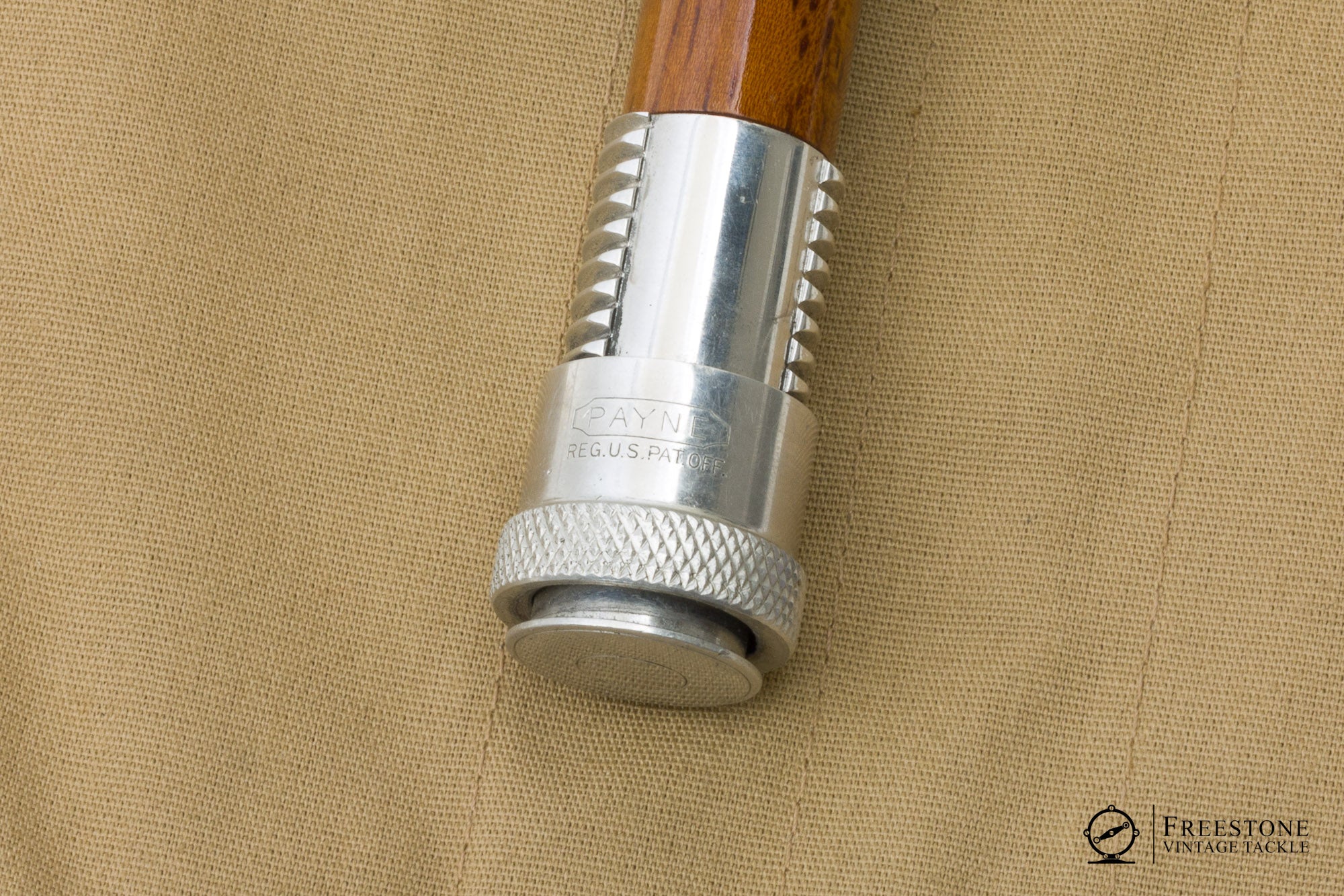 For sale here is an 8' 3/2 5wt Payne bamboo rod in excellent restored condition. Medium tempered cane with dark guides wrapped in light brown windings & gold tipping. Blued ferrules fit perfectly. All sections are full length, and both tips have light sets. Strap & ring hook keeper (the keeper wraps may be original), 6" grip (smooth with light soiling), and the standard up-locking Payne reel seat over Spanish cedar spacer. The screw collar bears the Payne roll stamp and "Made for Abercrombie & Fitch" on the reverse. Weight is 4.41oz. No hang tag, but this is probably a model 201. Medium 5wt action. The restoration work is nice, and the rod shows minor signs of use since then. Sold in a replacement bag and tube.