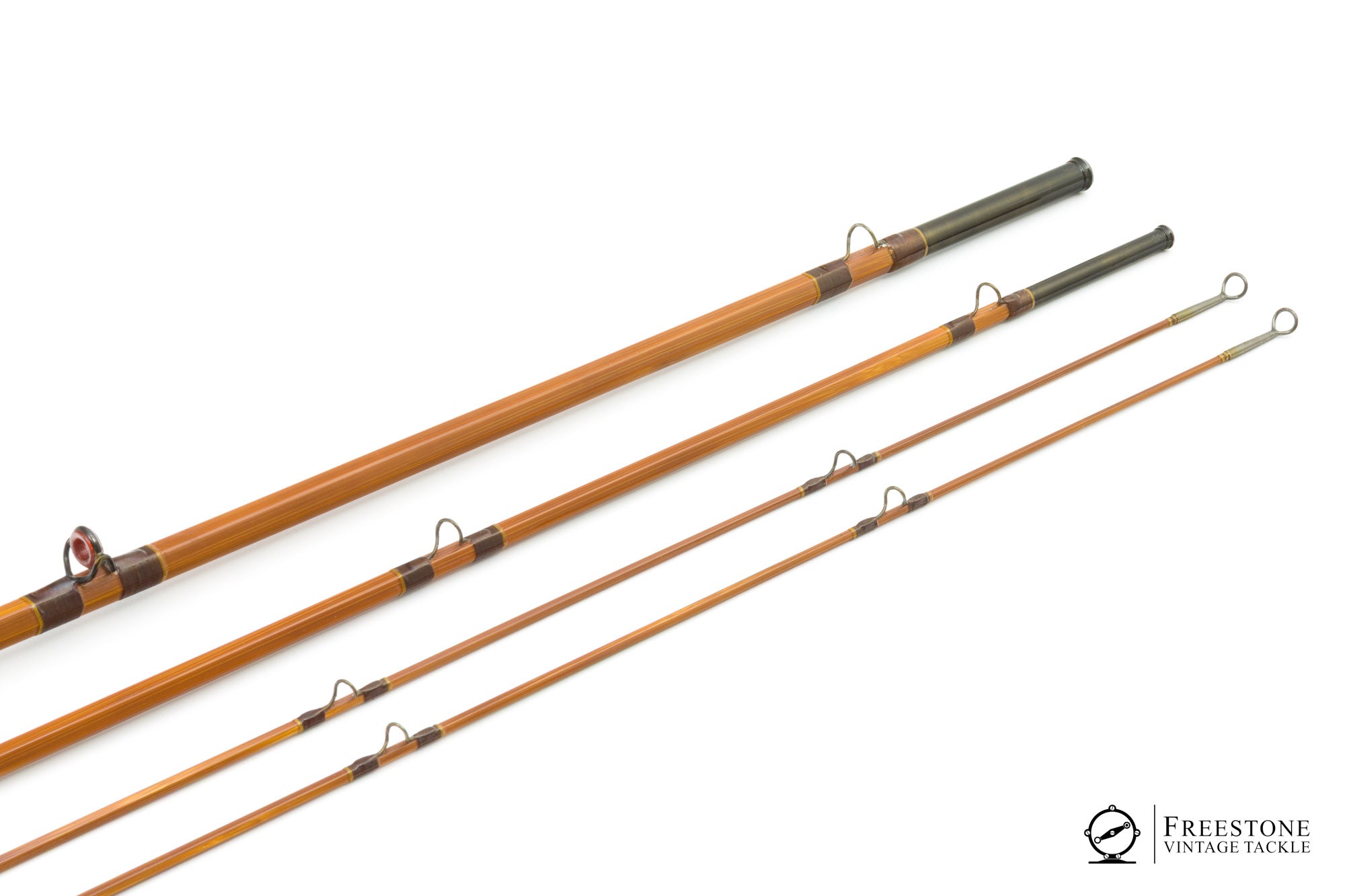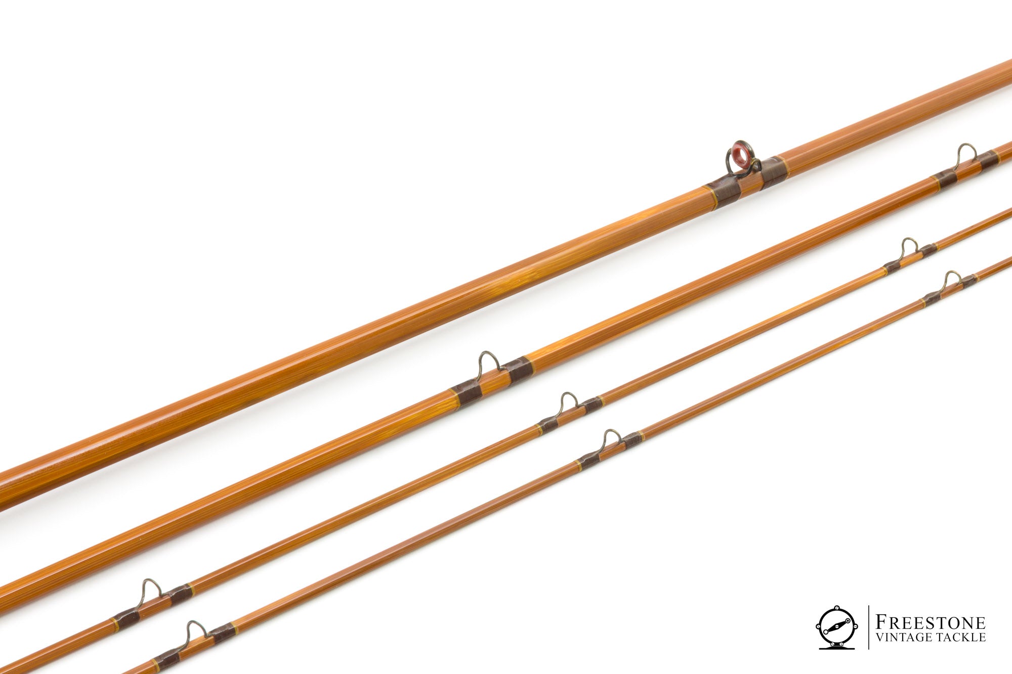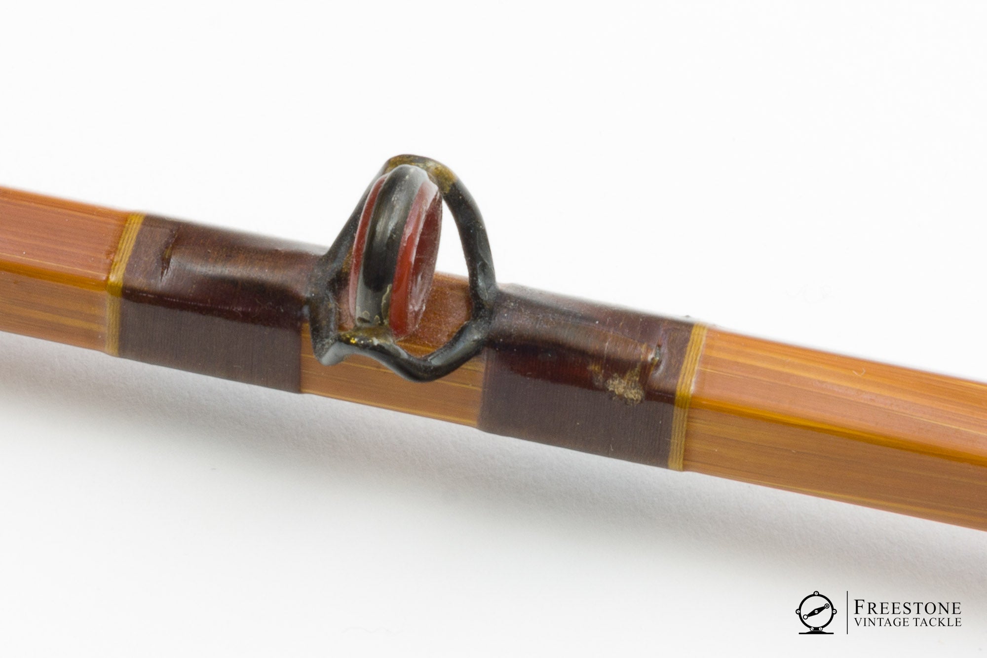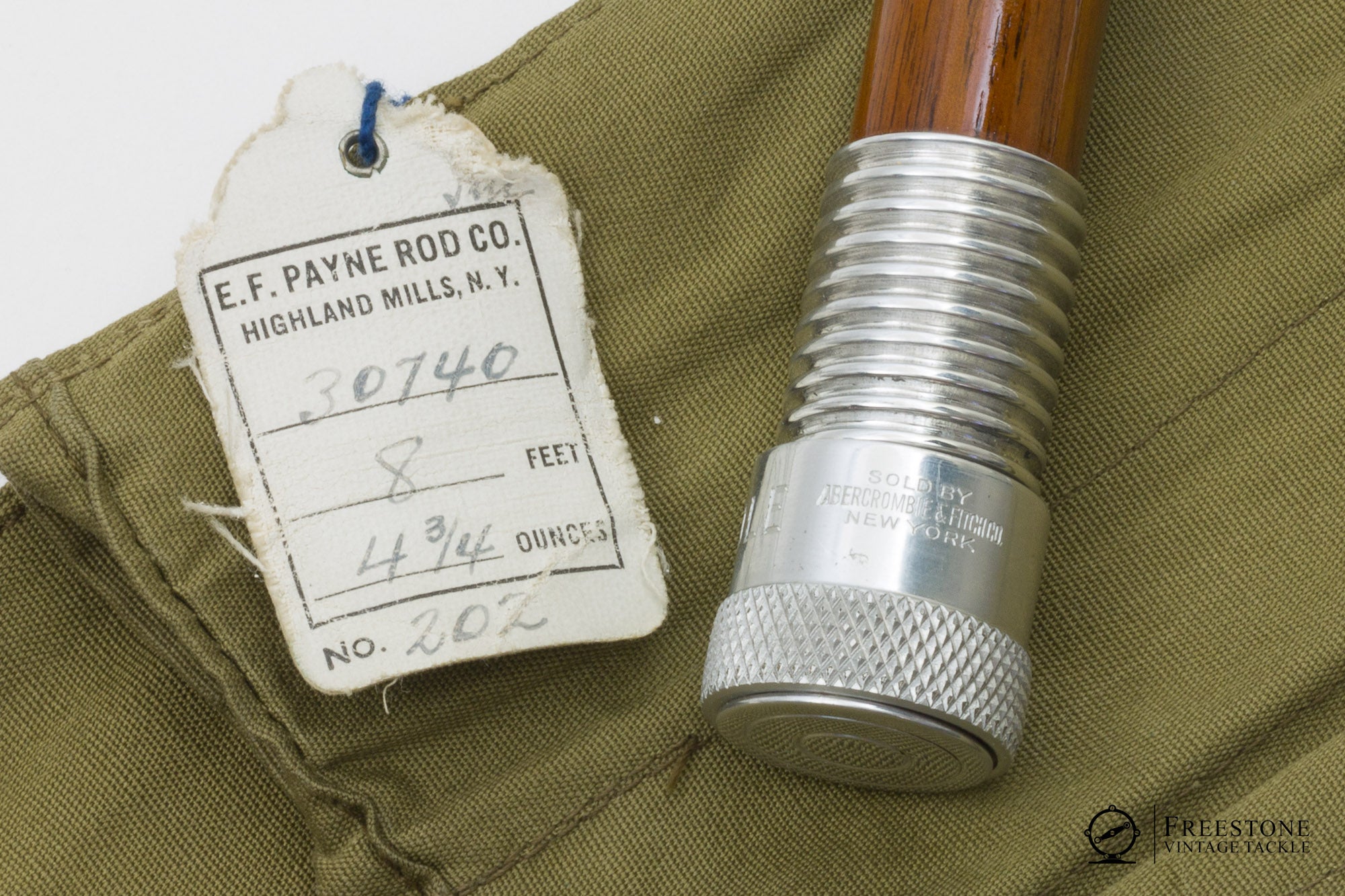 For sale here is a spectacular Payne 202 in excellent+ original condition. 8' 3-piece / 2-tip, crisp medium fast action, best with a 5 or 6wt line. Deeply toned cane with chestnut brown wraps and gold tipping, dark snake guides and red agate stripping guide. The varnish and ferrule bluing are superb. Ferrules fit perfectly and all sections are full length & straight. Strap & ring hook keeper, 6" cork grip (smooth with light soiling), and up-locking reel seat over Spanish cedar spacer. The screw collar has the Payne logo on one side, "Sold by Abercrombie & Fitch" on the opposite, and the name "COLE" jeweler engraved between the stamps. Scripted and actual weight is 4 3/4oz. I have only two condition notes: the windings closest to the butt ferrule have 2 or 3 broken threads right at the guide foot, and there is a small varnish chip on the stripping guide windings. The next owner may wish to apply a bit of stabilizing varnish. Otherwise, this is an excellent original example of the desirable 202 taper. Sold in the original bag with hangtag and brass capped tube with 95% red A&F label.