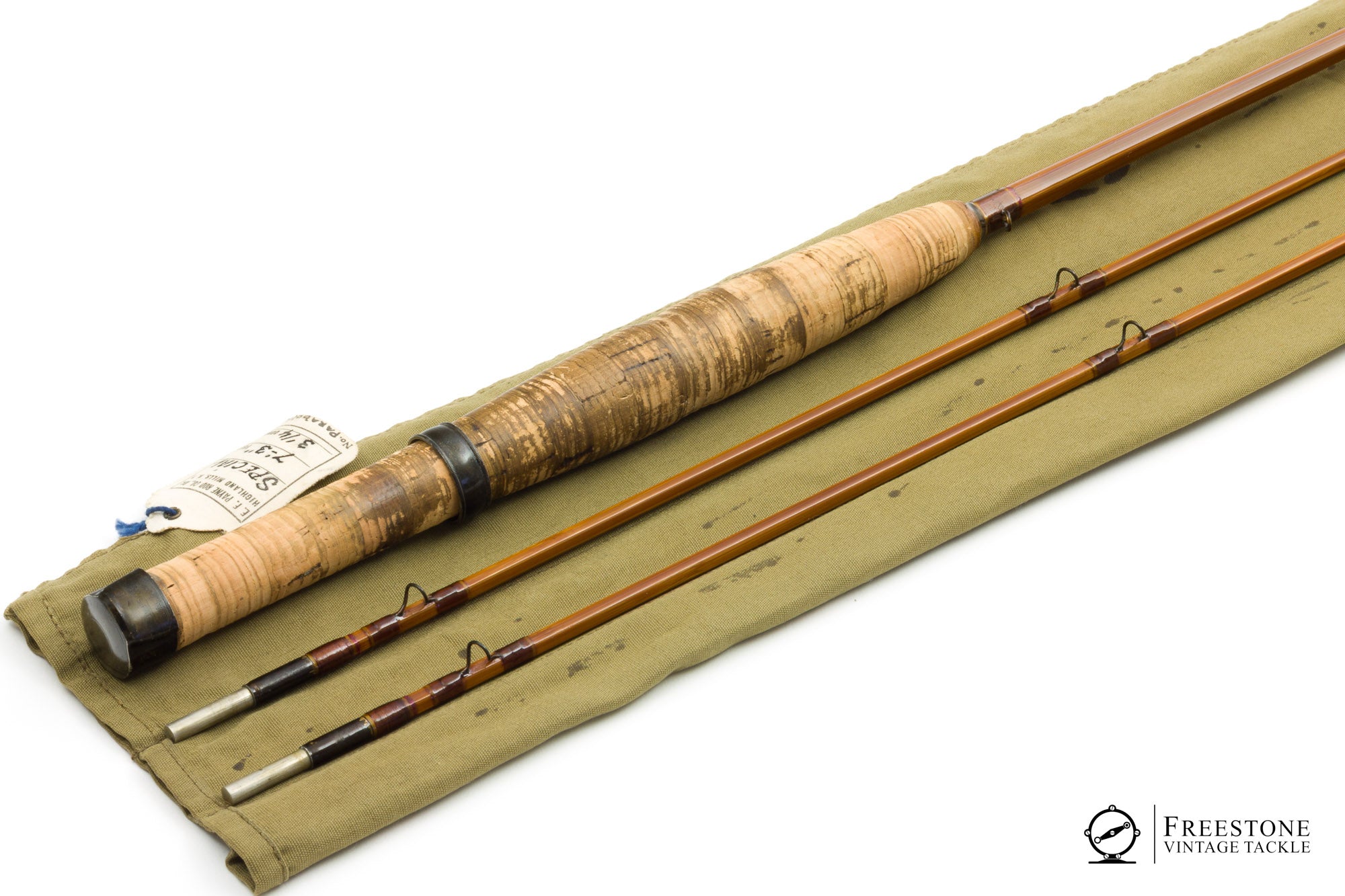 For sale here is an unusual 7'3" 2/2 5wt Payne rod. The hang tag indicates a "Special Parabolic" 7'3" rod, although on close examination I suspect the rod may have started as a 7'6" or 7'9" Parabolic and was cut down (a 7’3” Payne Parabolic is not a cataloged model). The rod is completely re-wrapped and the ferrules were reset. There is a 1.2" invisible wrap between the top snake guide and the butt ferrule, and a slightly tinted varnish was used to finish the rod. The varnish is in nice shape, and the ferrule bluing remains quite dark. 11.5/64 ferrules fit perfectly and the female has an aftermarket plug. The sections are straight and of equal length. Dark snake guides, white agate stripping guide and strap & ring hook keeper. All cork grip & reel seat with blued cap & ring hardware. The cork is soiled and ridged, and the Payne stamping can be seen on the pocketed butt cap. Weight is 3 1/4oz, which matches the hang tag. The action is interesting; it feels a bit more parabolic than most of the Payne Parabolic rods I've cast. It's hard to determine the whole story on this unusual rod, but it appears to be a Payne and feels like it will be a fun rod to take fishing. Sold in an original Payne tube with partial label affixed, and what appears to be an original Payne rod bag.