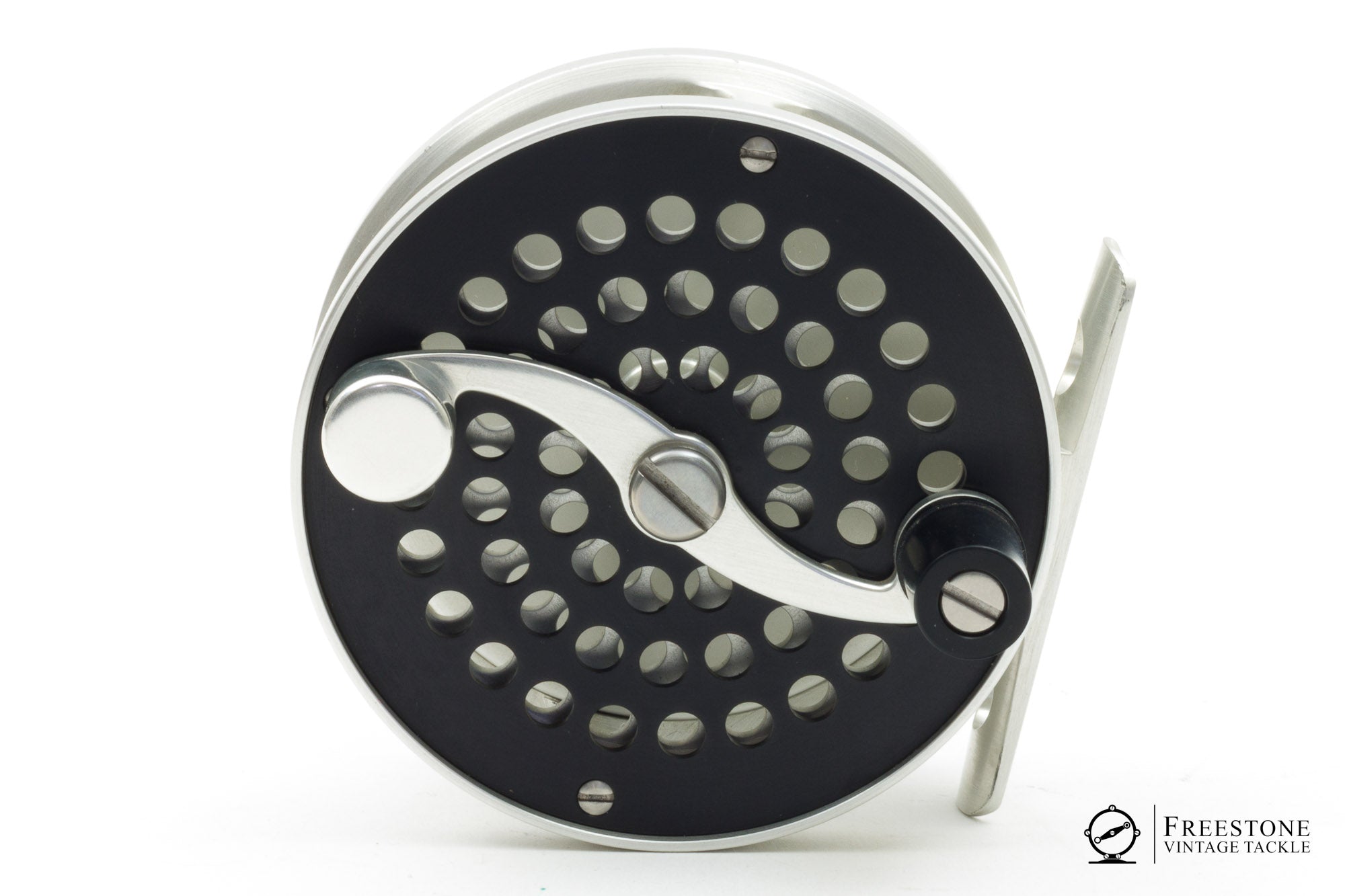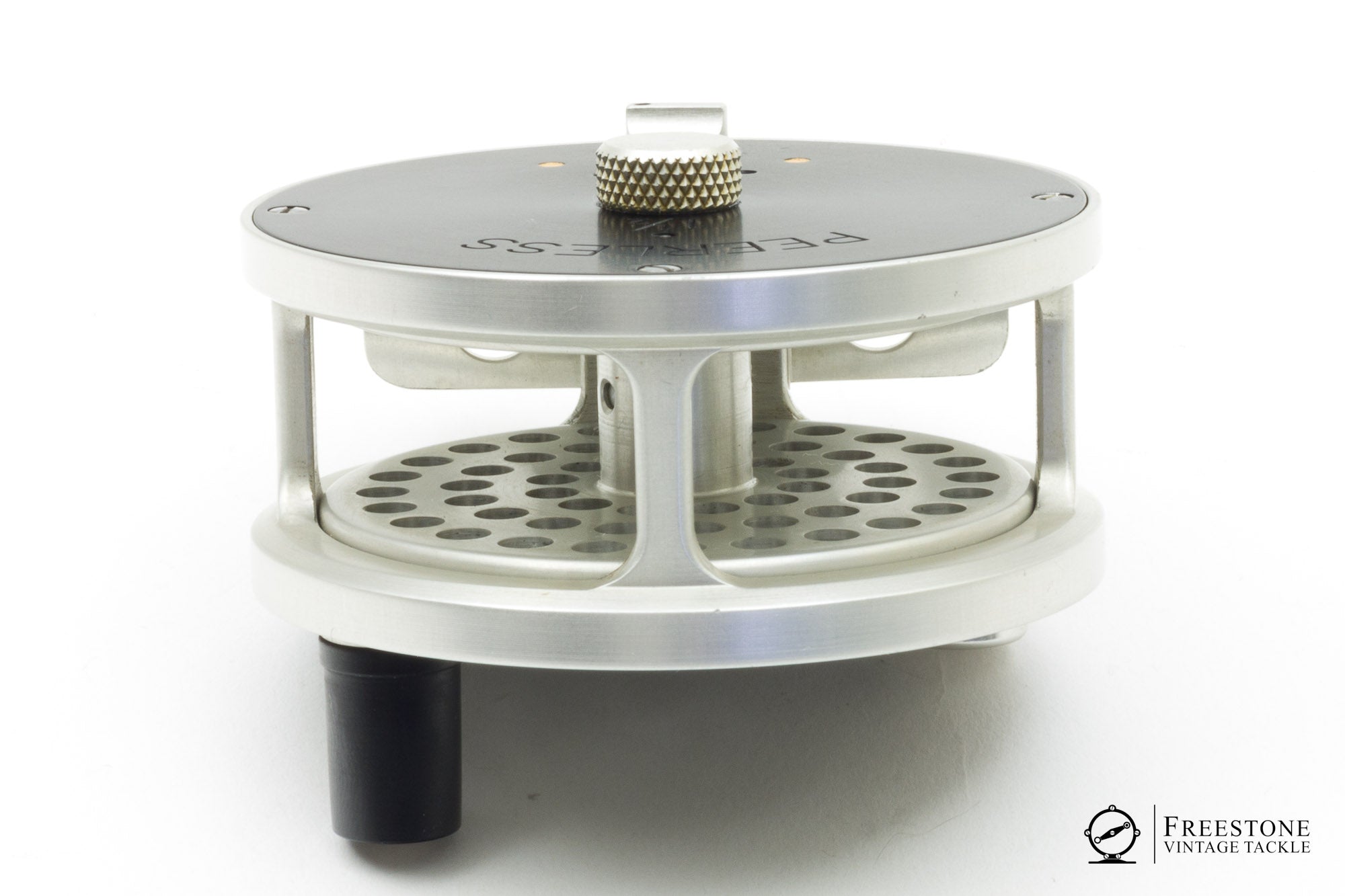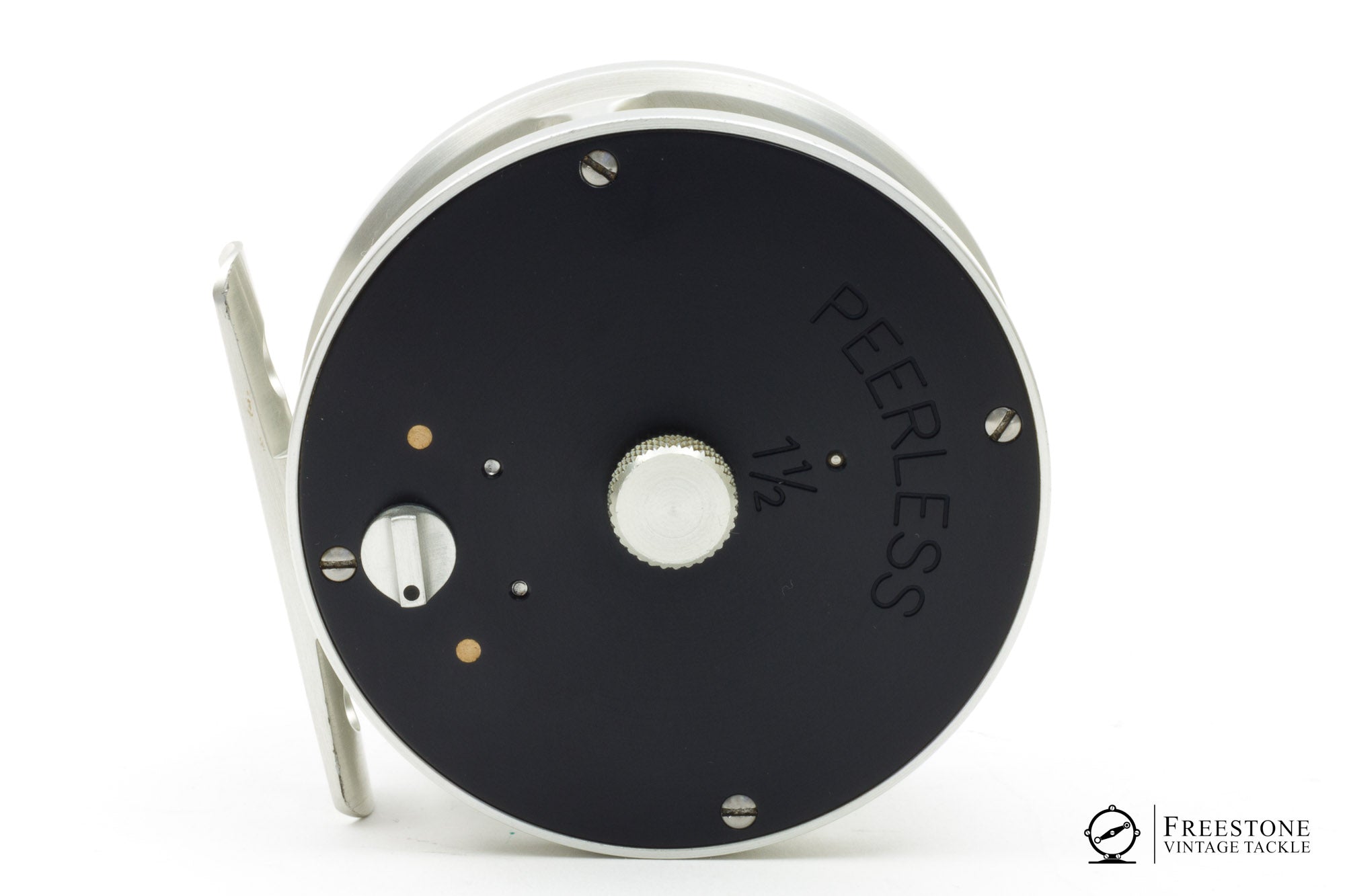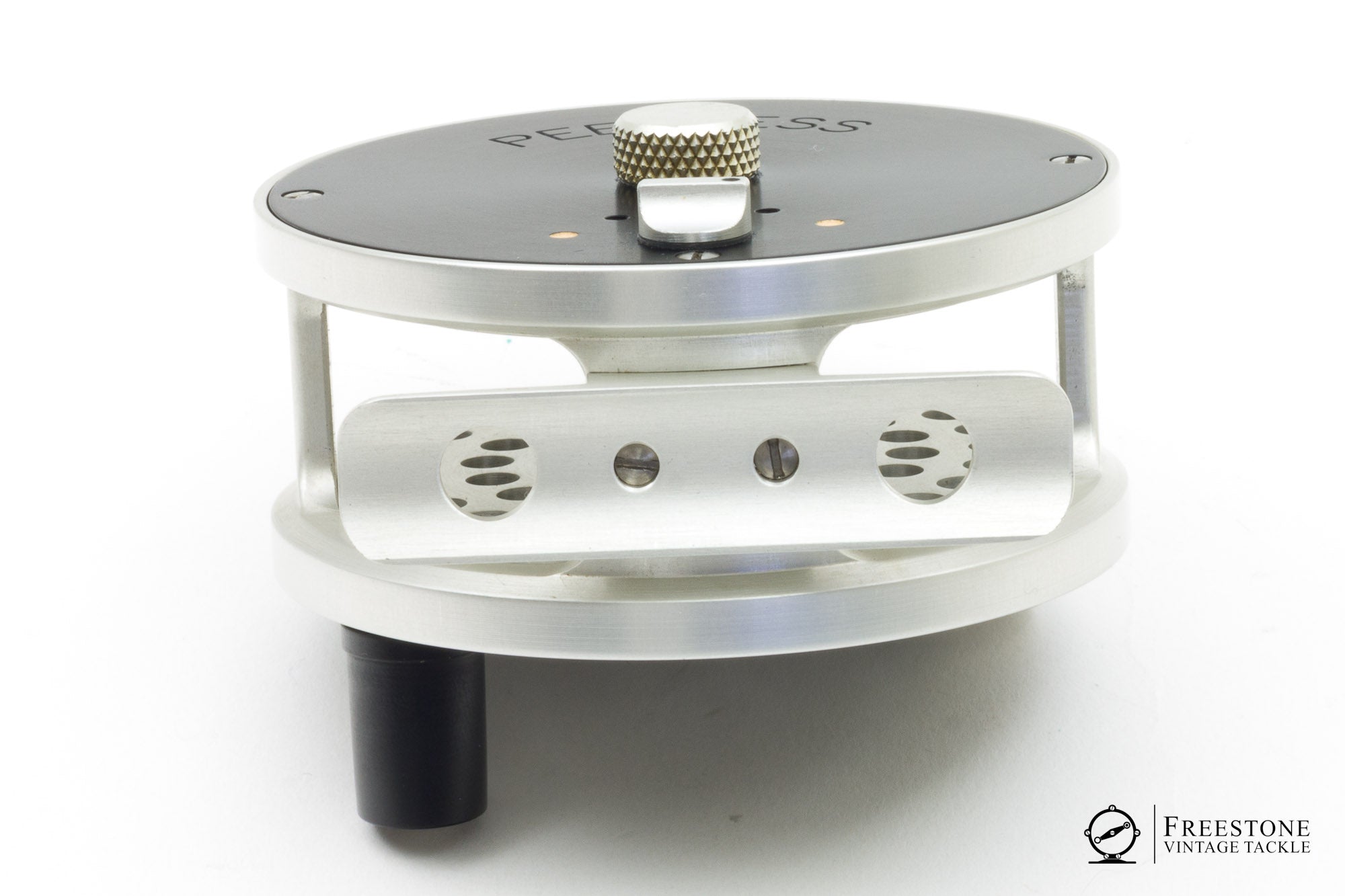 For sale here is a Peerless No. 1 1/2 fly reel in excellent used condition. 1 5/32" wide with a diameter of 3". A great 4/5wt reel. The 1 1/2 features ported handle plate and spool with counterbalanced serpentine handle and ventilated reel foot. Mechanically perfect with strong adjustable drag. Set up for RHW but converts to LHW without too much trouble. Light handling marks to the rims and reel foot. Peerless reels remain very popular and pair well with both classic and contemporary rods. Sold in the original leather case.
