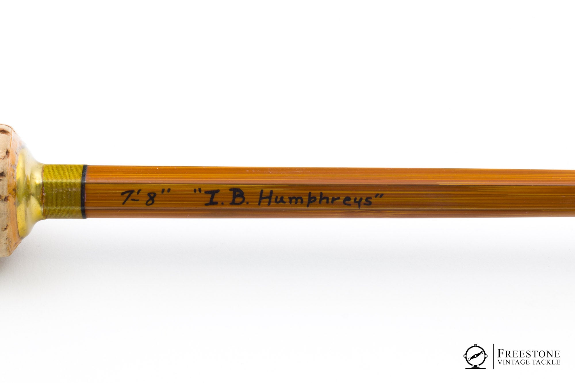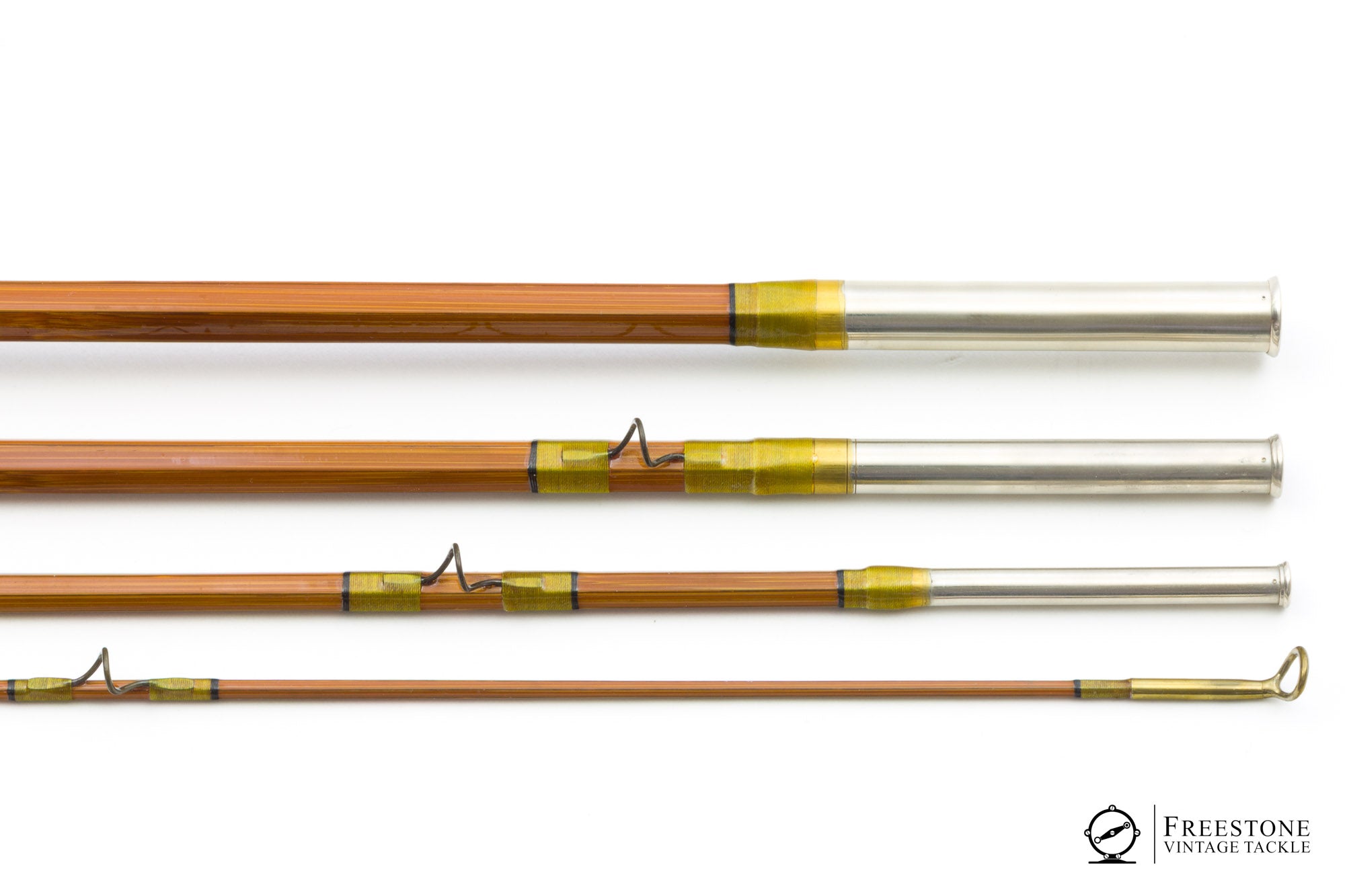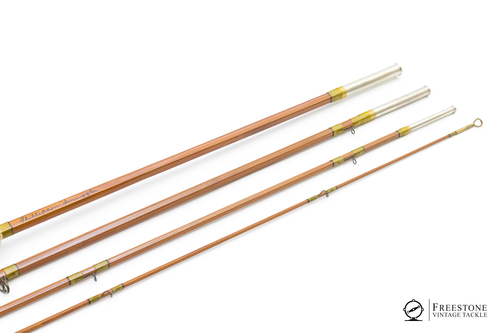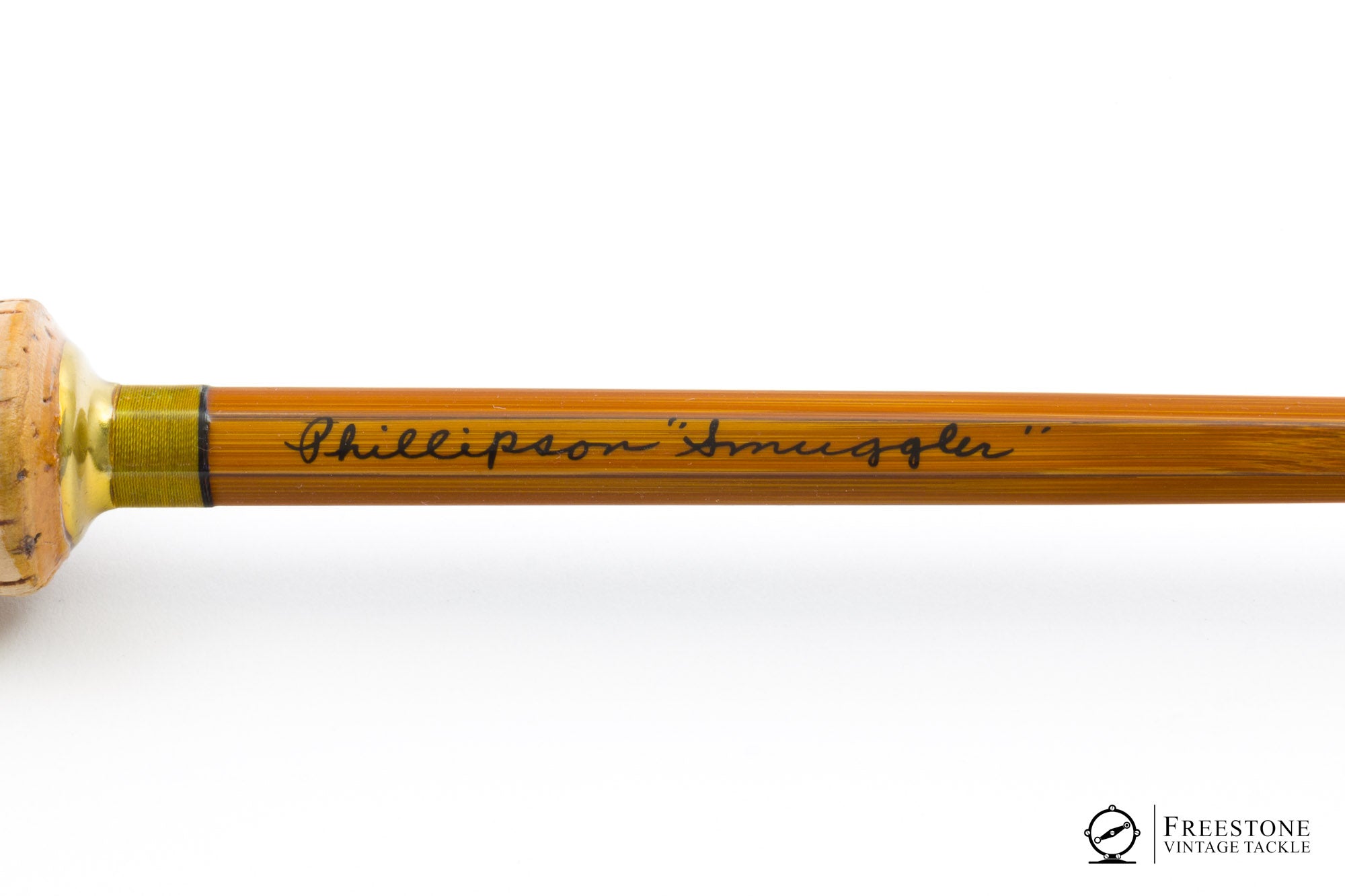 For sale here is a scarce Phillipson Smuggler 7'8" 4-piece / single tip bamboo rod in excellent original condition. Introduced in 1952 and dropped by the time the 1953 catalog was released, the Smuggler was a short-lived model and only made in the 7'8", 4 3/4oz configuration. Featuring ammoniated cane and green nylon windings with black tipping. Ferrules fit perfectly and all sections are full length & straight. Script on the butt is bold and clear and includes the original owner's name. Cork grip is clean and smooth, and the rod is fitted with a hunter green anodized reel seat with black hardware. The green anodizing has 1 small imperfection, but the rod looks almost unused. Advertised and actual weight is 4 3/4oz. Designed as the ultimate travel/pack rod, the overall length of the tube is 24.5". Action on the faster side of medium fast, a solid 6wt. A very fine example of a scarce model. Sold in the original bag and aluminum tube with blue & white decal.