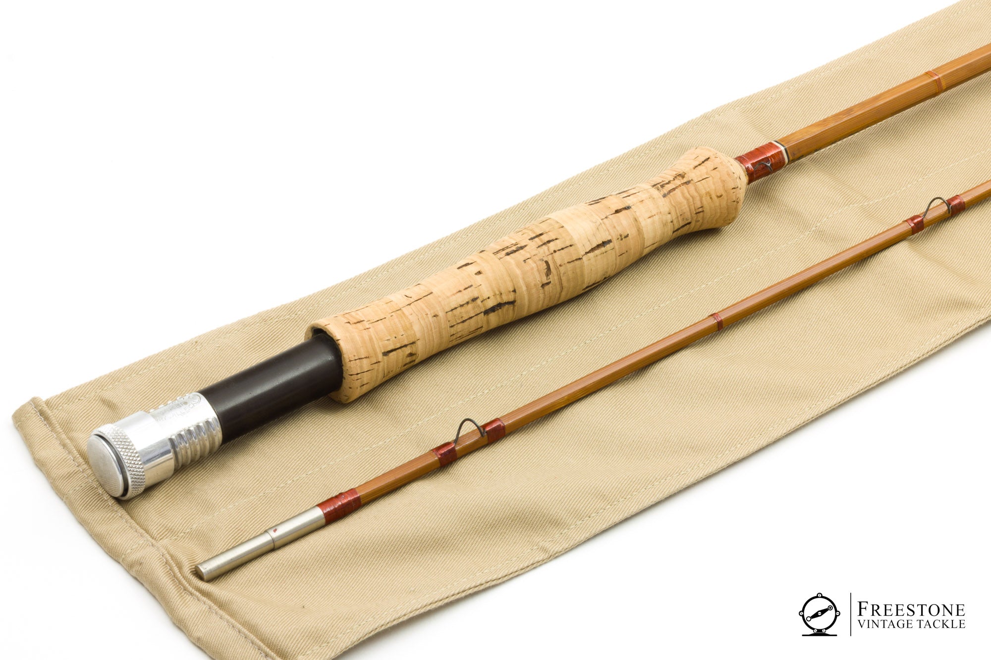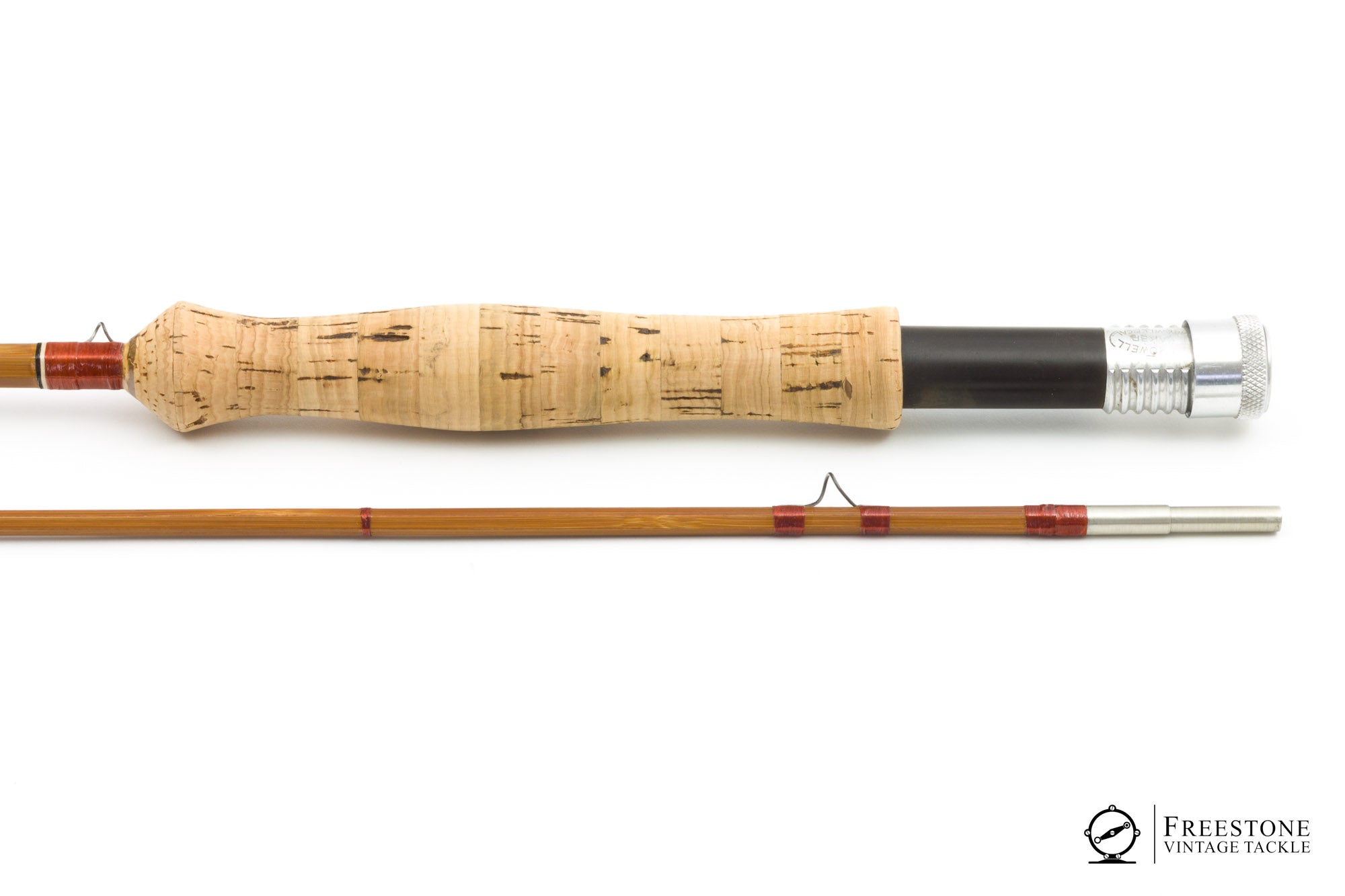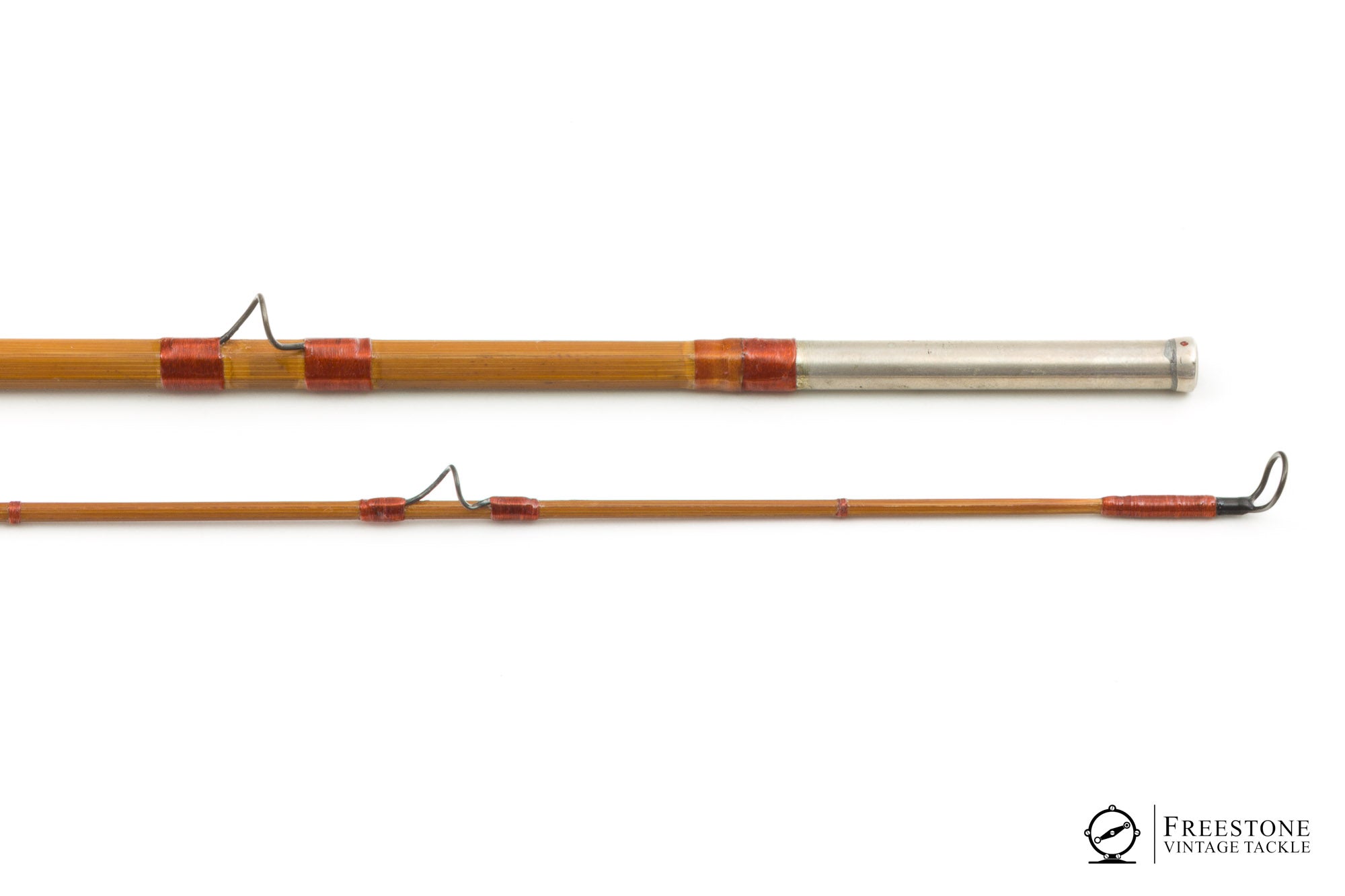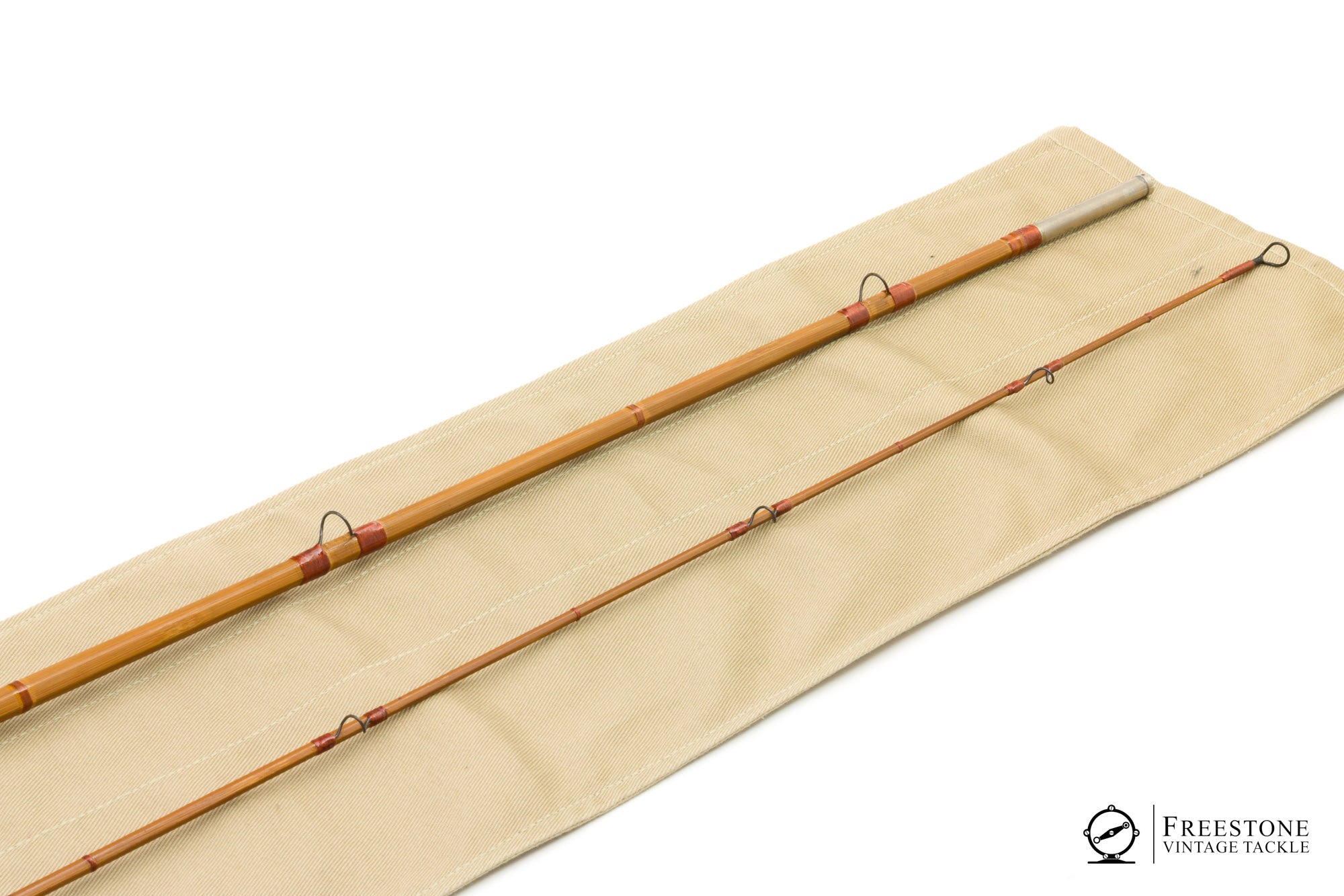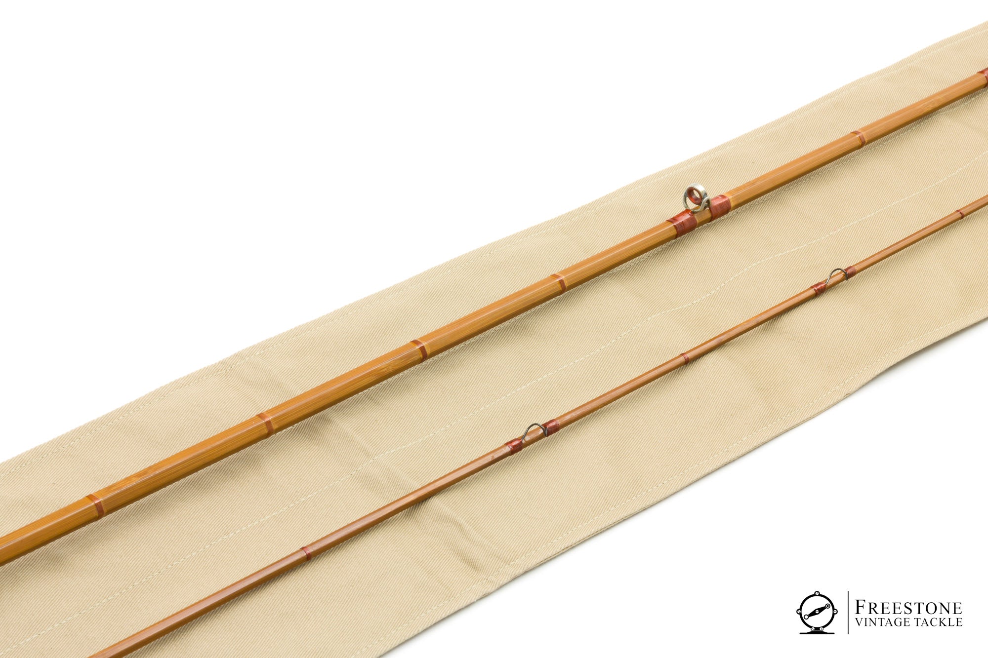 For sale here is an E.C. Powell 8'6" 2-piece / 1-tip bamboo rod in good, refinished condition. Completely rewrapped, although some of the intermediates on the butt section may be original. Bright ferrule fit perfectly, and the sections are full length. The tip has a slight fish fighting set. The patent script is rewritten, and the hook keeper (small snake guide) has the black & white bands indicating a semi-hollow rod. 6.5" grip is smooth with light soiling, and the rod is fitted with the standard Powell reel seat. Weight is 4 1/8oz. Action on the medium side of medium fast, it feels like a B-taper. The wraps are a few shades too red to be confused as original, but it's a very fishable 8'6" Powell. Sold in a replacement bag and tube.