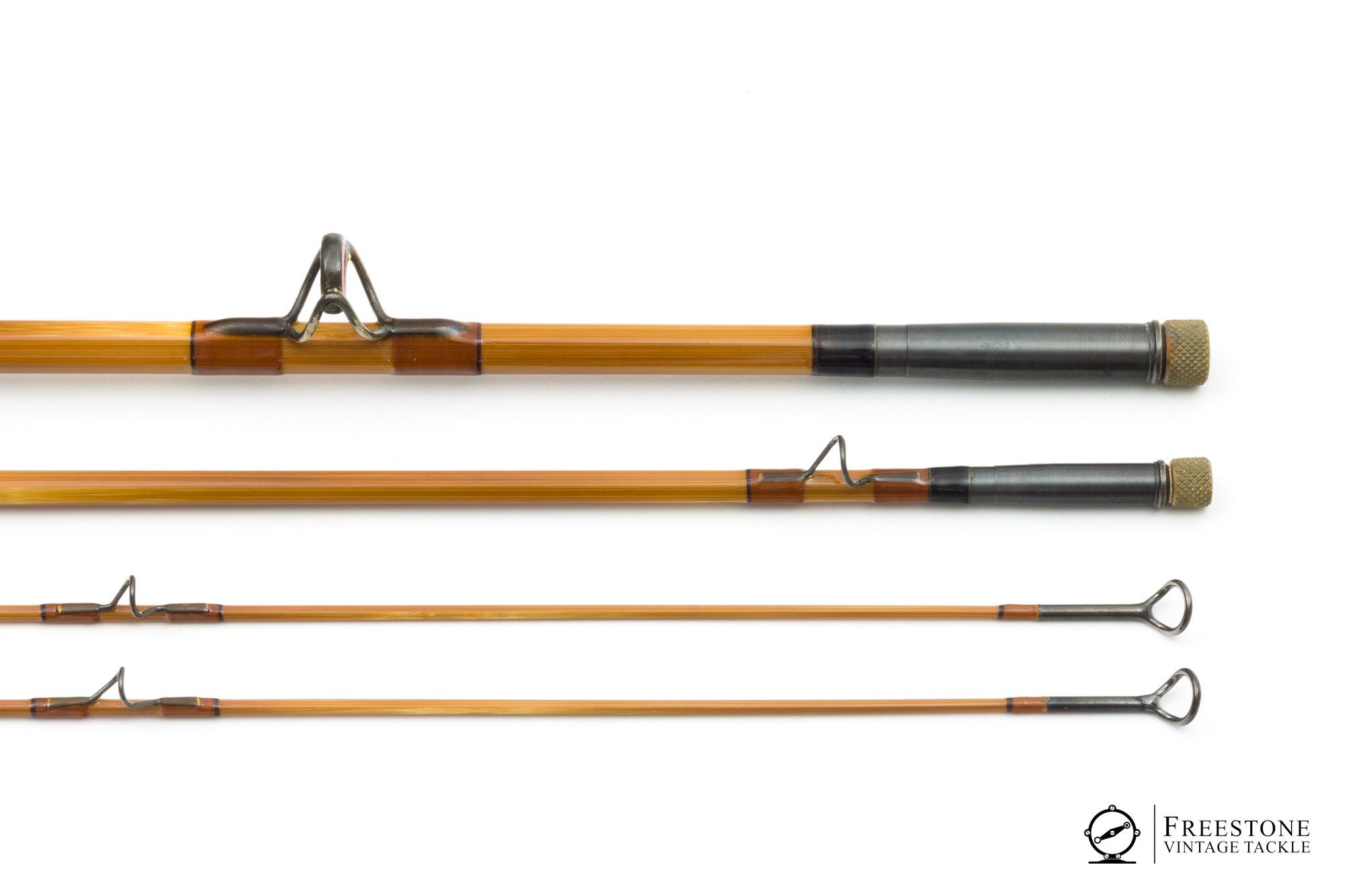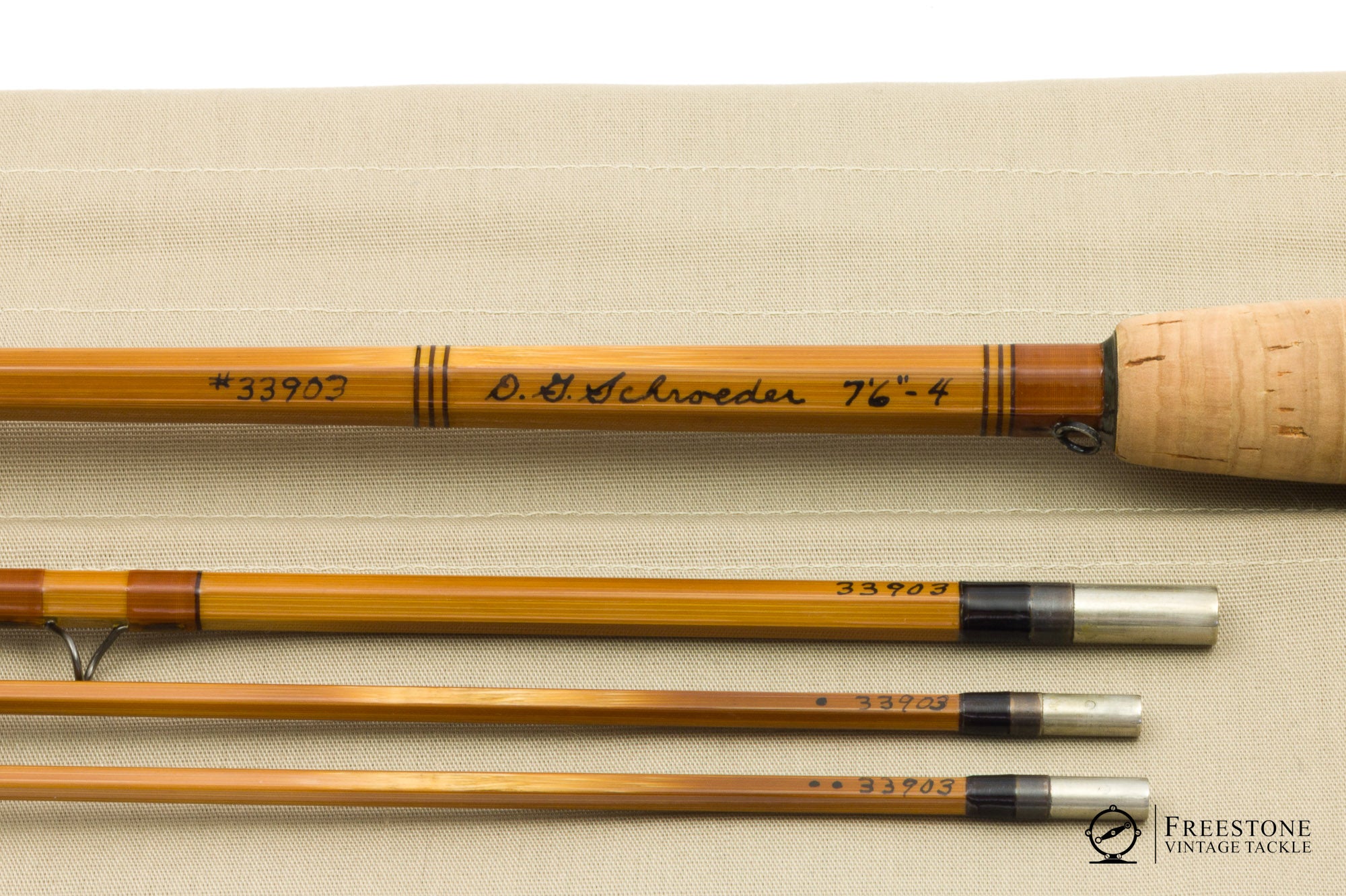 For sale here is a Don Schroeder 7'6" 3/2 4wt bamboo rod in excellent used condition. Medium flamed cane, dark guides and red agate stripper. Cinnamon colored wraps with dark brown accents. All sections are straight, full length & serialized (#33903). Blued Swiss-style ferrules fit perfectly, and the females are fitted with brass and cork ferrule plugs. 6" cork grip is smooth with light soiling, and the rod is fitted with a blued cap & ring reel seat over dark wood spacer. The bluing is in good shape and the butt cap retains the maker’s stamp. Weight is 3.94oz. Crisp, medium fast action, a fine 4wt taper. Sold in the original bag and brass capped tube with Don's silver label affixed. The tube collar is split but has been neatly reglued.