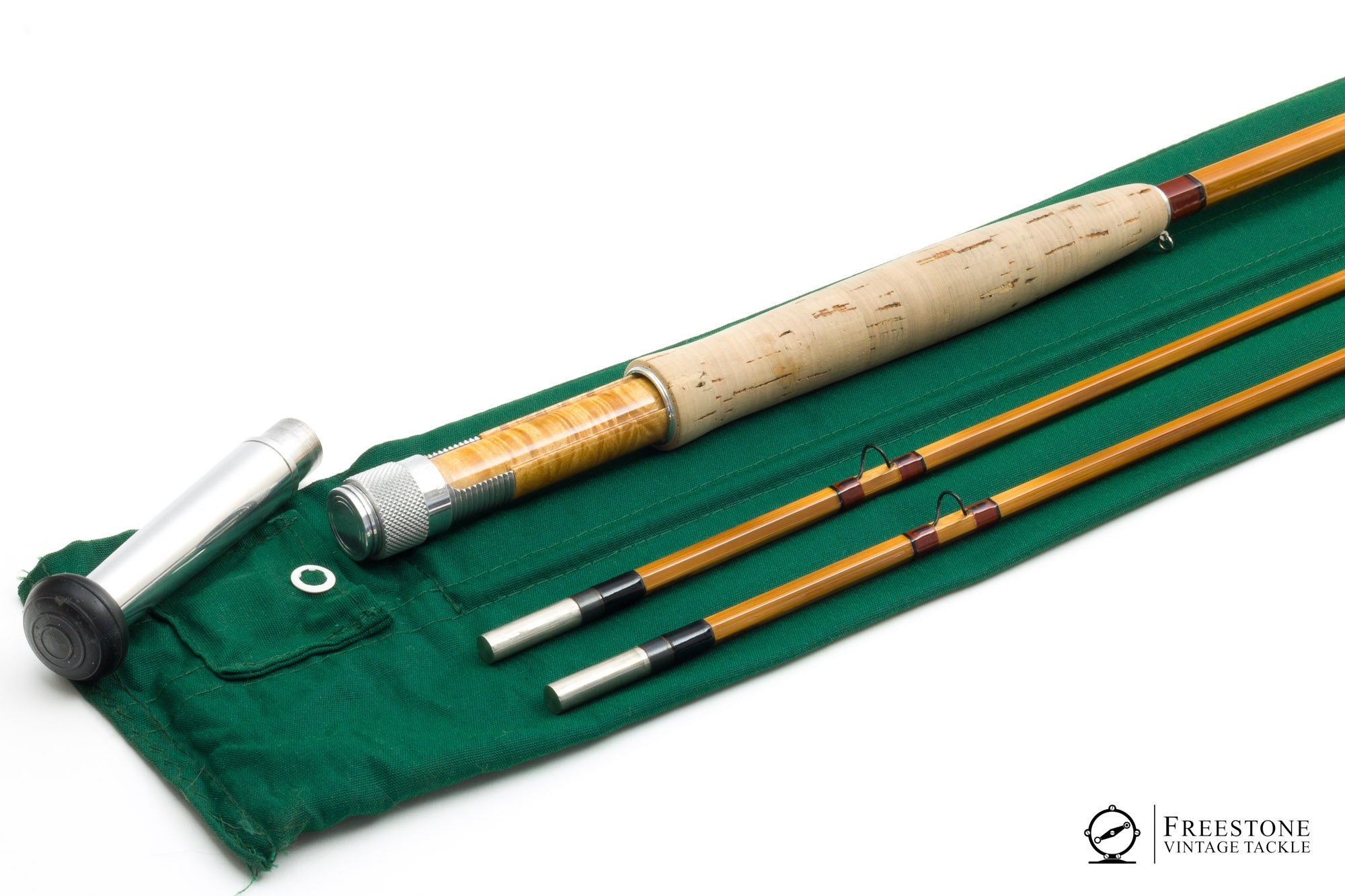 For sale here is a Don Schroeder 8'6" 2/2 8wt salmon rod in excellent used condition. Medium tempered cane with dark guides and brown windings with black tipping. Blued ferrules fit perfectly, and all sections are full length and serialized (#9694). Both tips have slight fish fighting sets, but I would characterize them as minor. Nickel silver winding check with integrated hook keeper ring. 7" cork grip is smooth with light soiling, and the rod is fitted with an up-locking aluminum reel seat over tiger maple spacer. The screw collar reads "D.G. Schroeder Rod Co.". 3.5" fighting butt is removable and a bottom pocket in the rod bag contains an aluminum plug for use without the fighting butt. Weight is 7.67oz with the fighting butt and just over 6oz without. Medium fast action, the rod feels nimble but quite strong. A nice option for heavier lines & shooting heads. Sold in the original bag and tube with maker's card affixed.