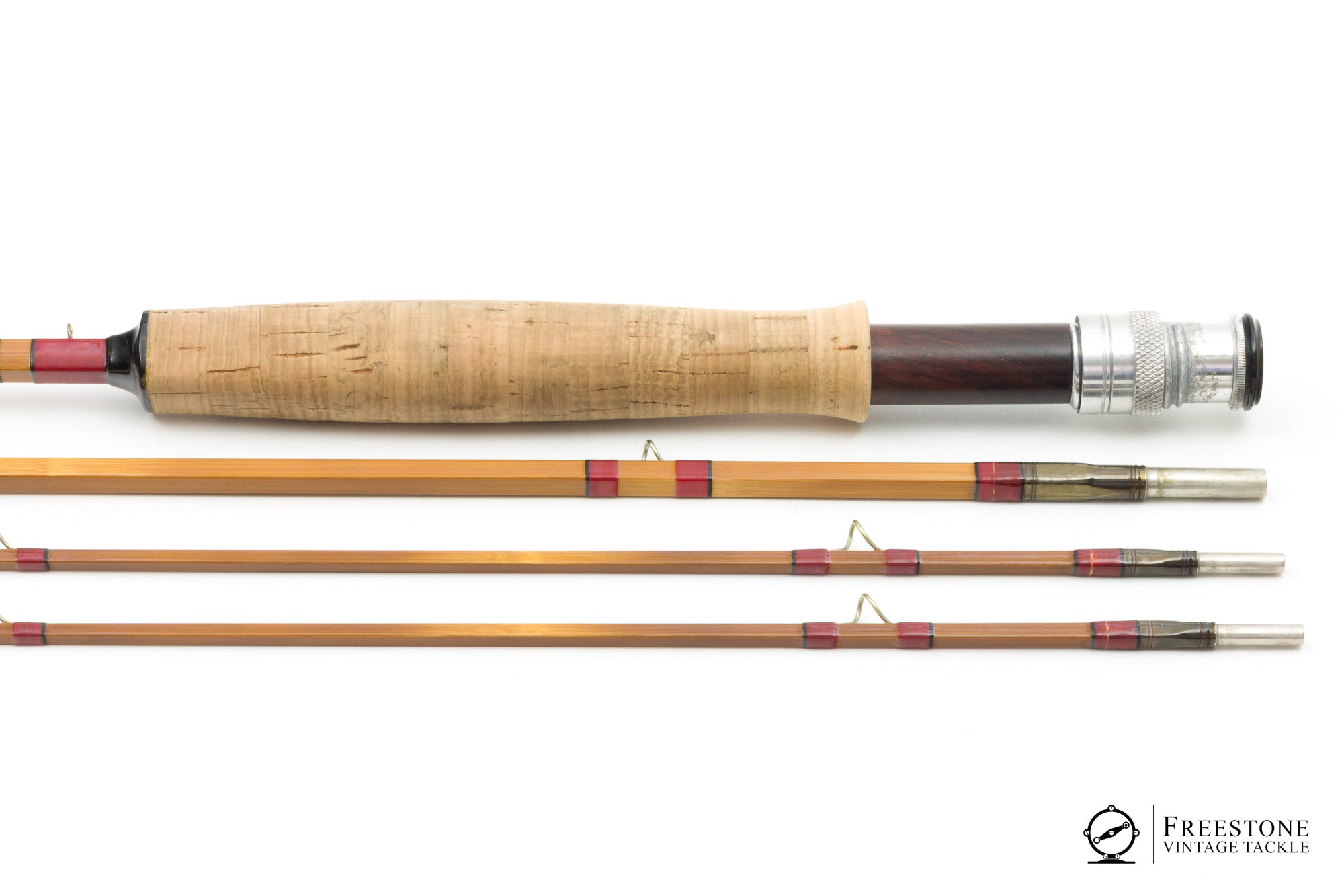 For sale here is an 8' 3/2 5wt hollow built quad bamboo rod from the bench of Mike Spittler. Excellent used condition, serial #395. Medium flamed cane with bright snake guides and carbide stripping guide. Wraps are crimson red with black tipping. The wraps at the ferrules have light cracks in the varnish; purely cosmetic. All sections are full length and free of repairs, and both tips have slight fish fighting sets. Ferrules fit perfectly with small gaps to allow for wear (made this way), and the females are fitted with turned aluminum & cork ferrule plugs. 6" cork grip is smooth with light soiling, and the rod is fitted with an aluminum up-locking reel seat over dark wood spacer. Black composite butt cap with matching squared winding check below the hook keeper. Weight is 5.11oz. Smooth, medium fast action, best with a DT5. Mr. Spittler is known for his fantastic quad rods, and this is a very nice example of his work. Sold in the original bag and tube.