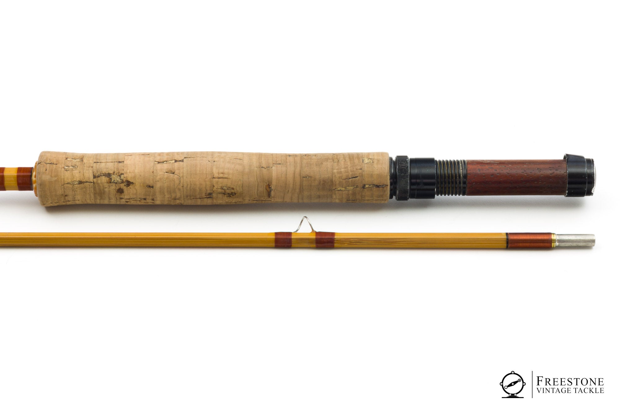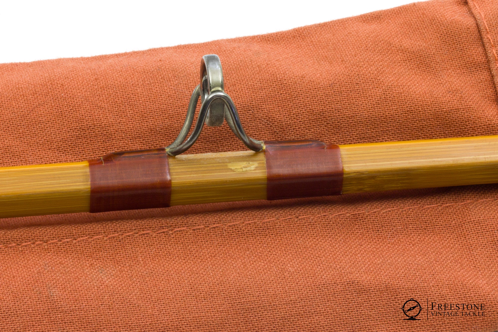 For sale here is a Sweetgrass Mantra, 8'6" single tip 7wt bamboo rod. A well-loved rod that shows signs of honest use but remains quite serviceable. The varnish has some scratches/scuffs and there is one small ding under the stripping guide, but all appears to be cosmetic. Medium toned cane with bright snake guides and transparent brown windings. The bottom snake guide on the tip looks like it was rewrapped. Ferrules fit perfectly and the sections are full length & serialized (#11-013). The tip has a slight droop in the last 18". 6" grip is soiled but smooth, and the rod is fitted with a down-locking reel seat over dark wood spacer. Weight is 4.69oz. Action is medium fast with a strong tip. If you're looking for a split cane rod to fish big stoneflies or hoppers out of a drift boat, this is the one! Sold in the original bag and tube.