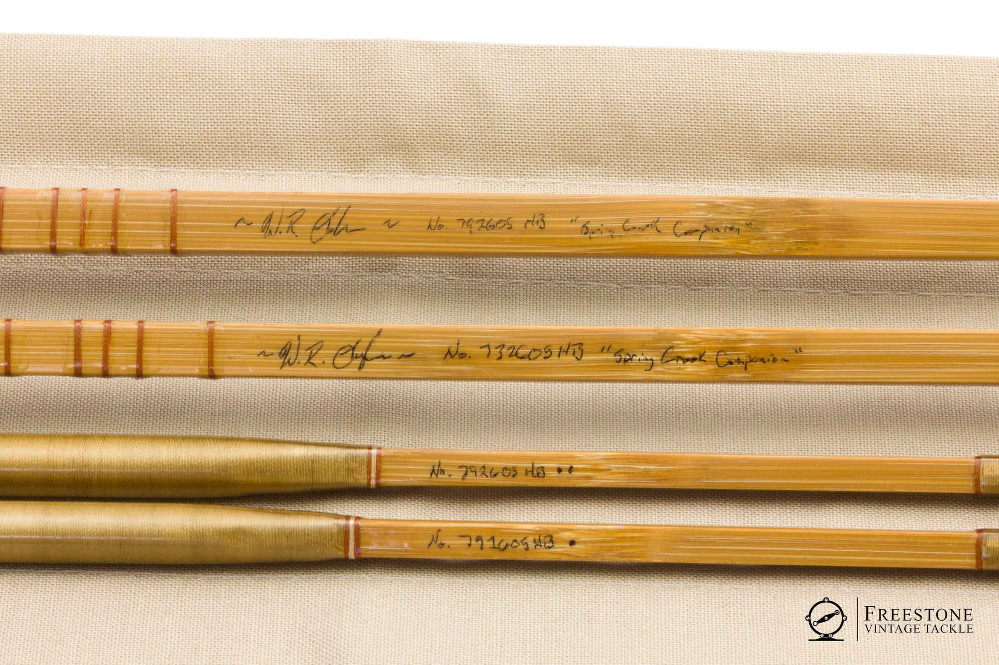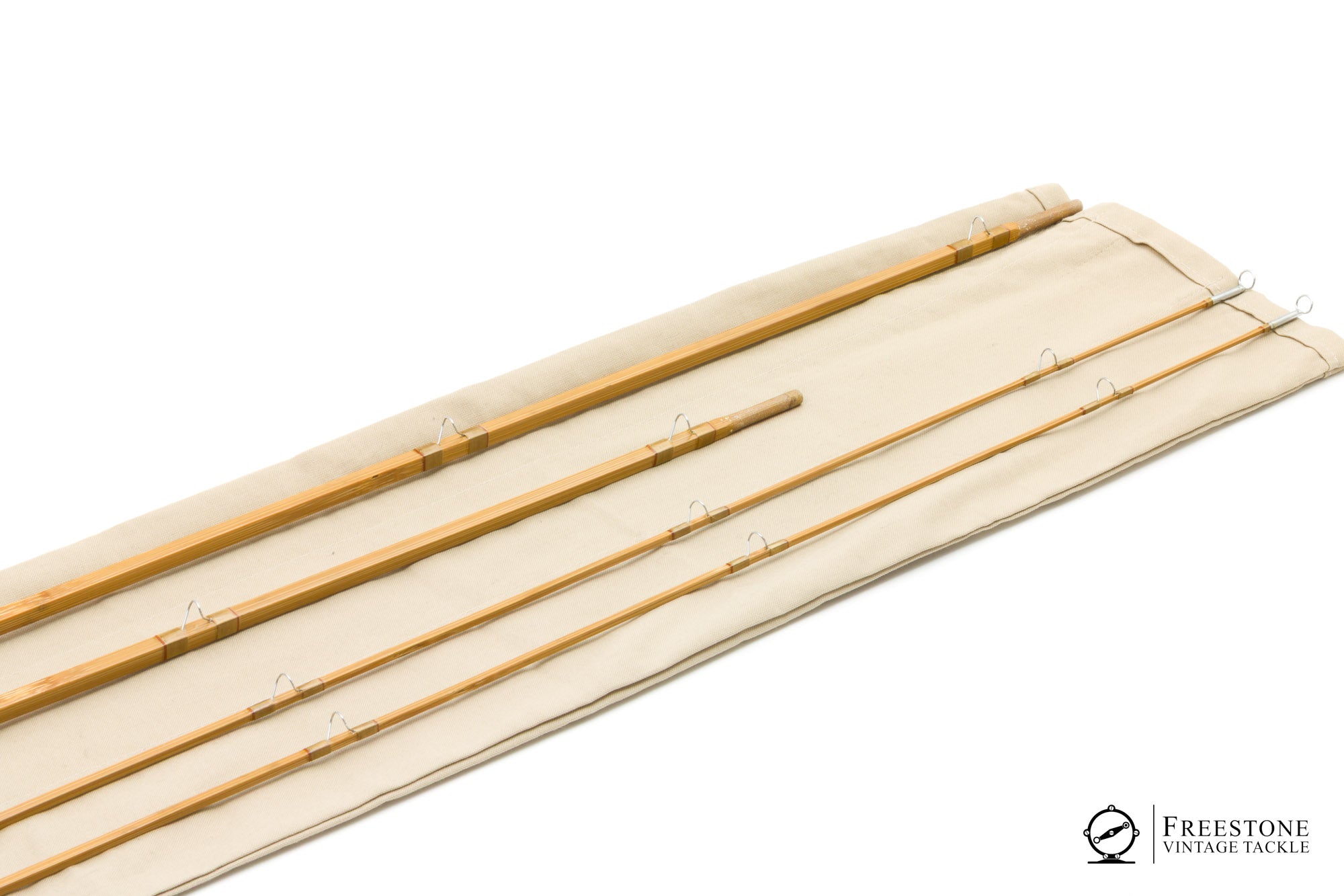 For sale here is a very nice bamboo companion rod, new from the bench of Bill Taylor. Two butts and two identical tips, one butt makes a 7'3" rod and the other makes a 7'9". Hollow built, quadrate construction with bright snake guides, yellow agate stripping guides and golden tan windings with copper tipping. The sections are straight and serialized, and the fiberglass ferrules fit perfectly. Both butt sections have all-cork grips and reel seats with cork-over-metal slide bands. The 7'3" configuration is 2.50oz and the 7'9" is 2.96oz. Two nice dry fly rods, best with DT3 or WF4 lines. Sold in the original bag and tube with maker's logo affixed.