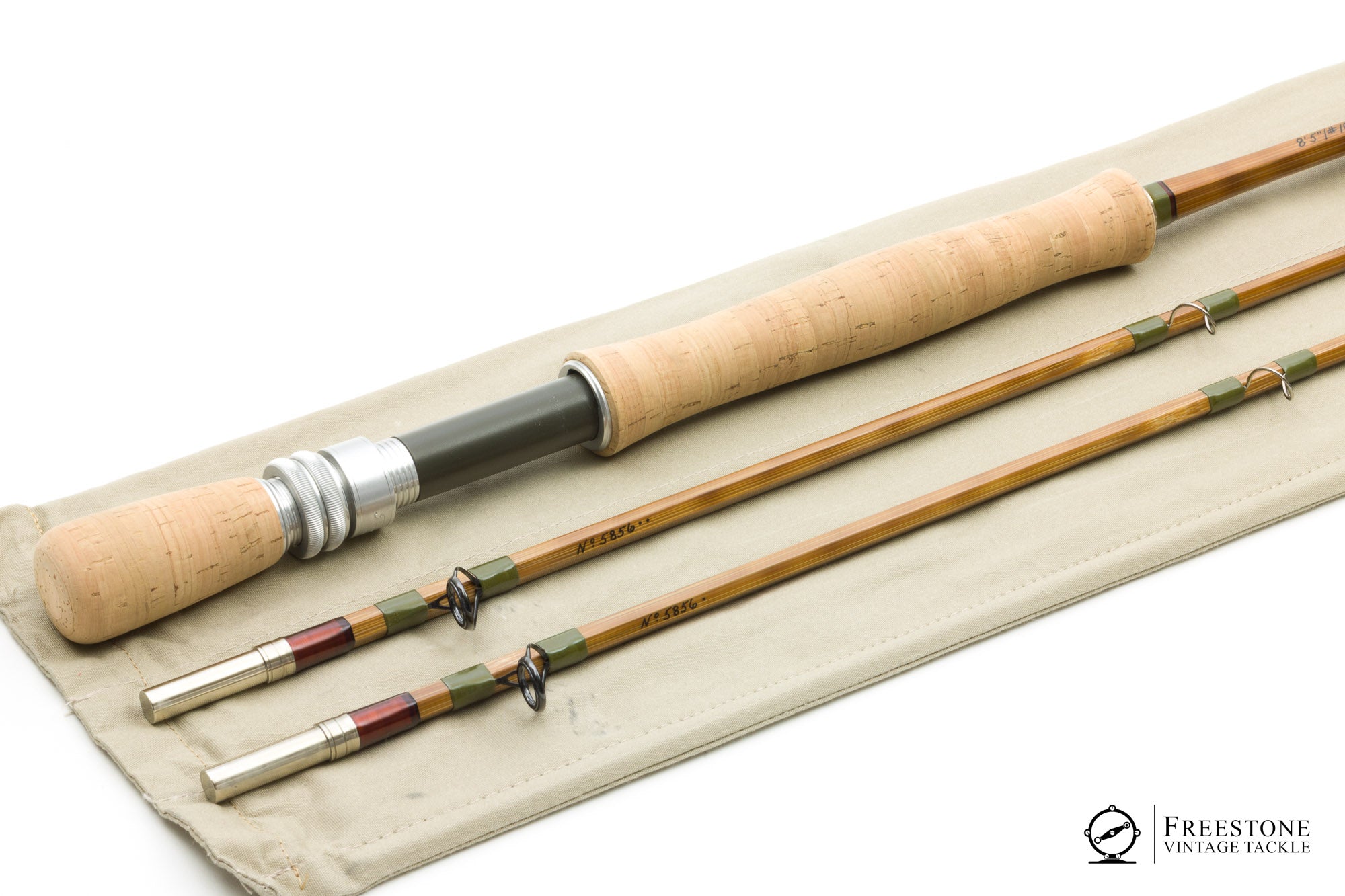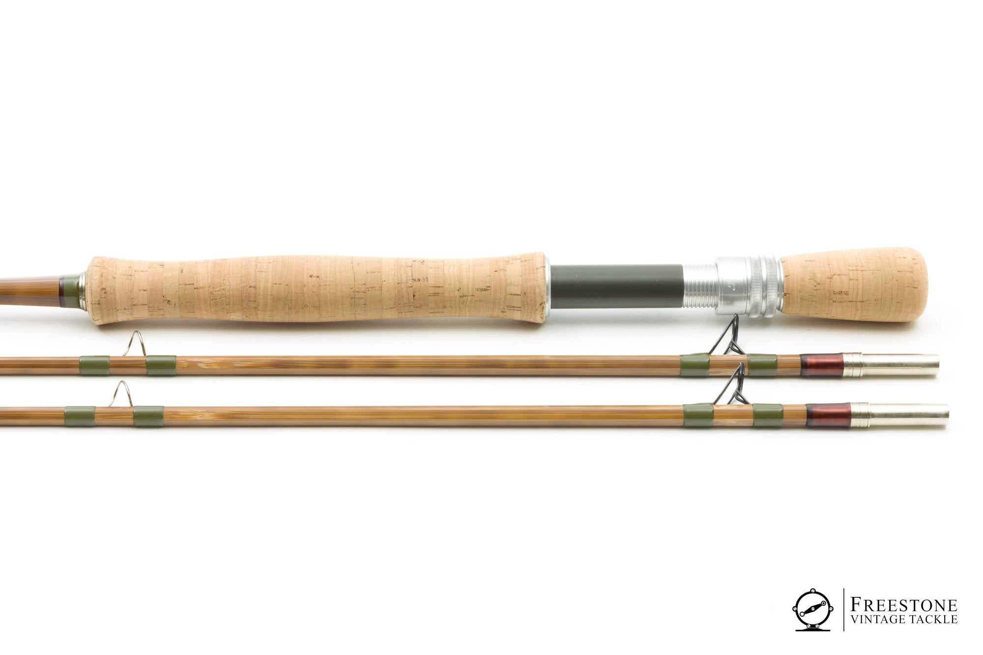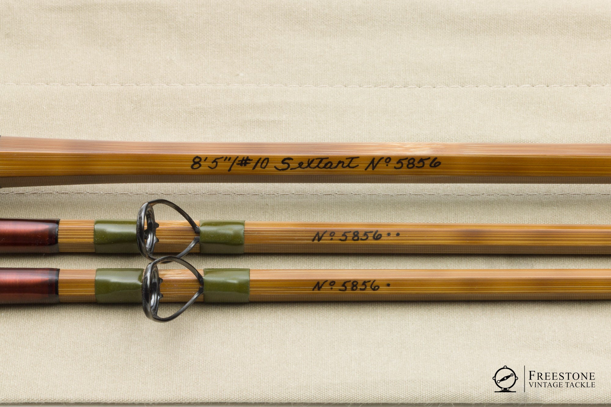 For sale here is a Thomas & Thomas 'Sextant' 8'5" 2/2 10wt bamboo saltwater rod in mint condition. Serial #5856. Featuring tiger striped flamed bamboo, hunter green windings, oversized snake guides and ceramic stripping guides. Everything about this rod was purpose built for the salt. All sections are full length, serialized and straight as a pin. Bright ferrules fit perfectly, and the female is fitted with a NS/cork ferrule plug. A swelled butt leads into the 7" full wells grip (bright & smooth), and the rod is fitted with a milled aluminum, salt-safe reel seat with fixed cork fighting butt. Weight is 7.37oz. A fast action 10wt, this is the tarpon hunter in T&T's lauded Sextant series rods. As new, sold in the original bag with stiffener and brass capped tube.