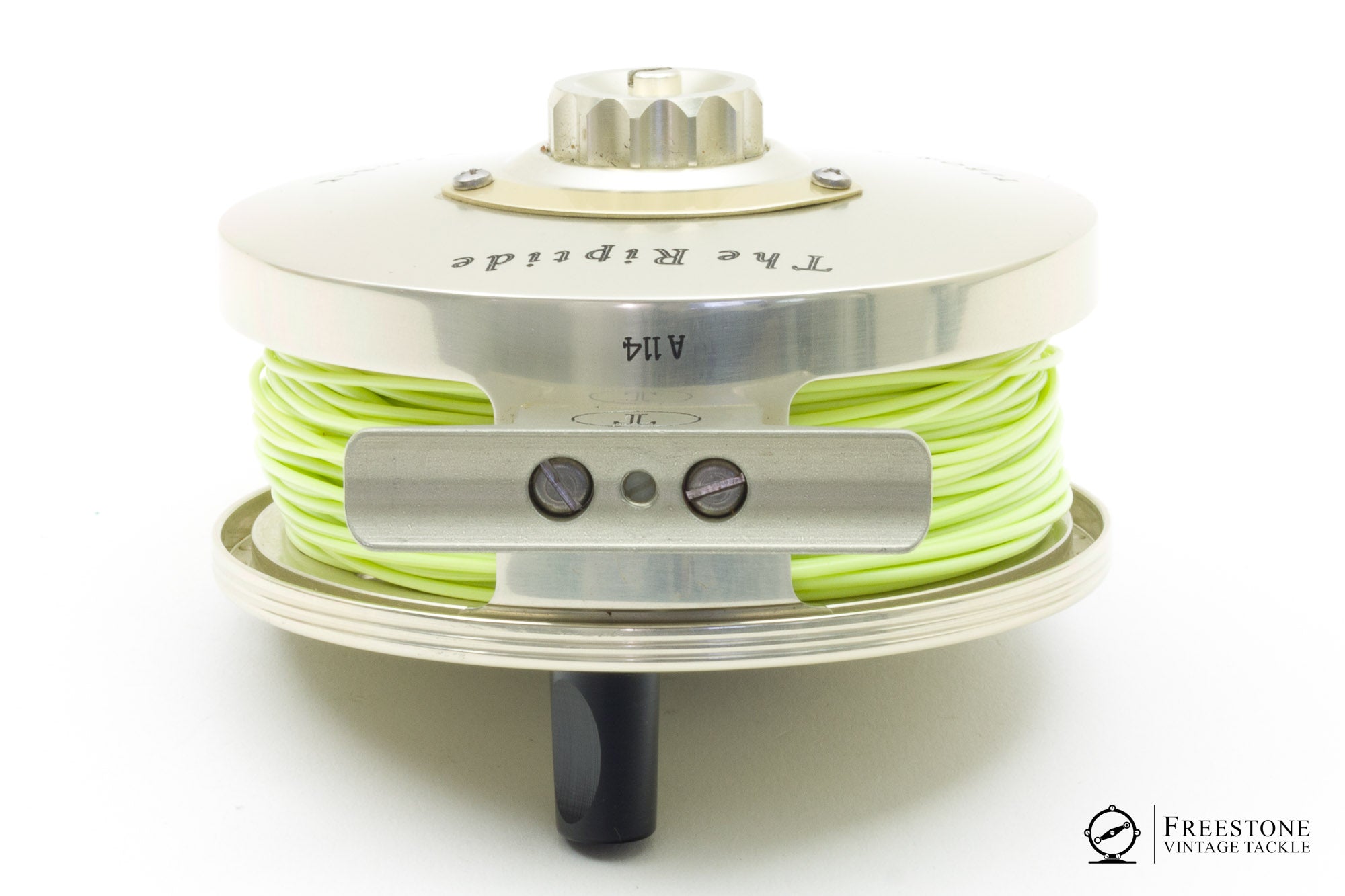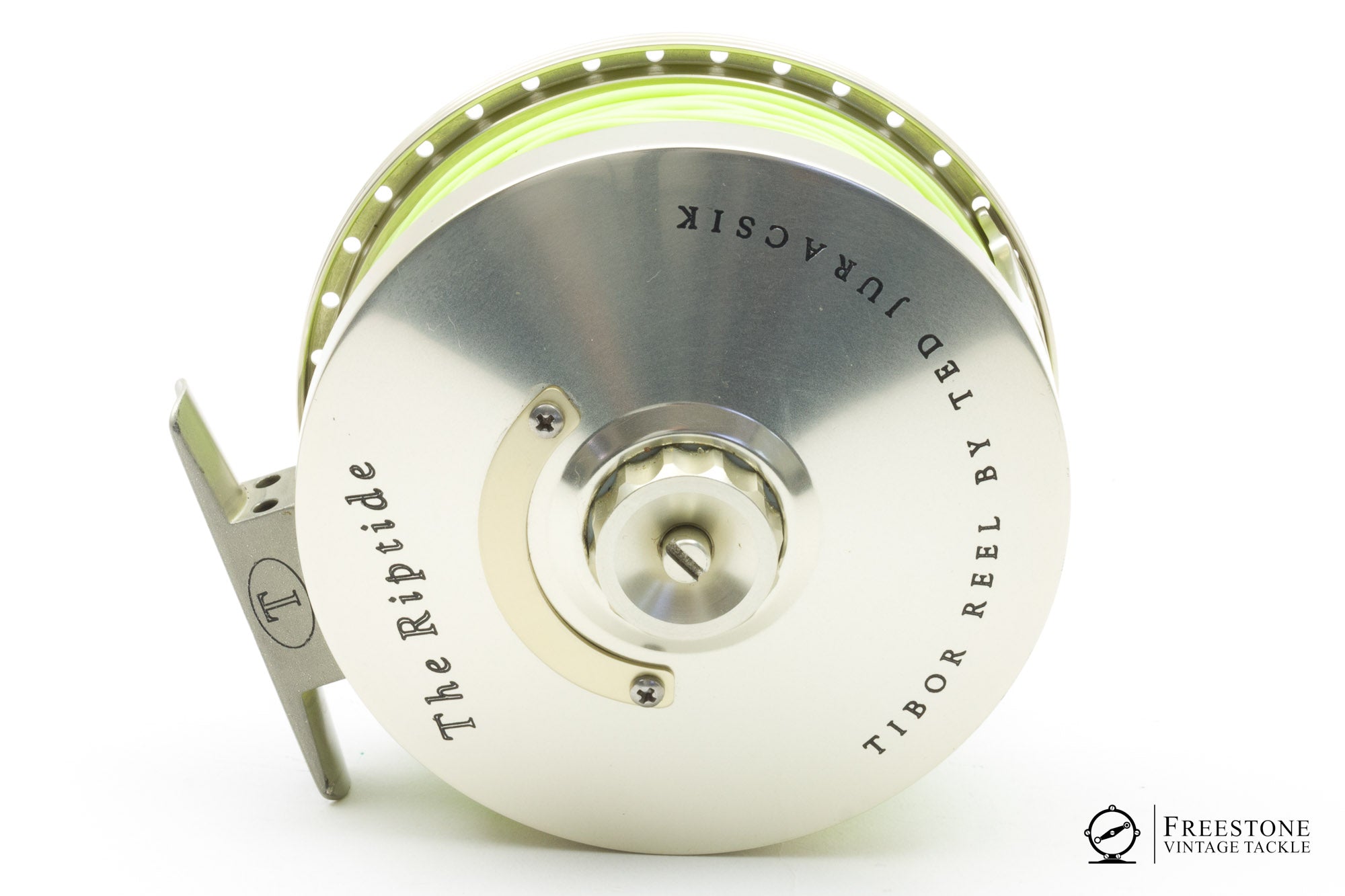For sale here is a Tibor Riptide fly reel in excellent used condition. Set up LHW but can be converted to RHW. 4" diameter with a spool width of 1", weight is 13oz loaded with line and backing. Gold anodized finish with blank name plate, ported spool and strong adjustable cork drag. An excellent all-around saltwater reel, best with a 9/10wt line. Mechanically perfect with light mounting marks to the foot and a few faint scratches here and there. Sold in the original box with pouch and papers.