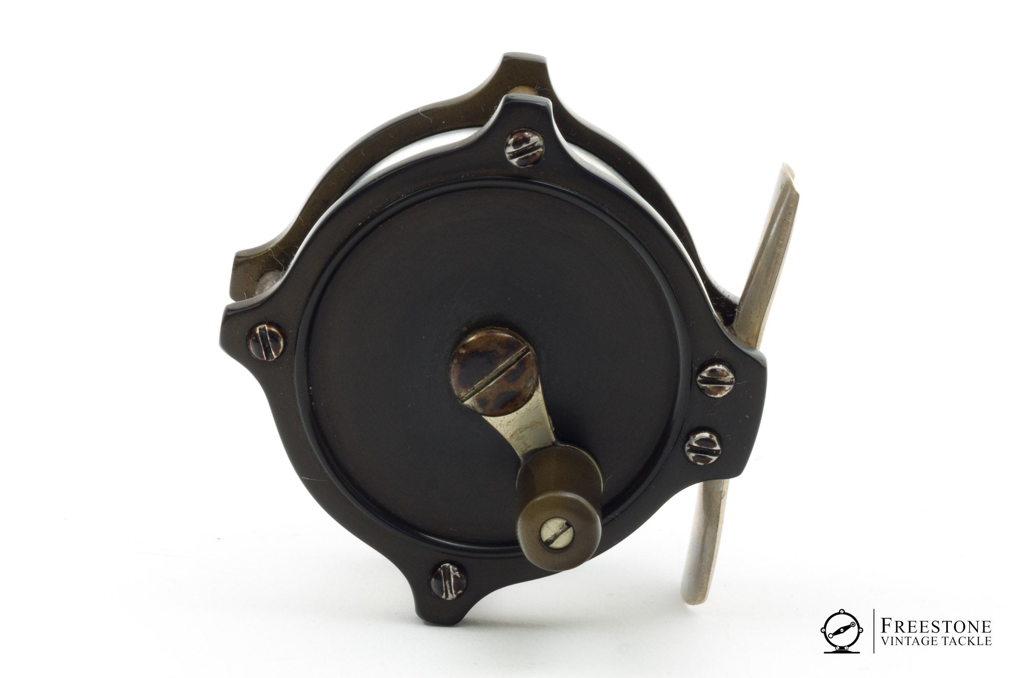For sale here is an original Julius vom Hofe Fairy fly reel in excellent condition. These reels were made for H.L. Leonard & William Mills to complement the Leonard "Baby Catskill" rods produced in the early 20th century. This reel has black ebonite side plate, aluminum spool and brass spindle. The foot and pillars are nickel silver. 2.35" across pillars with a spool width of 0.72". Best with a 2 or possibly a 3wt line (although you might have to cut a DT3 in half). The reel foot is unmolested, and the click & pawl mechanism works flawlessly with slight RHW bias. The hard rubber has some sun fading, and there is dark lacquer or varnish on all the screw heads. Weight is 2.29oz. A rare and desirable reel: many early Baby Catskill rods require a dainty reel with a small foot to fit their reel seats. This one is sold in an aftermarket leather case.