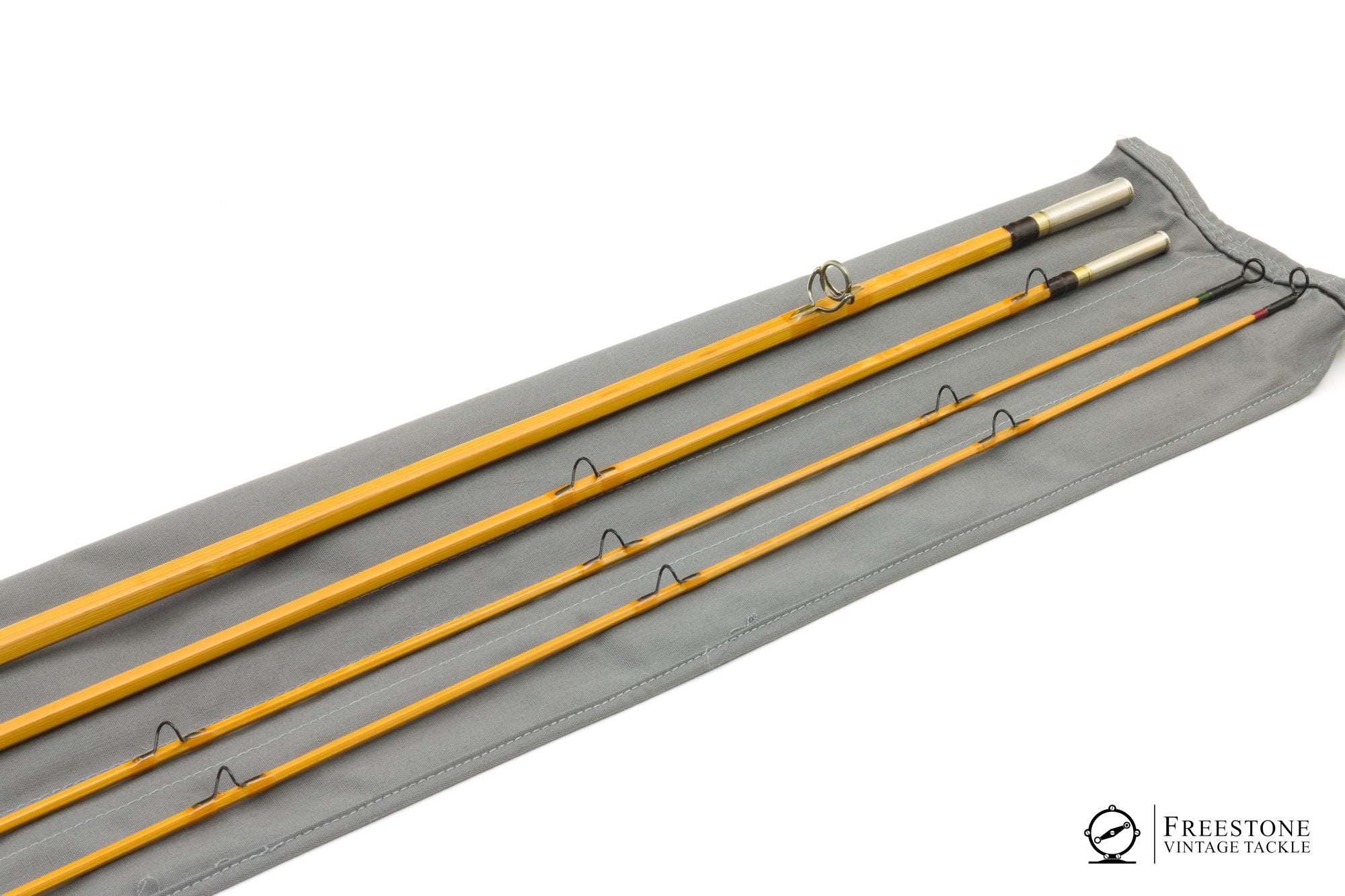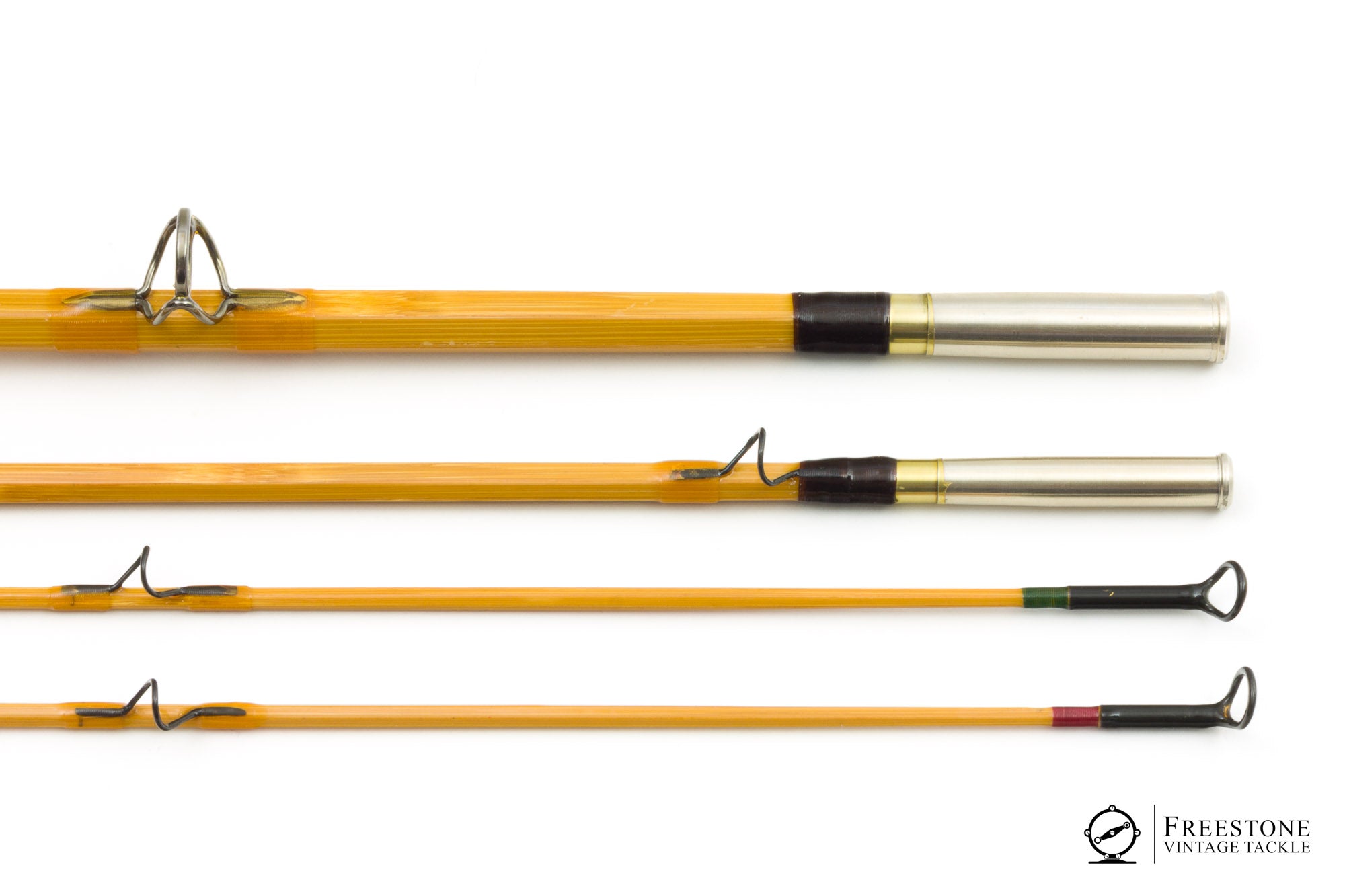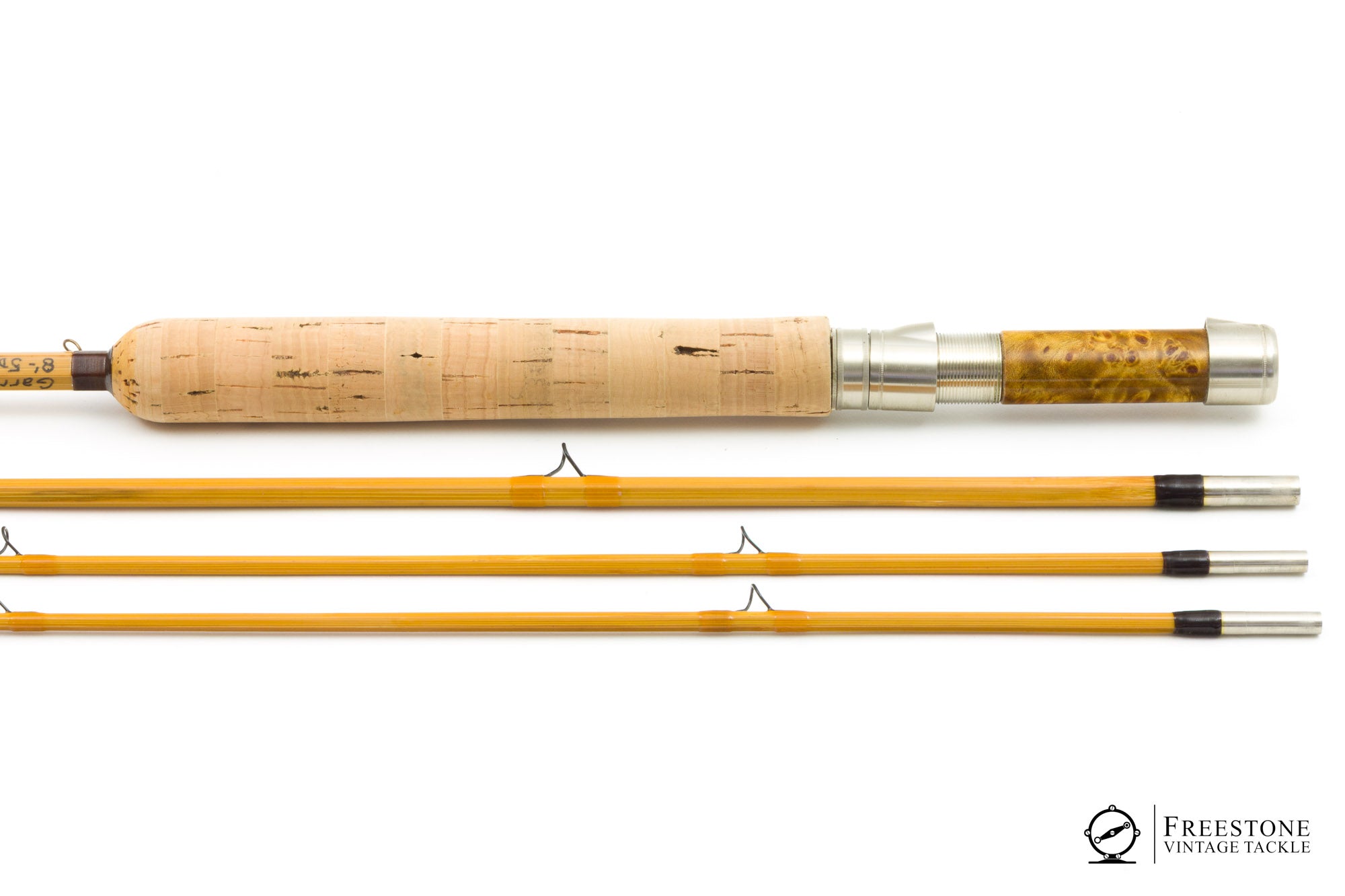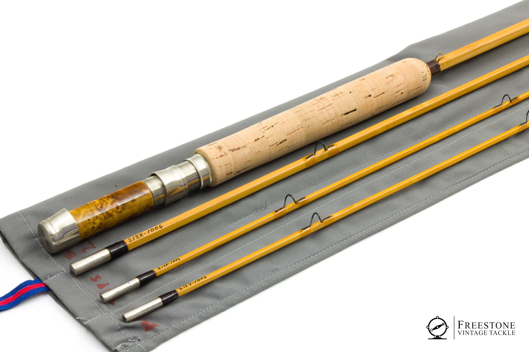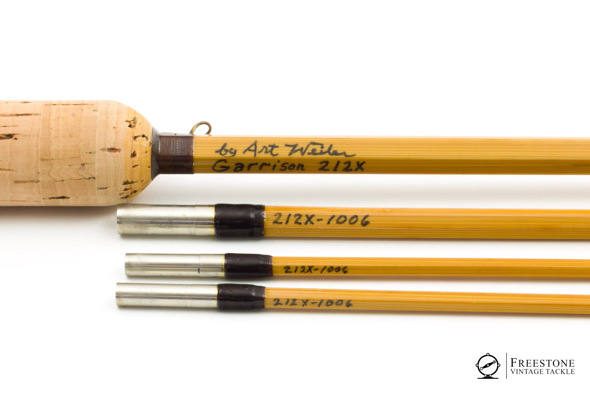 For sale here is an Art Weiler Garrison 212x taper, 8' 3/2 5wt bamboo rod in near mint condition. Blonde cane with dark guides and large carbide stripping guide. Ferrules have dark windings, and the tips are marked red/green in the Garrison style. Ferrules fit perfectly and all sections are full length and serialized (#1006). Both tips have very faint droops, although the rod looks unused. Bent loop hook keeper, 6.5" cork grip (bright and smooth), and down-locking reel seat over burl spacer. Weight is 5.61oz. Medium fast action, the rod has a powerful feel but loads into the butt section with a heavier WF5. The "x" designates Weiler's conversion from the 2-piece format to 3-piece (Garrison's original 212 is a 2-pc). Art Weiler is known for his Garrison taper rods and this is a rather nice one, packed into the original bag and tube with maker's label affixed.