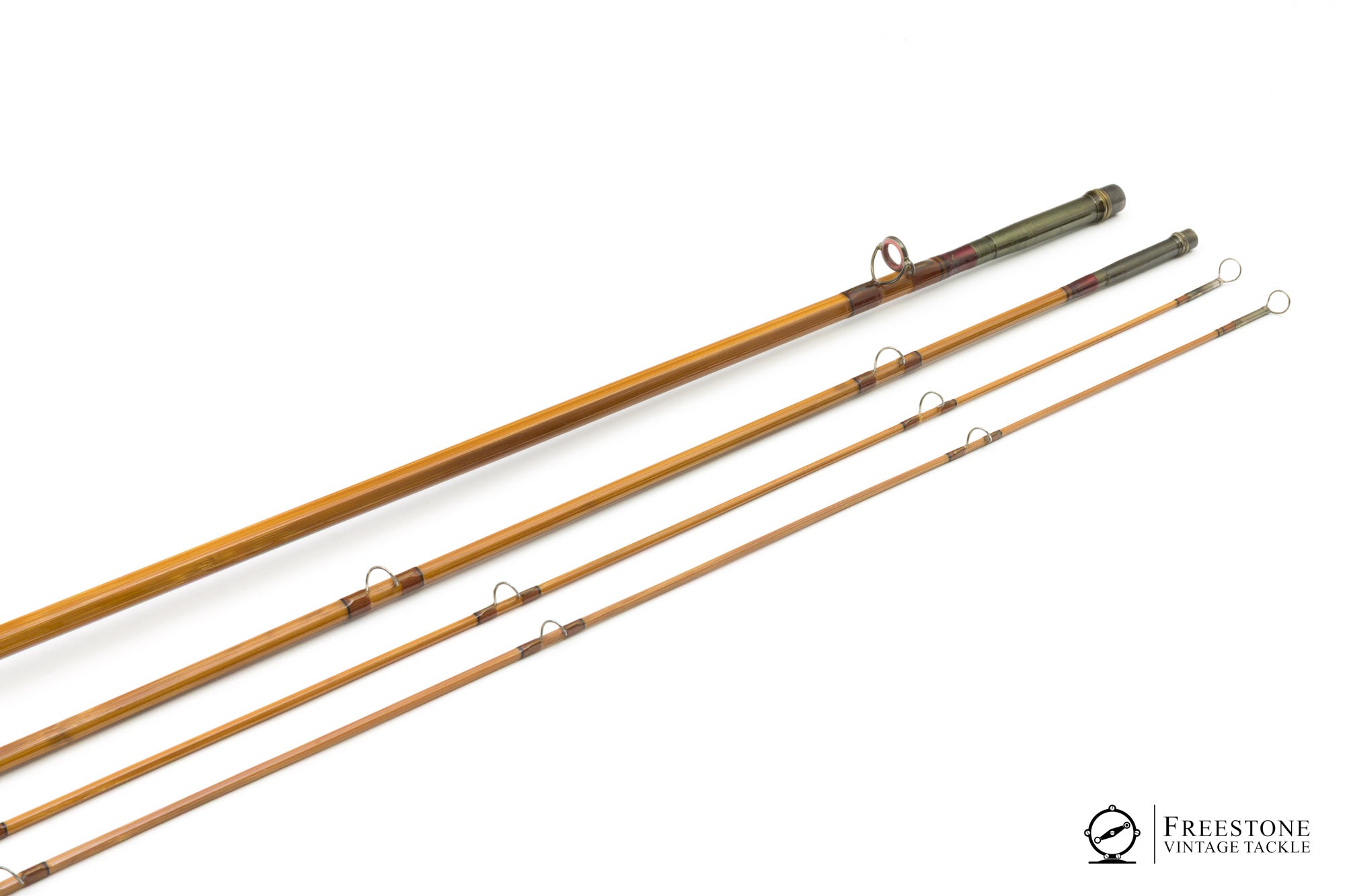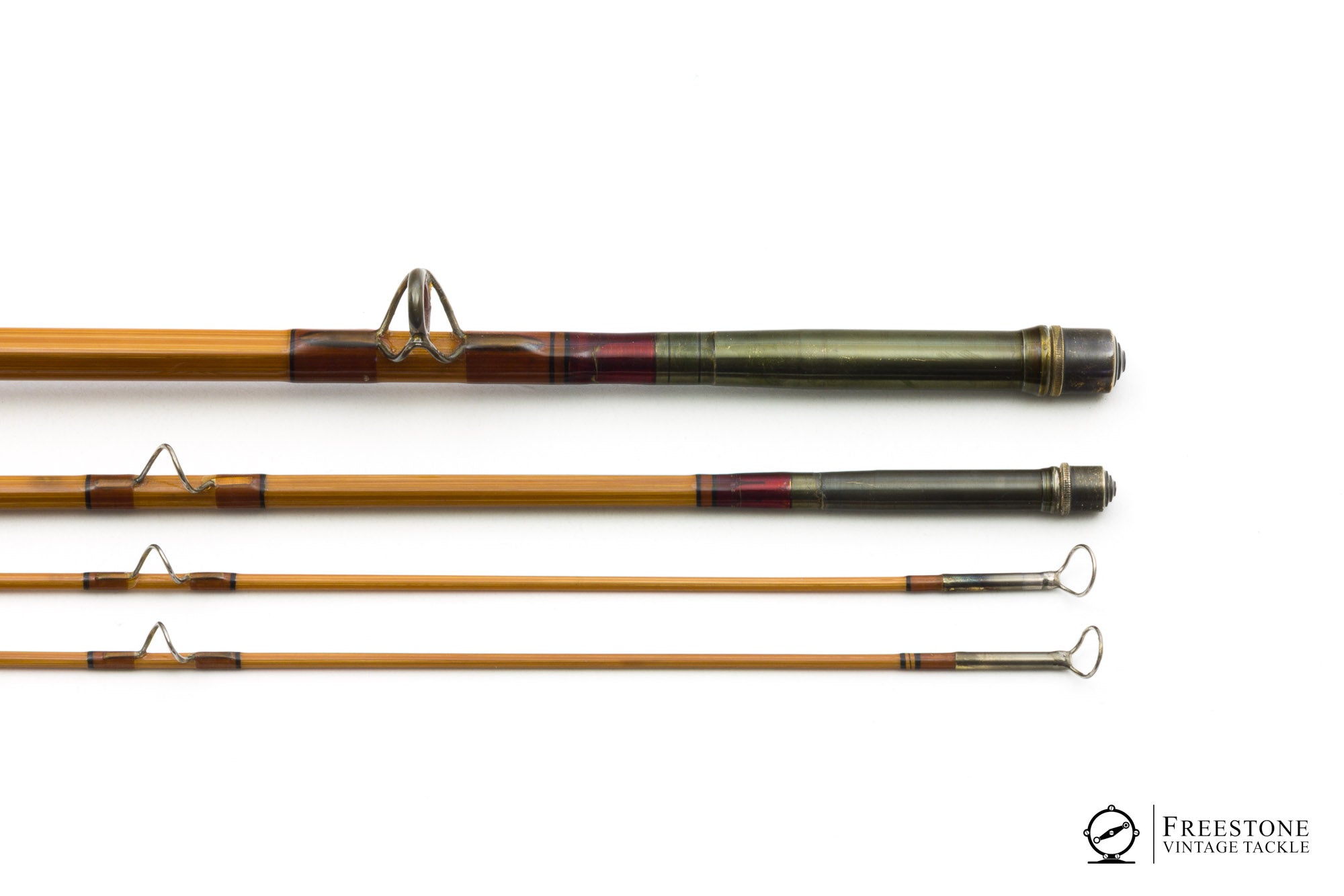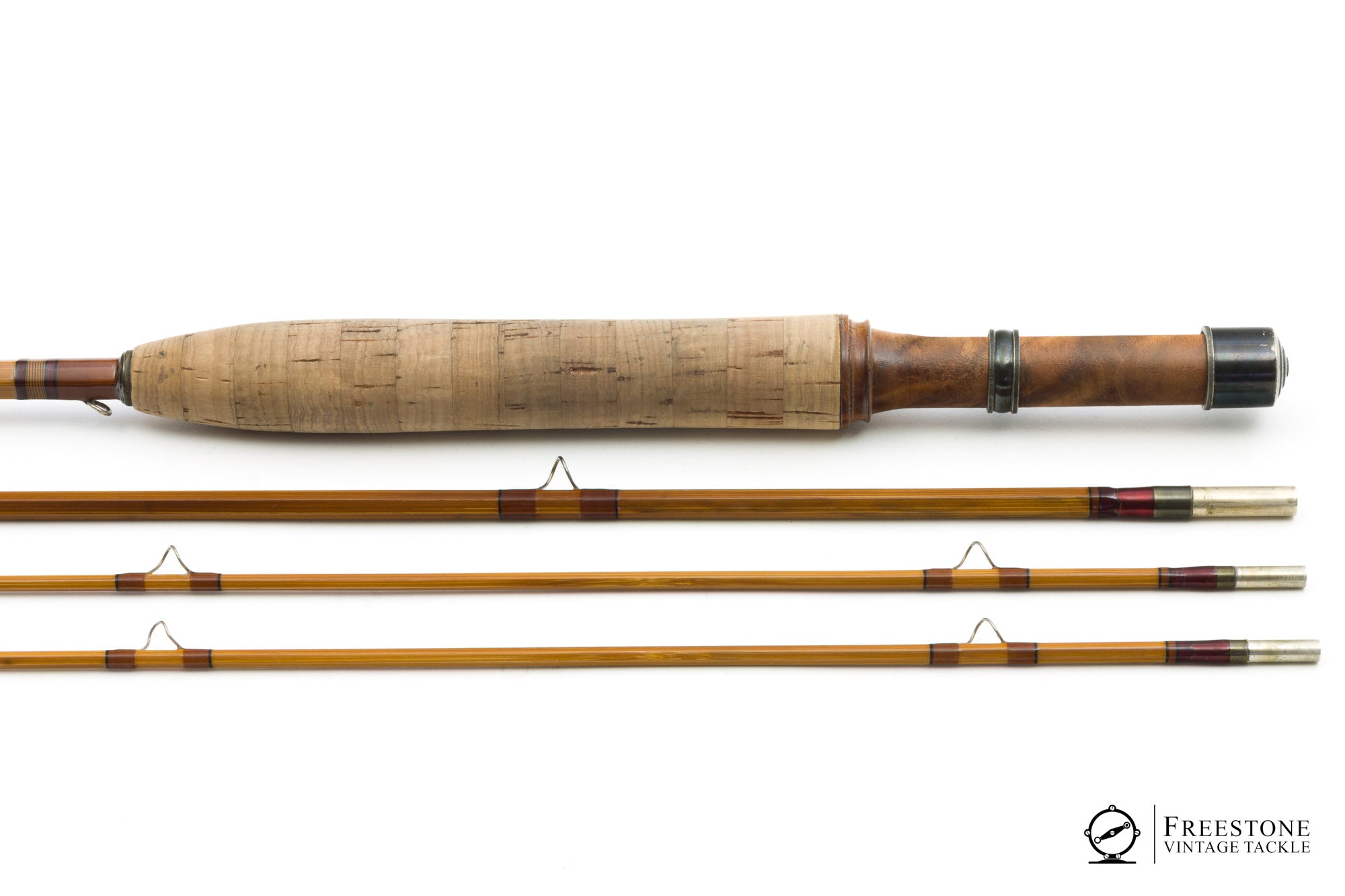 For sale here is a "Great 8" 8' 3/2 5wt bamboo rod made by R.J. Schneider (High Plains Rods). Flamed bamboo with 3x3 nodes, red agate stripping guide and dark brown windings with black tipping. Ferrules fit perfectly and the females are fitted with brass & cork plugs. All sections are straight & full length, and the tips are marked for ease of rotation. 6.2" grip is soiled but smooth, and the rod is fitted with a cap & ring reel seat over mortised spacer. Weight is 4.83oz. Medium fast, progressive action. A fine dry fly rod with mildly swelled butt. Sold in the original bag and tube with maker's decal affixed.