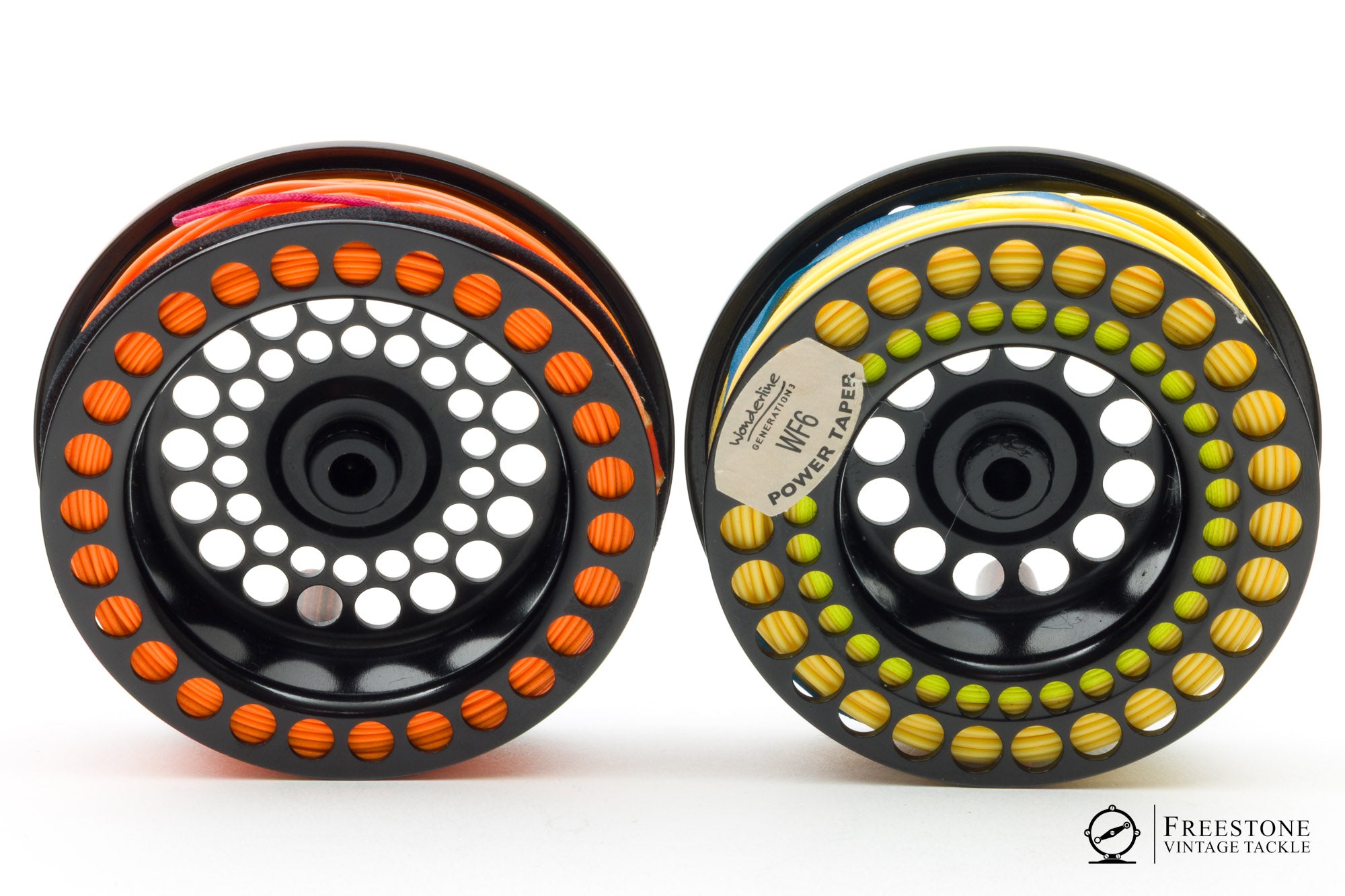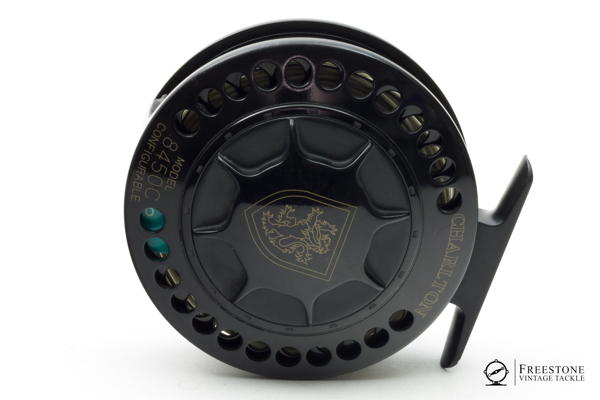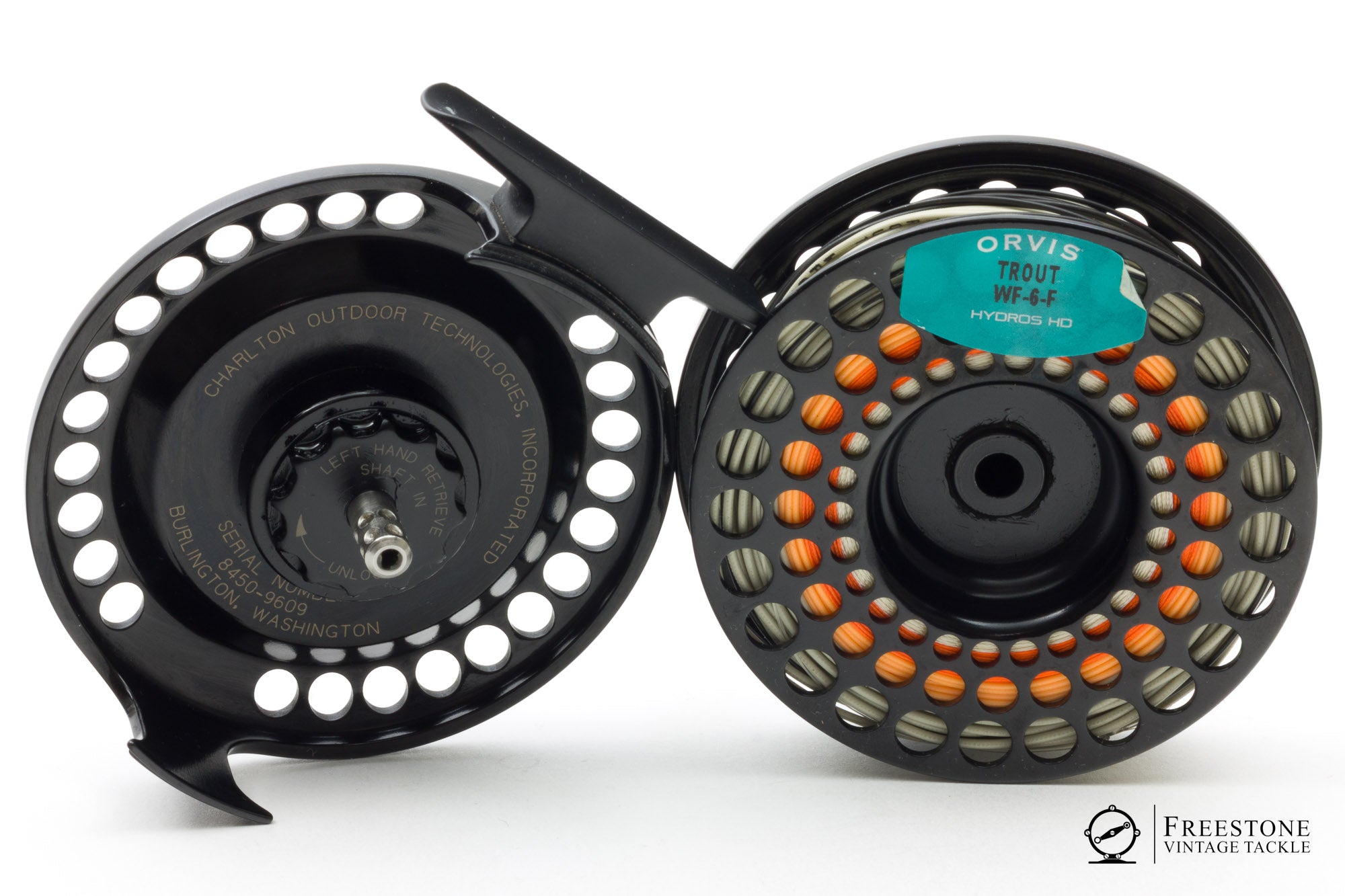 For sale here is a Charlton 8450c fly reel with all 3 spool sizes (7/8, 5/6 & 3/4). Excellent used condition, each spool is loaded with line & backing. The reel has some mounting marks to the foot and some faint scratches from use. The spools are quite clean except for the 5/6 which has a few small nicks and a ding that spans both sides. This is cosmetic and does not affect the reel mechanically; all 3 spools fit perfectly with the frame. Jet black Type III anodizing throughout, the spools are set up LHW but the reel swaps to RHW very easily. Telephone dial drag adjust works as intended with an incredible range of resistance. With all 3 spool sizes this set should cover your bases from light trout fishing all the way up to light salmon or even bonefish. The reel w/ 7/8 spool packs into the original blue Cordura case, as does the 3/4 spool. The 5/6 comes in its original box. This set comes from the collection of Richard R. Twarog; a book of his classic Atlantic salmon fly postcards will be included with the sale.