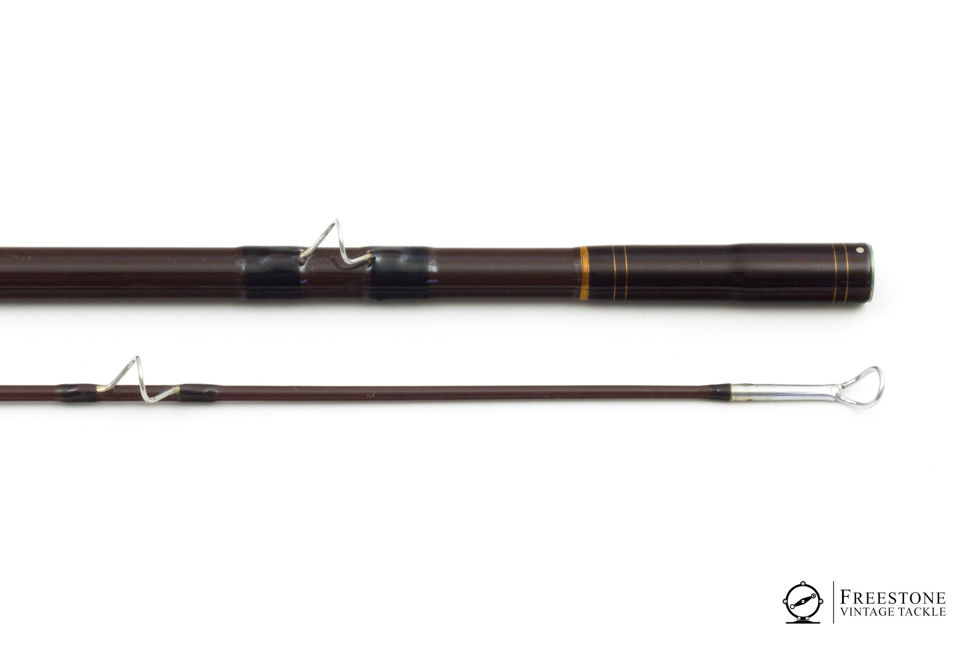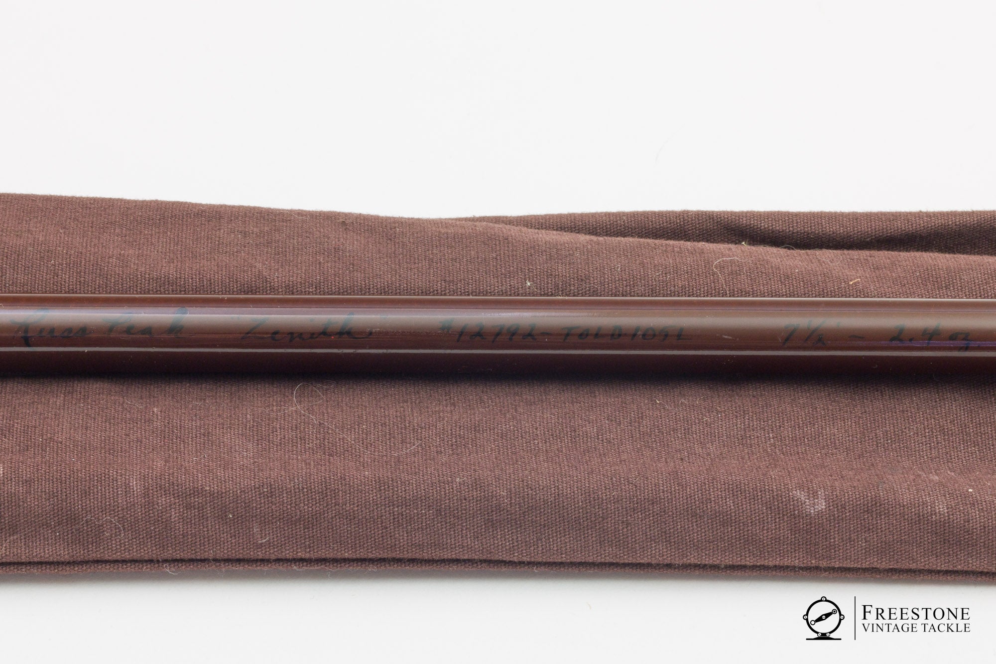For sale here is a Russ Peak Zenith, 7'6" 2pc 4wt fiberglass rod in very good used condition. Serial #12792. Built on a sanded maroon blank with bright guides and nickel silver ferrules. Black script on the butt indicates a model TOLD-105L, and the original owners name is also inked on the butt. All cork grip & reel seat with gold anodized cap & ring hardware. The cork is soiled but smooth. Scripted & actual weight is 2.4oz. Medium/medium-fast fiberglass action, a powerful 4wt that some may prefer with a 5wt line. The blank is in good shape and shows normal signs of use. A very nice Russ Peak Zenith glass rod, sold in the original bag and tube.