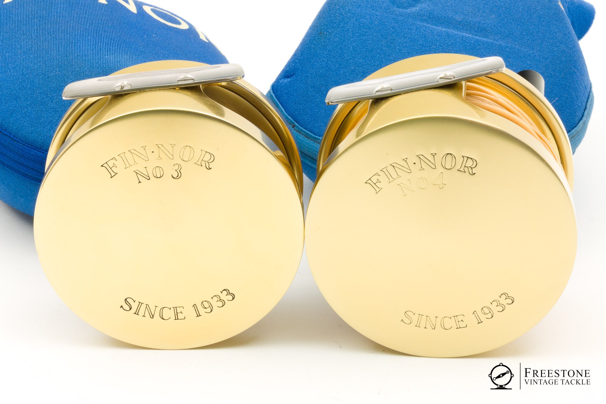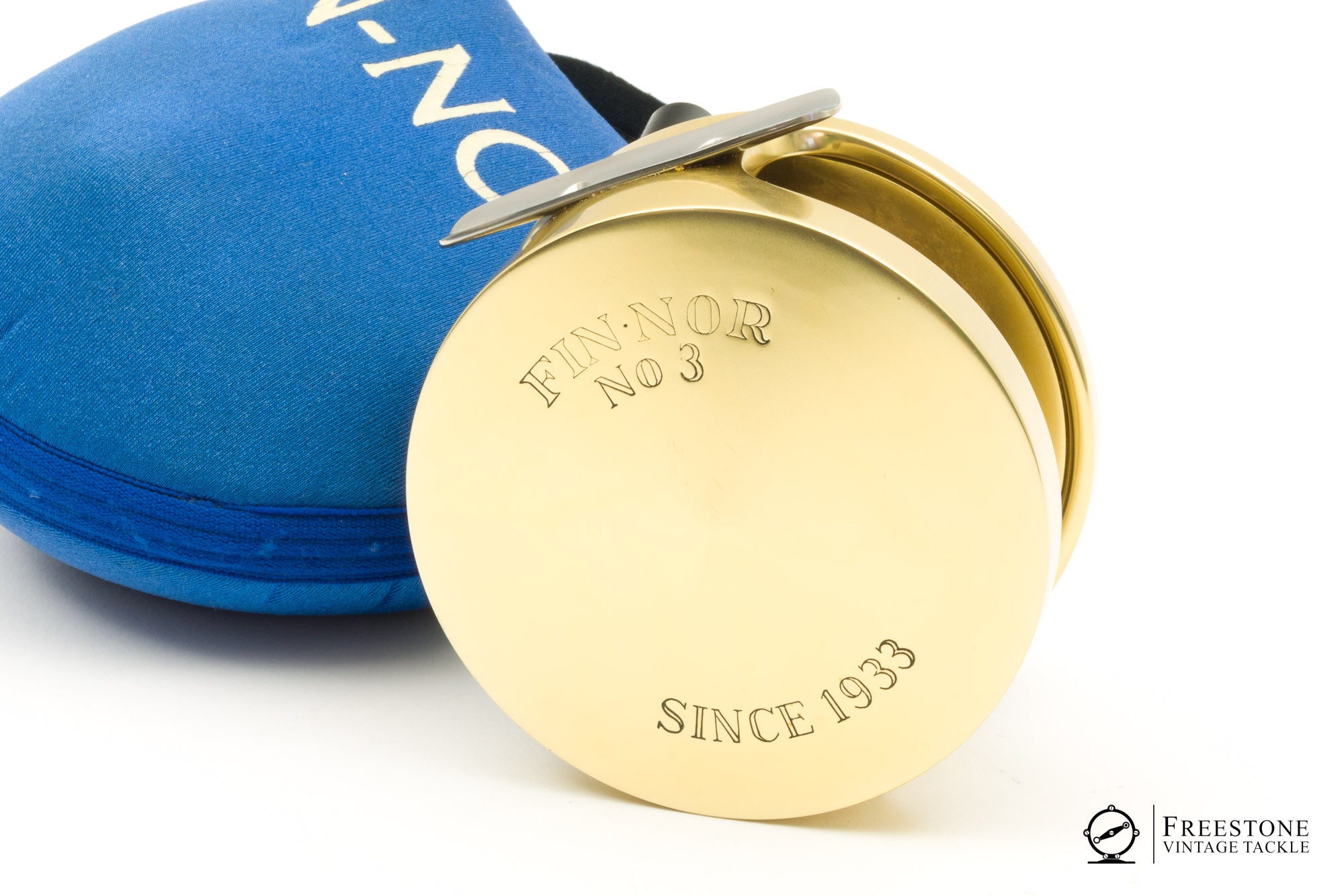For sale here is a Fin-Nor size 3 anti-reverse fly reel in LHW. Excellent used condition, the reel shows light signs of use, mostly relegated to some scratches on the rims. Gold anodized finish with dual handle grasps and solid frame & spool. Strong and smooth adjustable cork drag. Mechanically perfect, 3 5/8" diameter with a spool width of 1". Official capacity is for 200yds of 30lb backing. Weight is 15oz loaded with an unknown fly line. Sold in the original blue neoprene case.