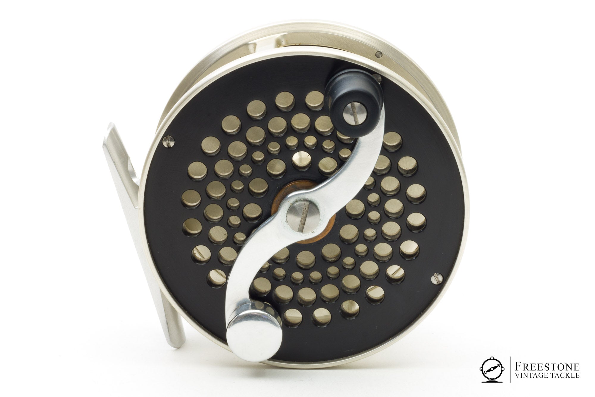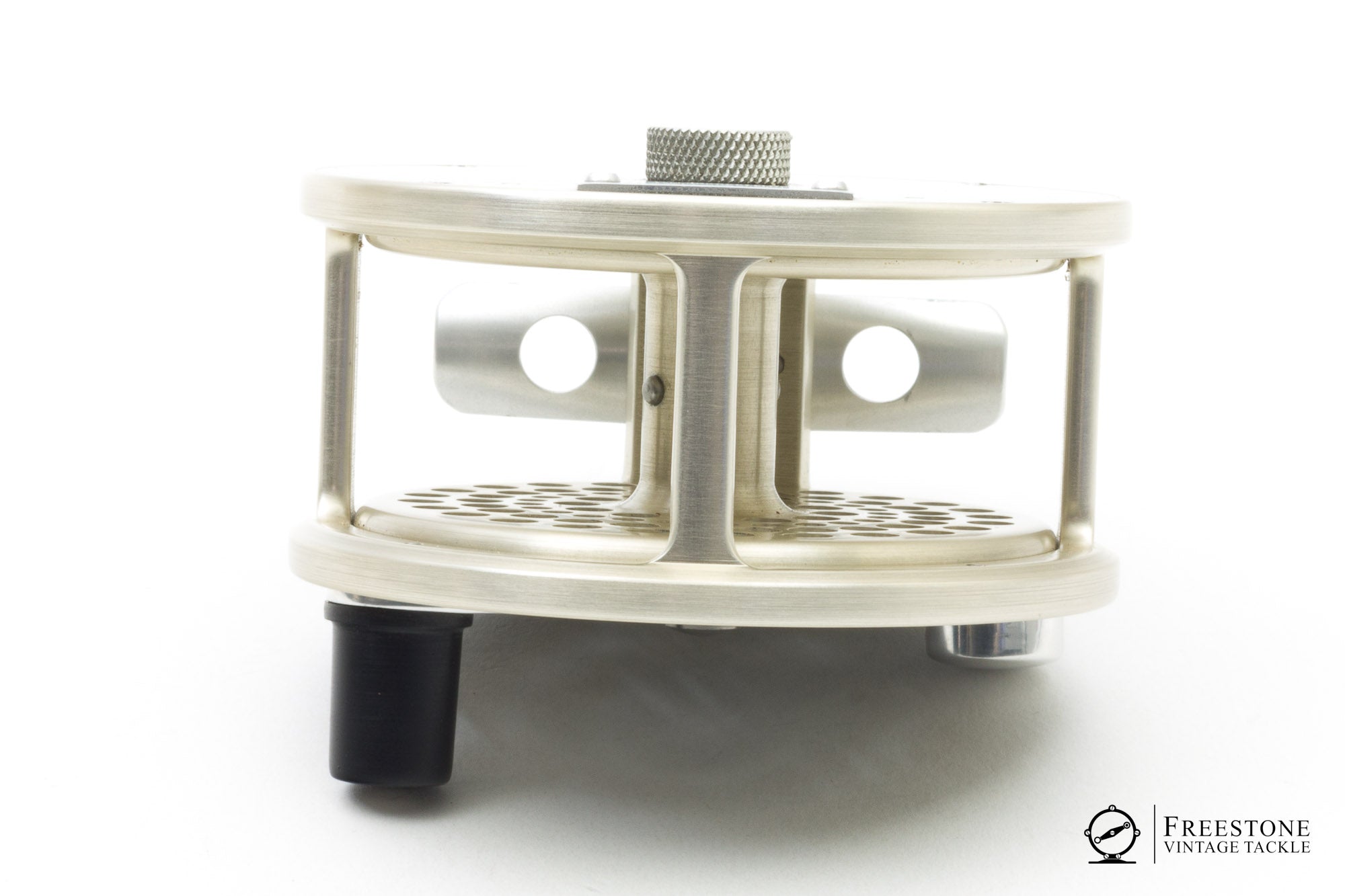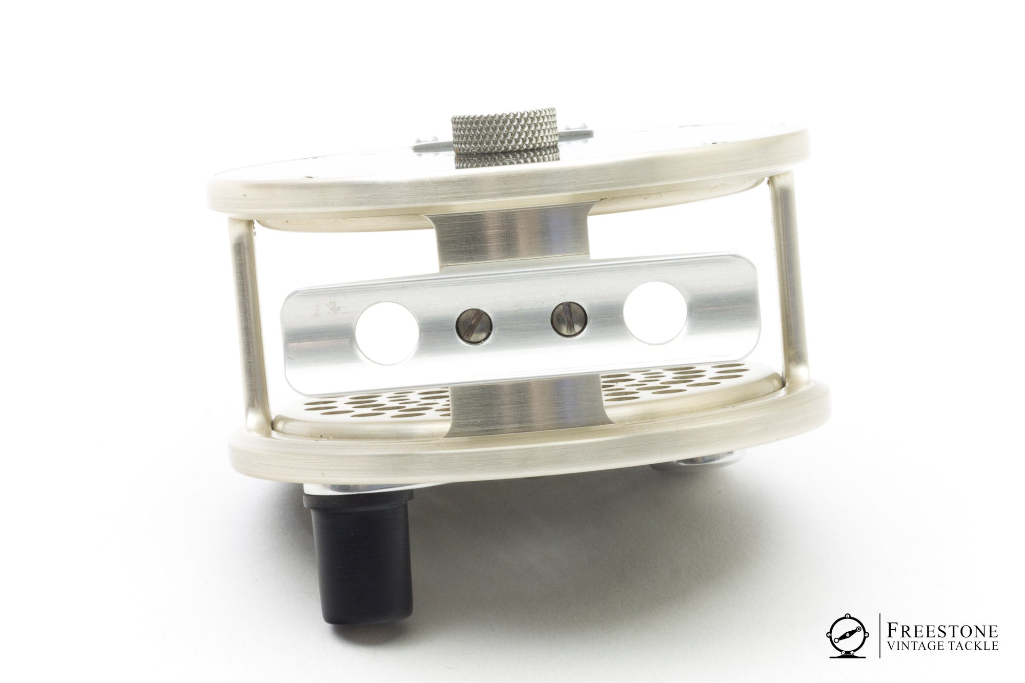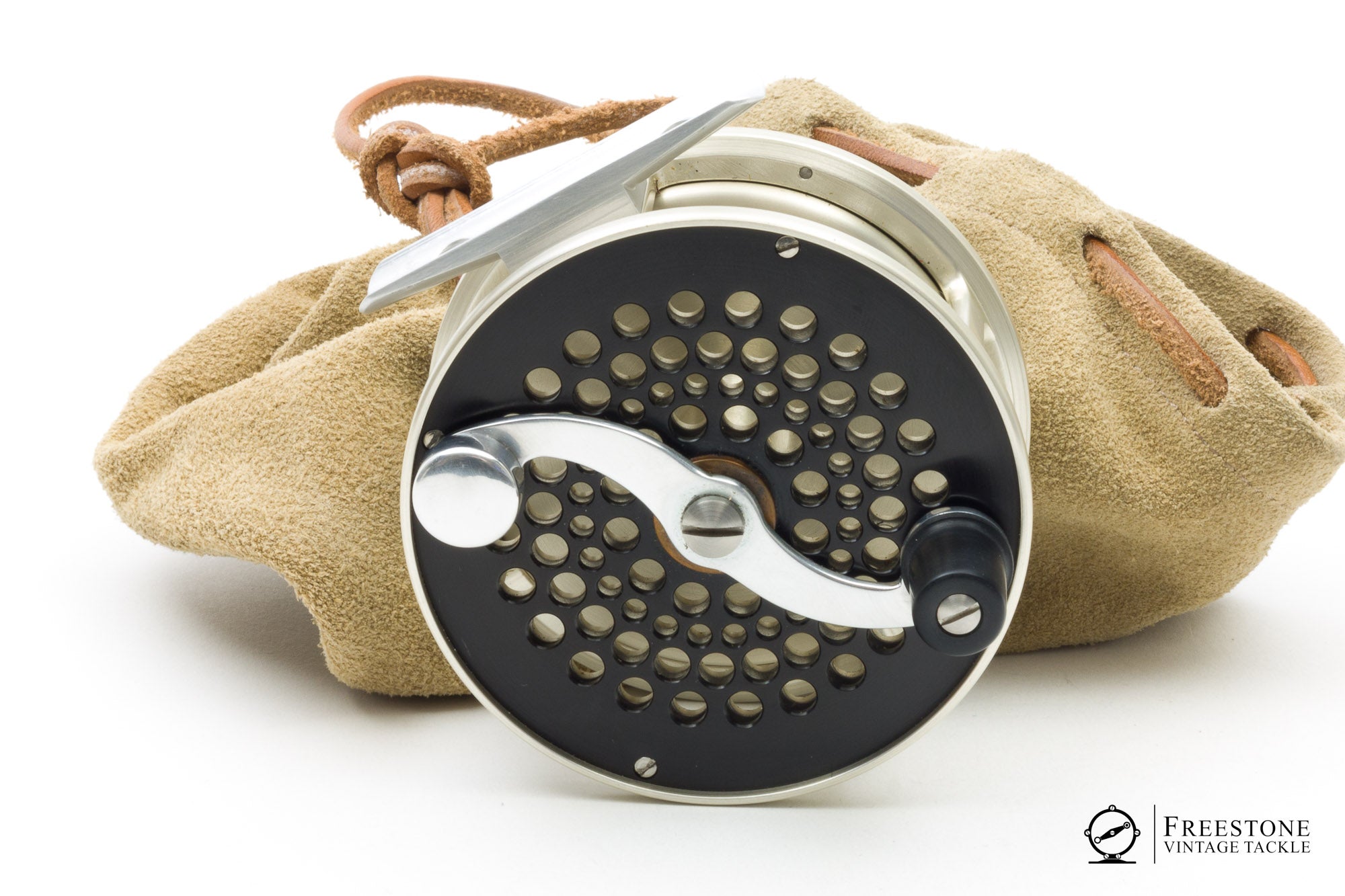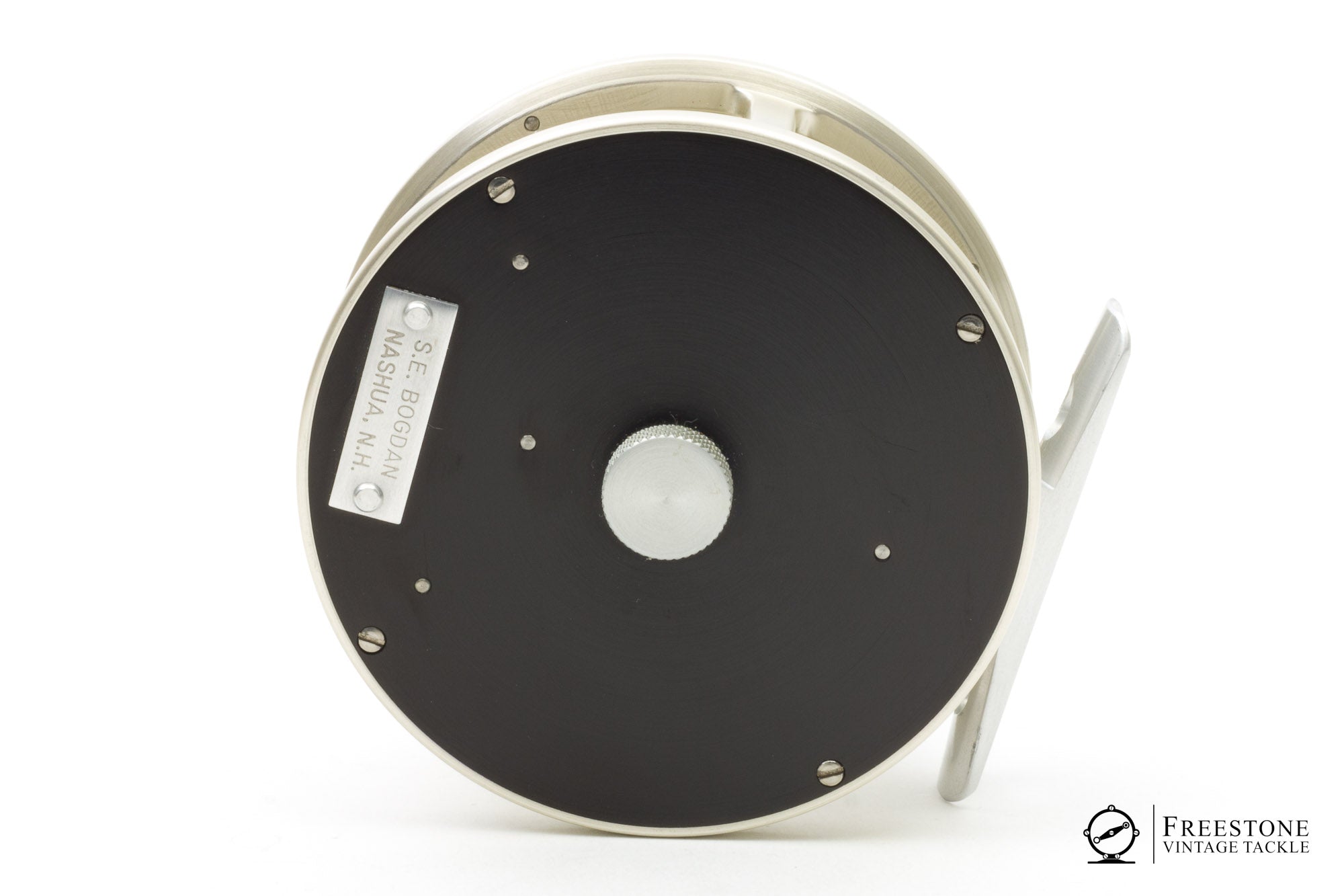 For sale here is a Bogdan Steelhead reel in near mint condition. Silver anodized frame with black side plates and bright aluminum foot. Fixed LHW check, although it can be converted to RHW for a small fee. 3 1/4" diameter with a spool width of 1 5/32", the reel weighs 5.55oz. I can see it was mounted to a rod at some point, but I doubt it was ever lined/used. A beautiful Bogdan click & pawl reel, sold in the original suede pouch.