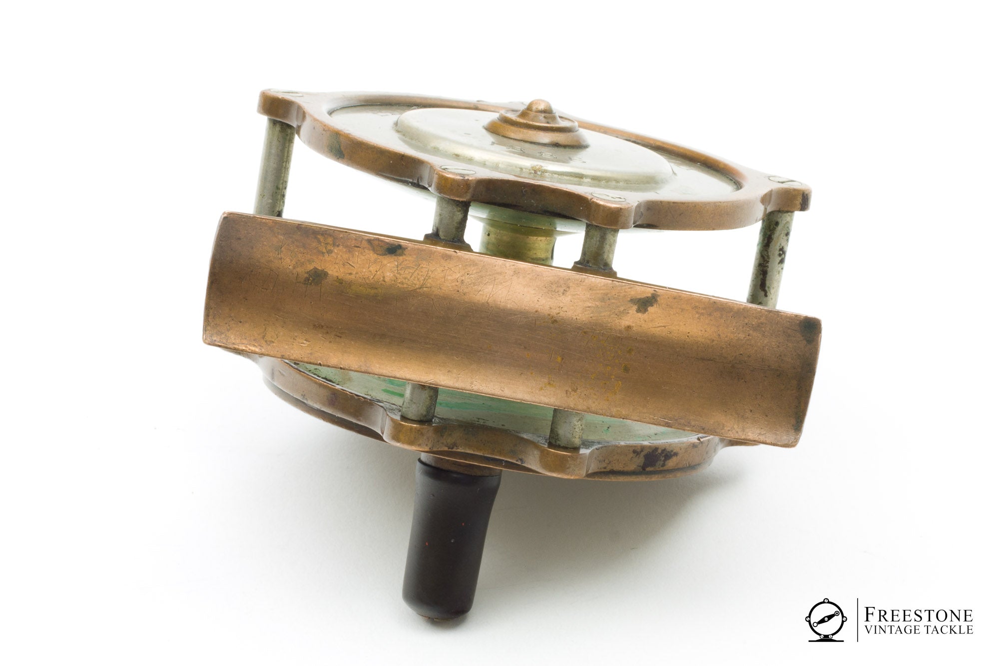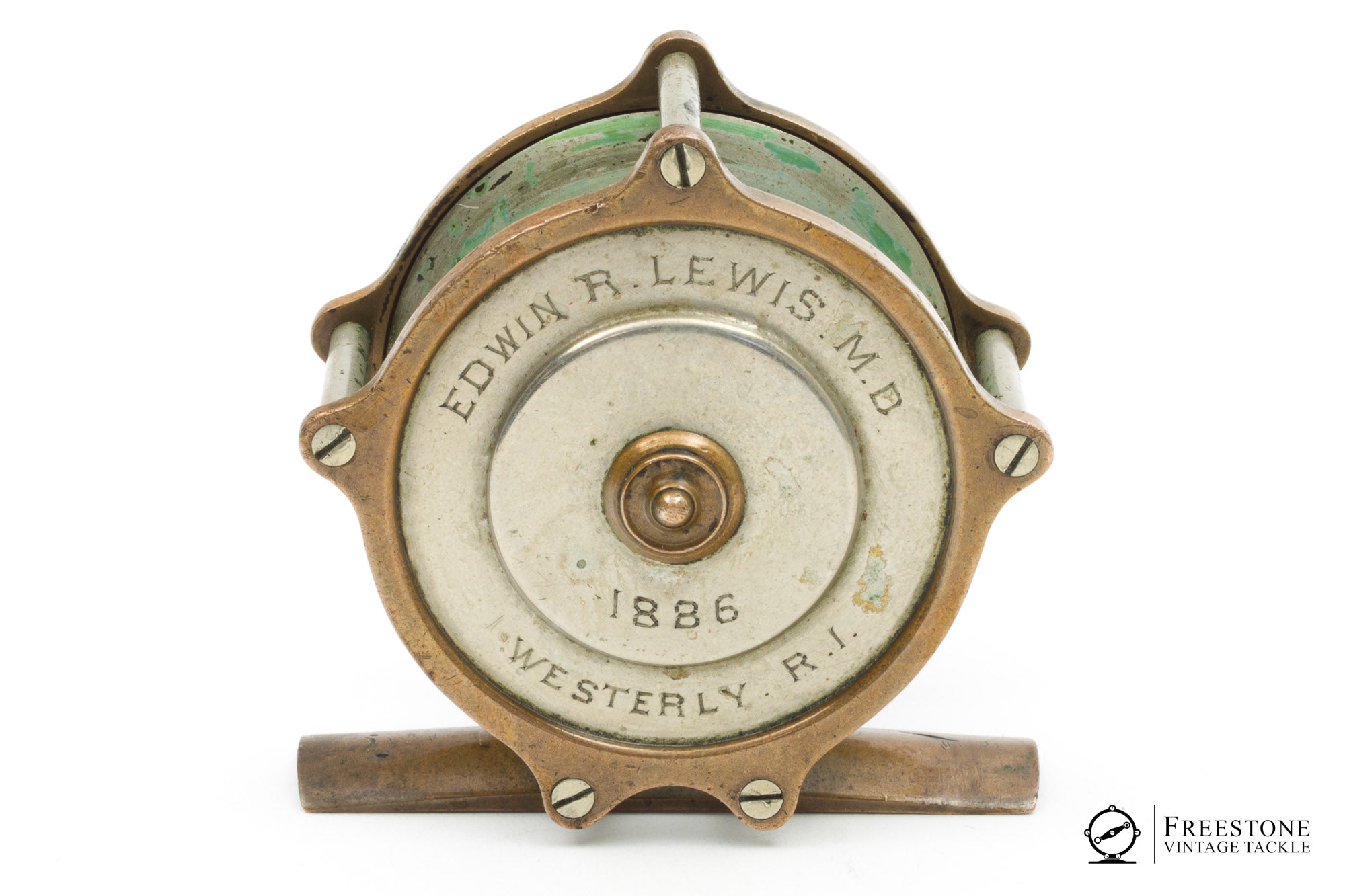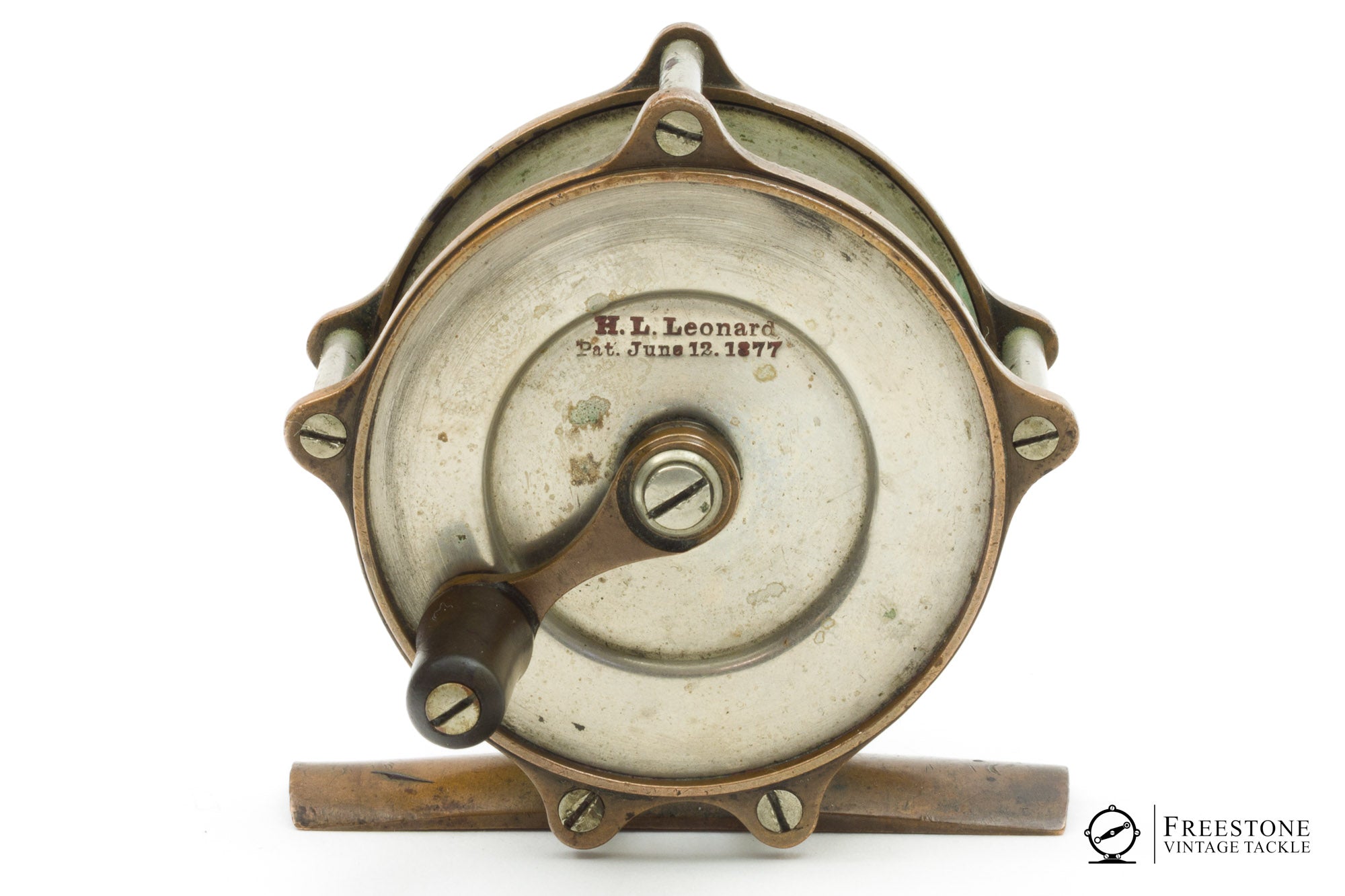 For sale here is a rare and beautiful 1st model H.L. Leonard Bimetal fly reel made by Philbrook & Paine. Excellent original condition, featuring a bronze frame with contrasting nickel silver side plates, spool & cross pillars. The backplate is engraved with the original owner's name and a date of 1886.The smooth bronze foot is unaltered, although the same owner's name is lightly etched into the bottom. The reel shows signs of use over the last 140 years, but wears it well and remains in nice mechanical shape. Slight LHW bias. Weight is 4.66oz and measures 2.51" across the pillars 2.20" diameter not including the raised pillars. A worthy collection to any reel collection, or an ideal pairing for an early H.L. Leonard trout rod. Sold in a modern neoprene pouch.