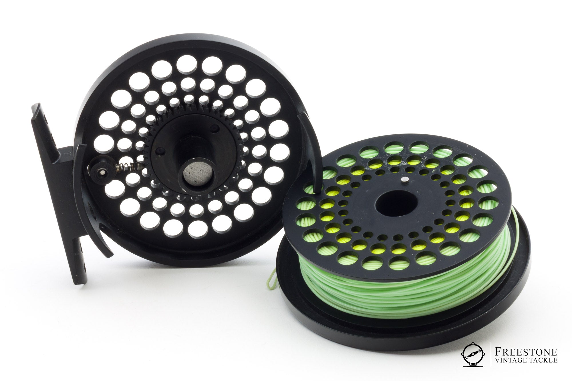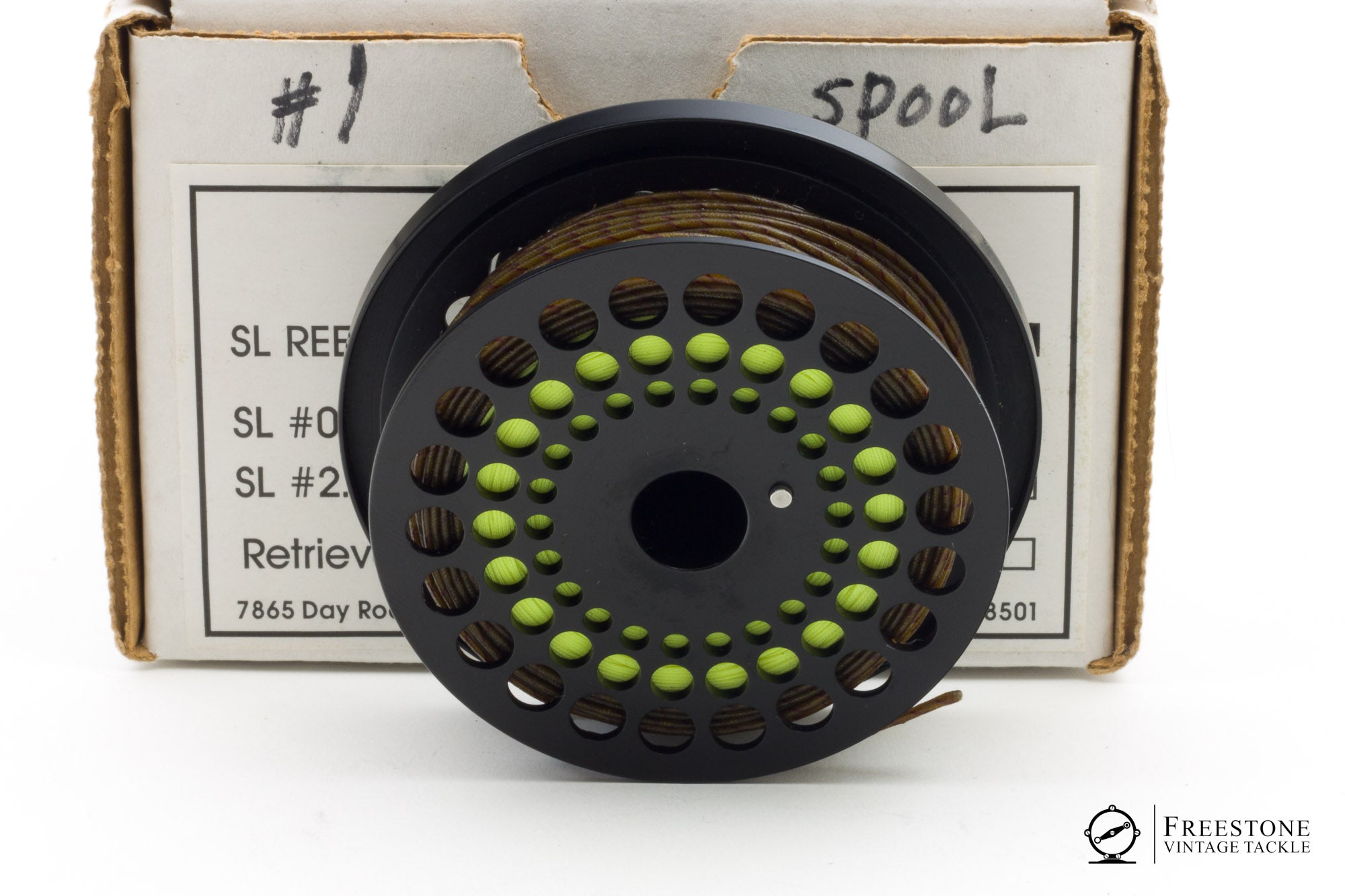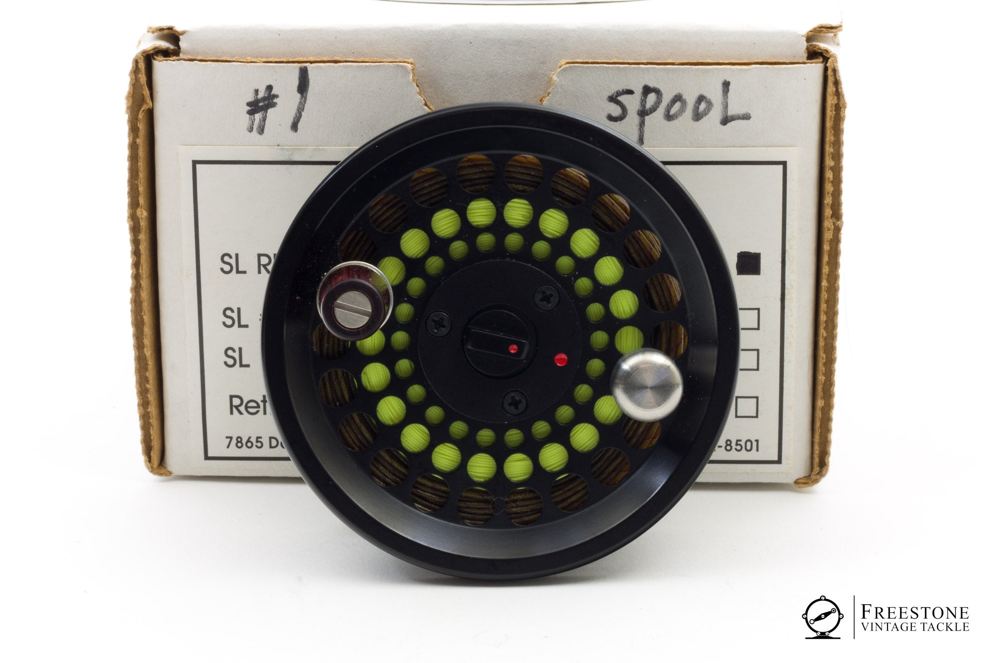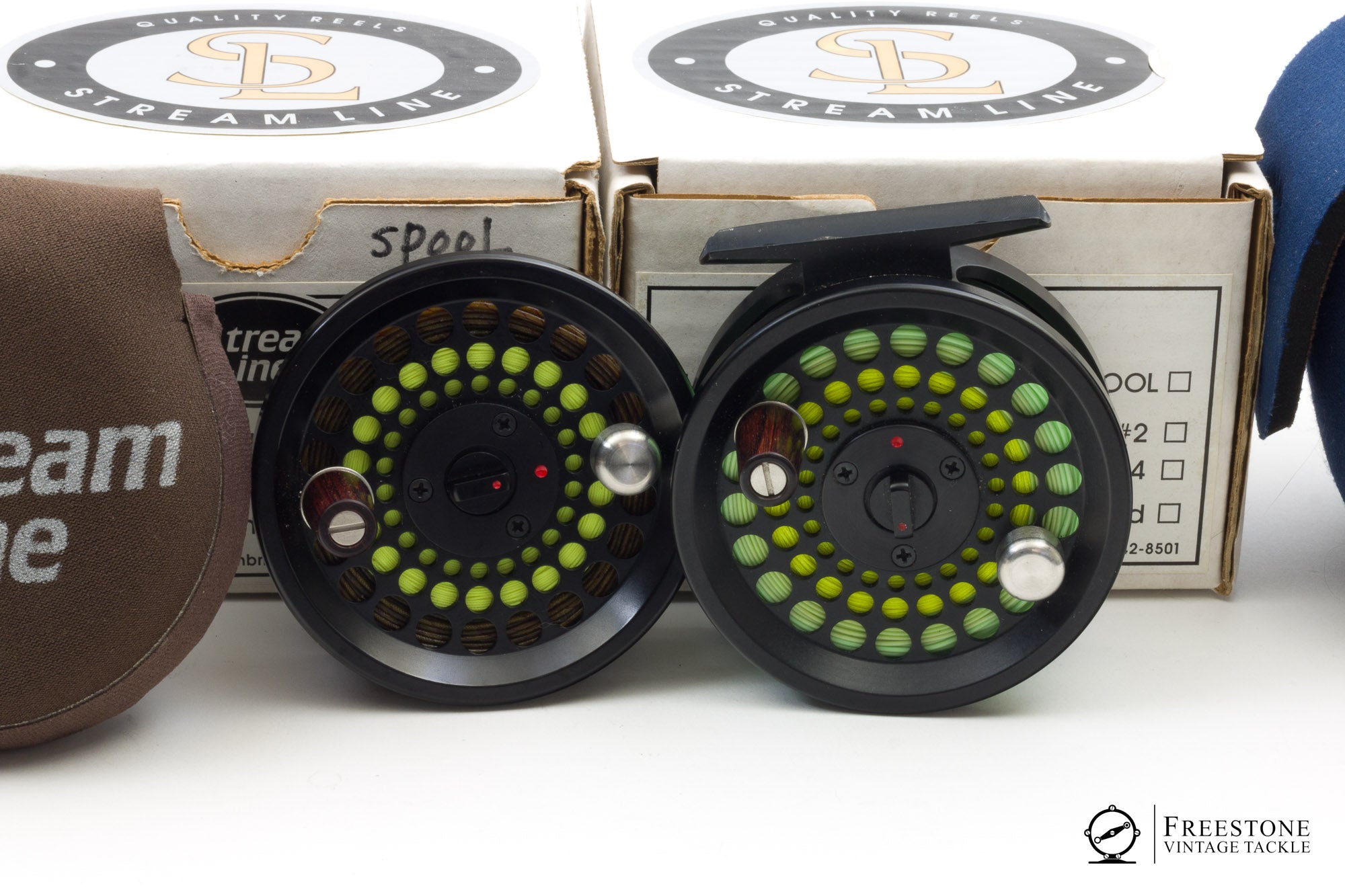 For sale here is a StreamLine SL1 reel with spare spool in excellent used condition. LHW. Black finish, ported frame and spool. Both spools fit the frame perfectly, and the strong adjustable drag works as intended. Light wear to the edges and mounting marks to the foot. Both spools also come loaded with line. 3" diameter, capacity is for a WF4 + 100yds. Reel and spool both come in their original boxes with pouches and papers.