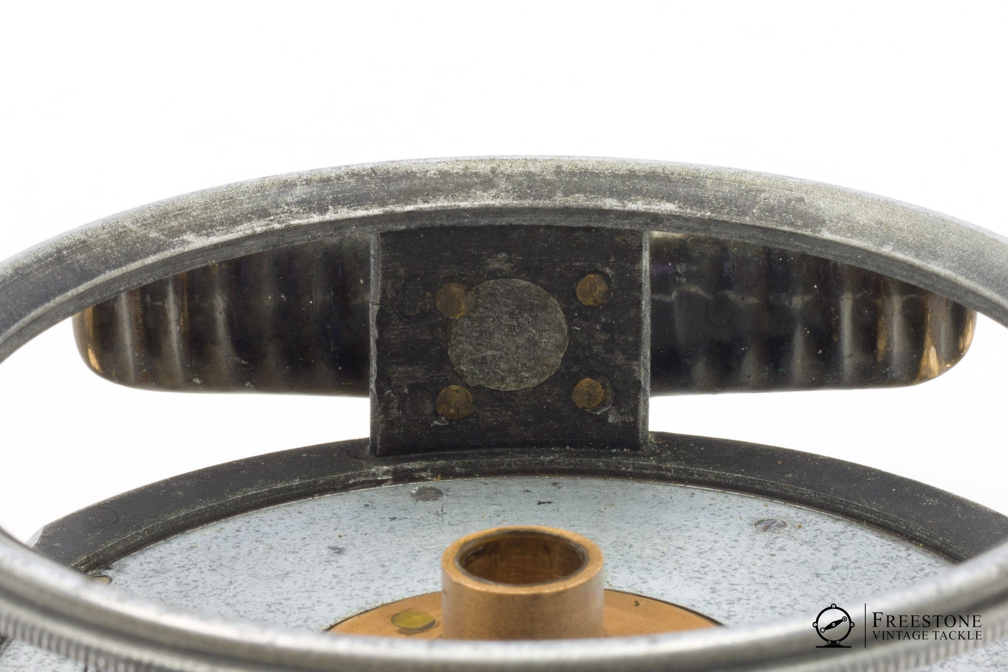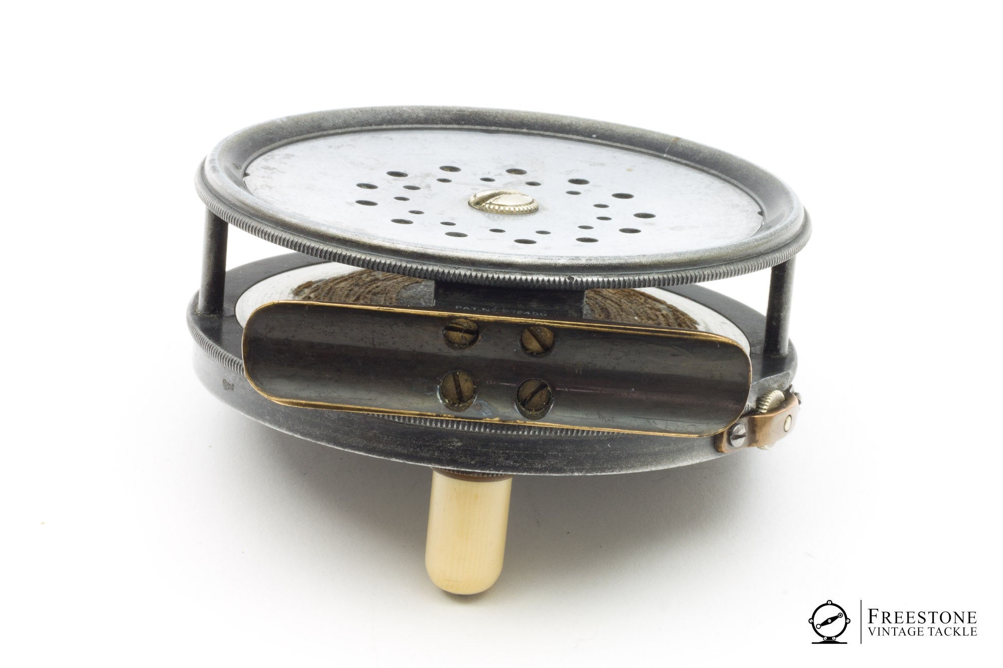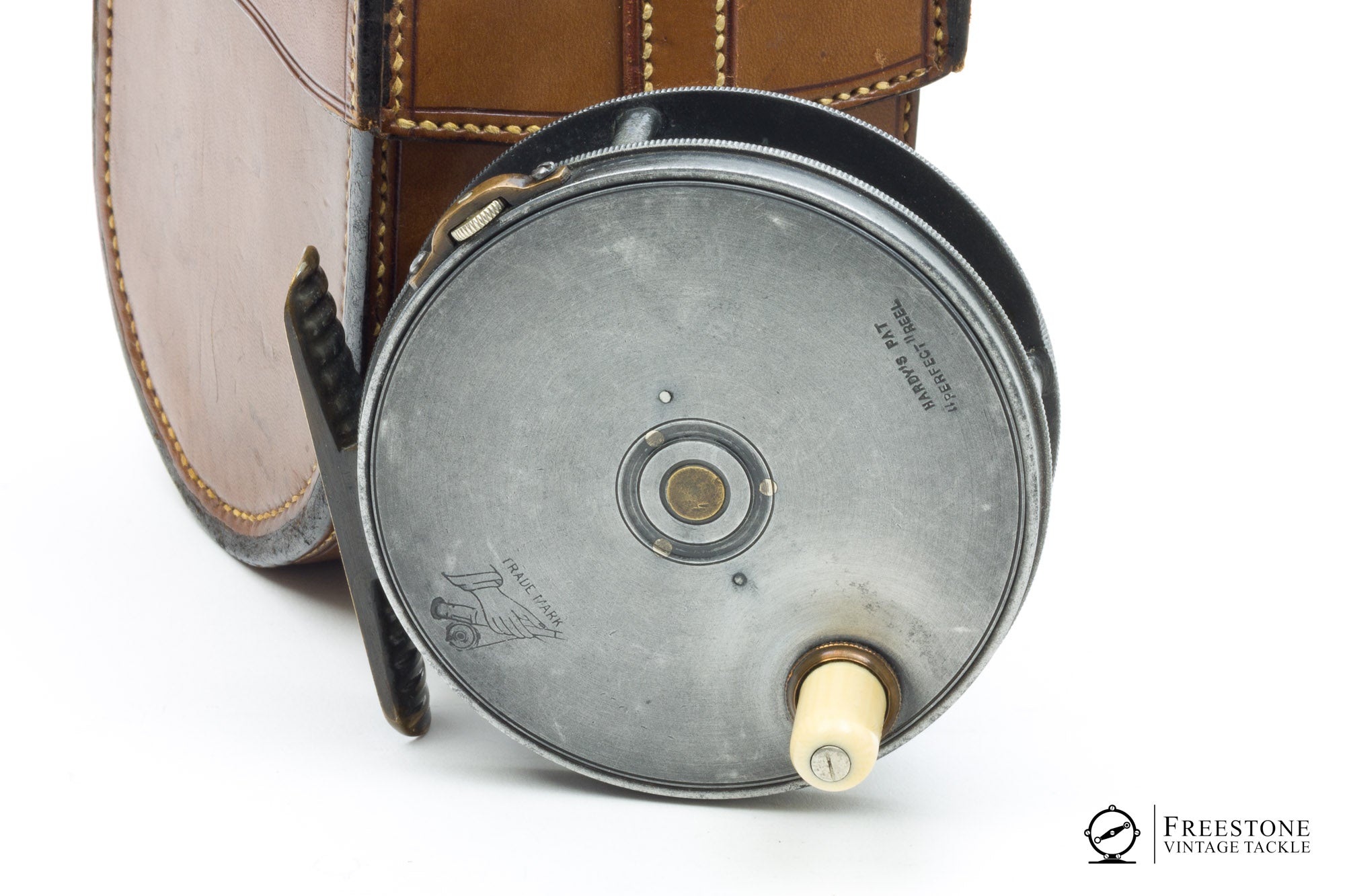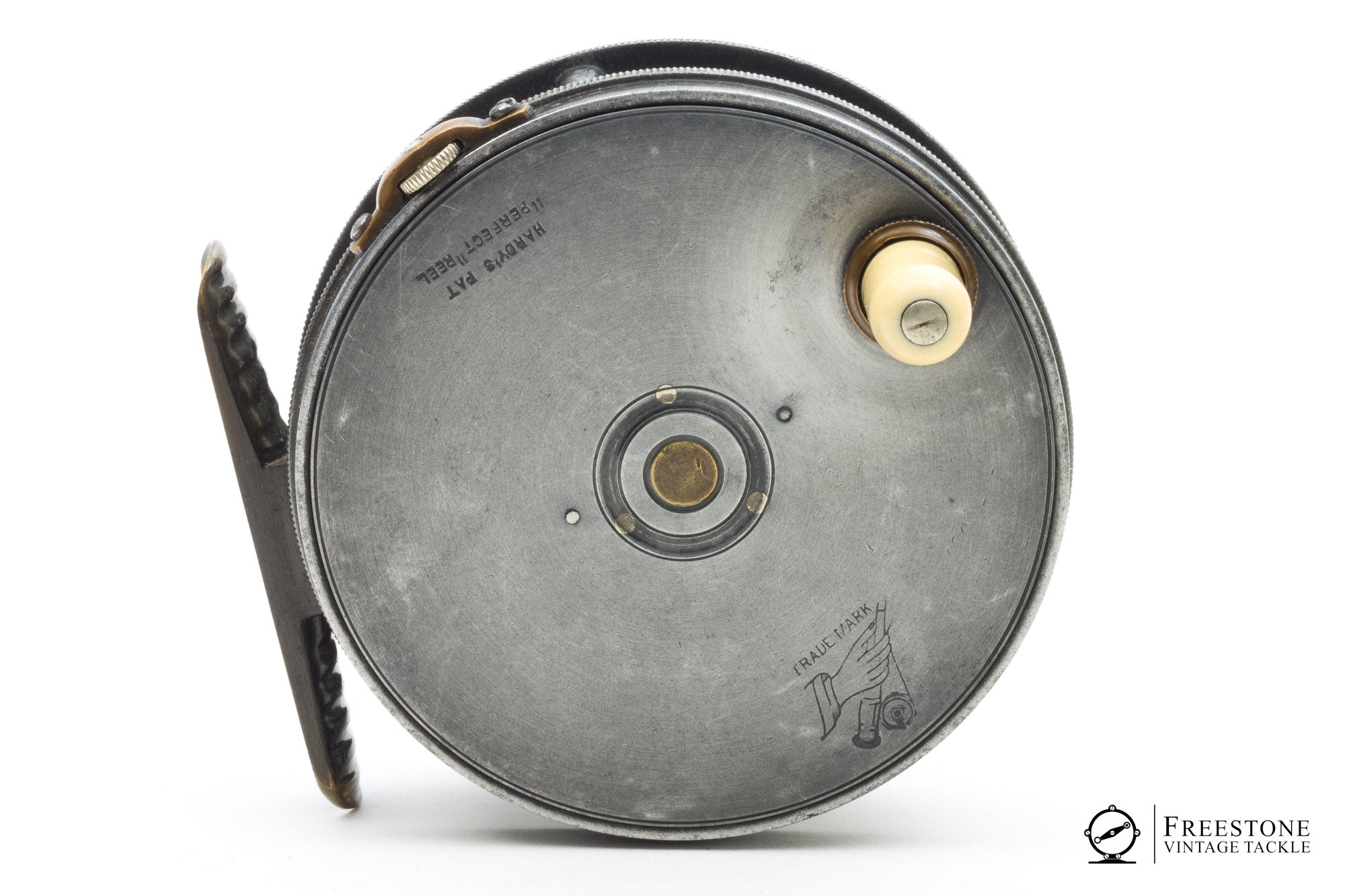 For sale here is an early Hardy Perfect 3 5/8" fly reel in very good condition. Featuring "Rod in Hand" and straight-line logos, Ivorine handle grasp and brass receiver. 4 cusp spool is fixed by a nickel silver retaining screw (reverse threaded), and the strap-over tensioner works as intended with strong RHW check. The ribbed brass foot looks like a Hardy factory replacement. The reel foot pillar has a small crack on one side. From the looks of it, it has probably been there for a very long time and appears stable. Weight is 7.31oz. A nice early Hardy Perfect, fitted with the flat-caliper 1896 checkwork. Sold in a Farlows block leather case with the letters "W. McC." inked on the lid.