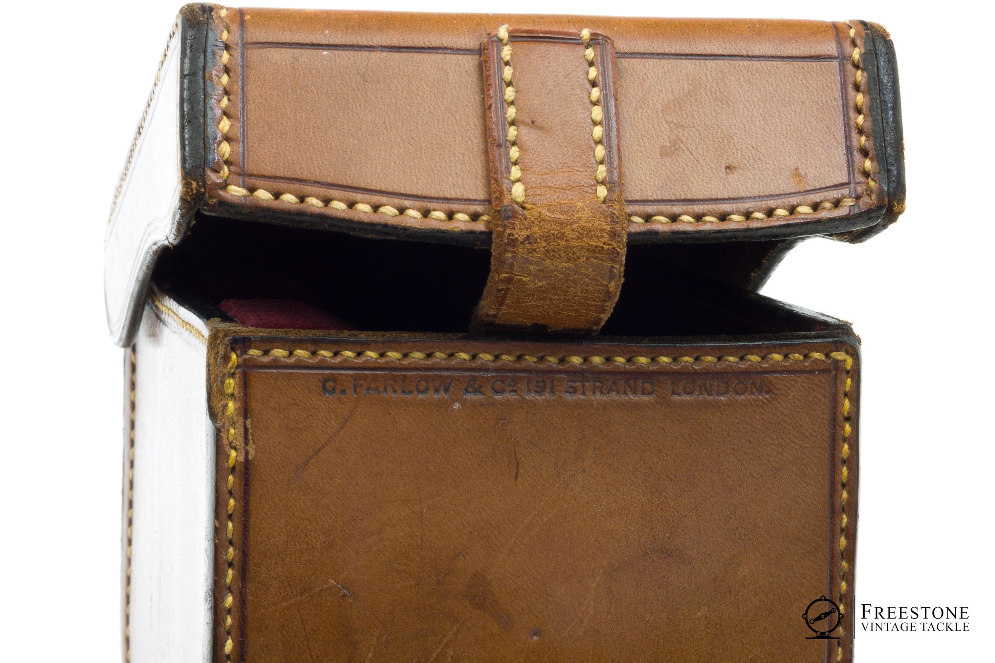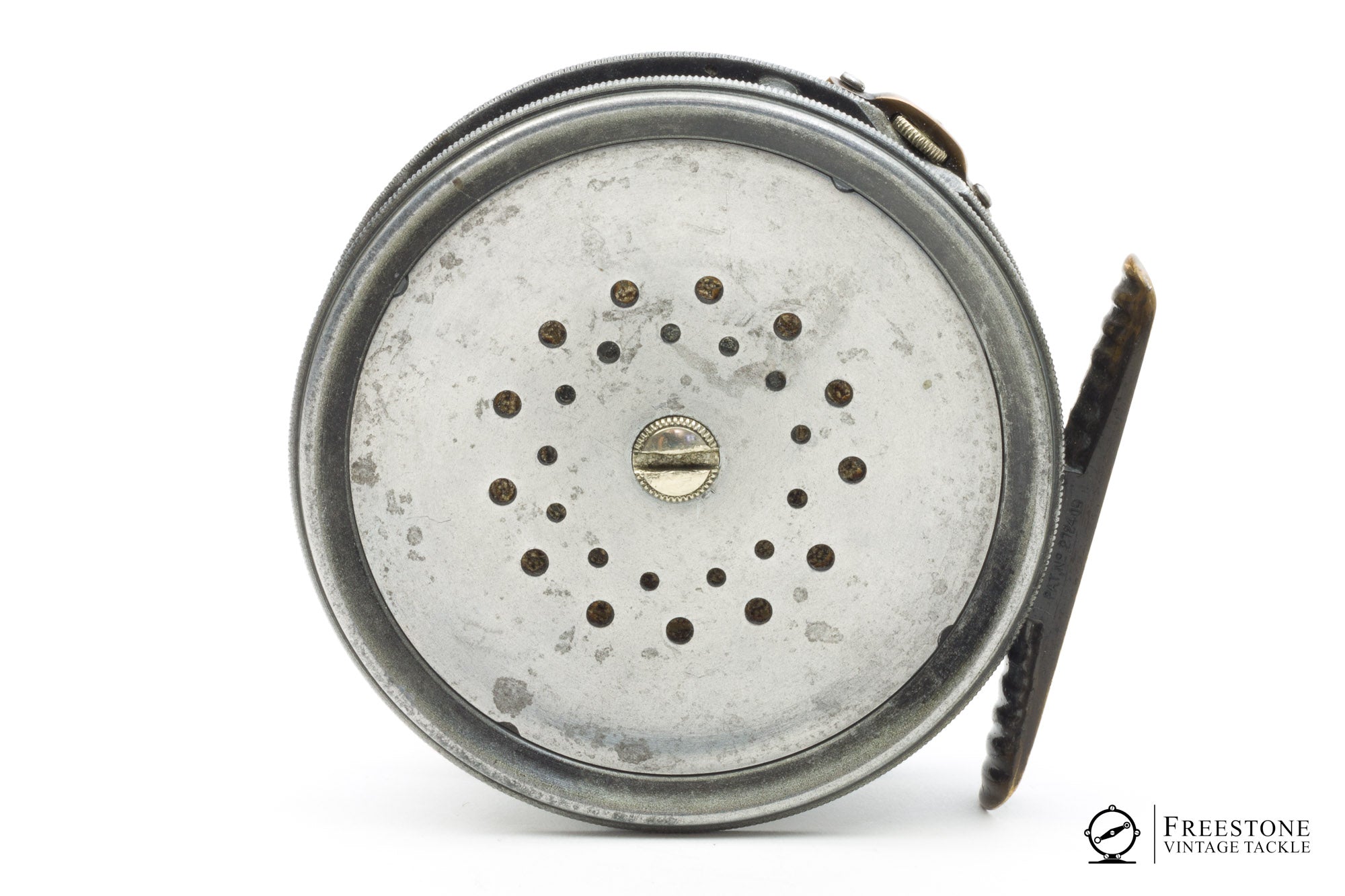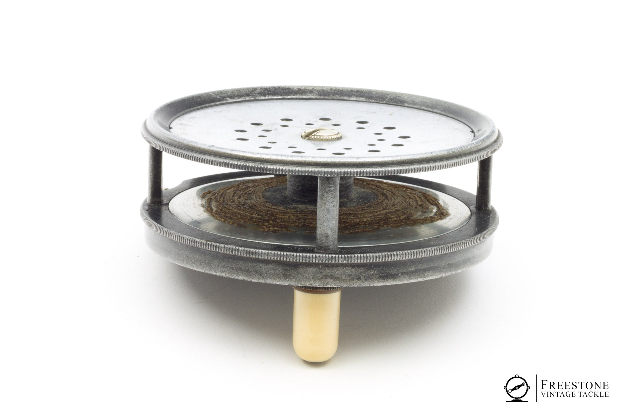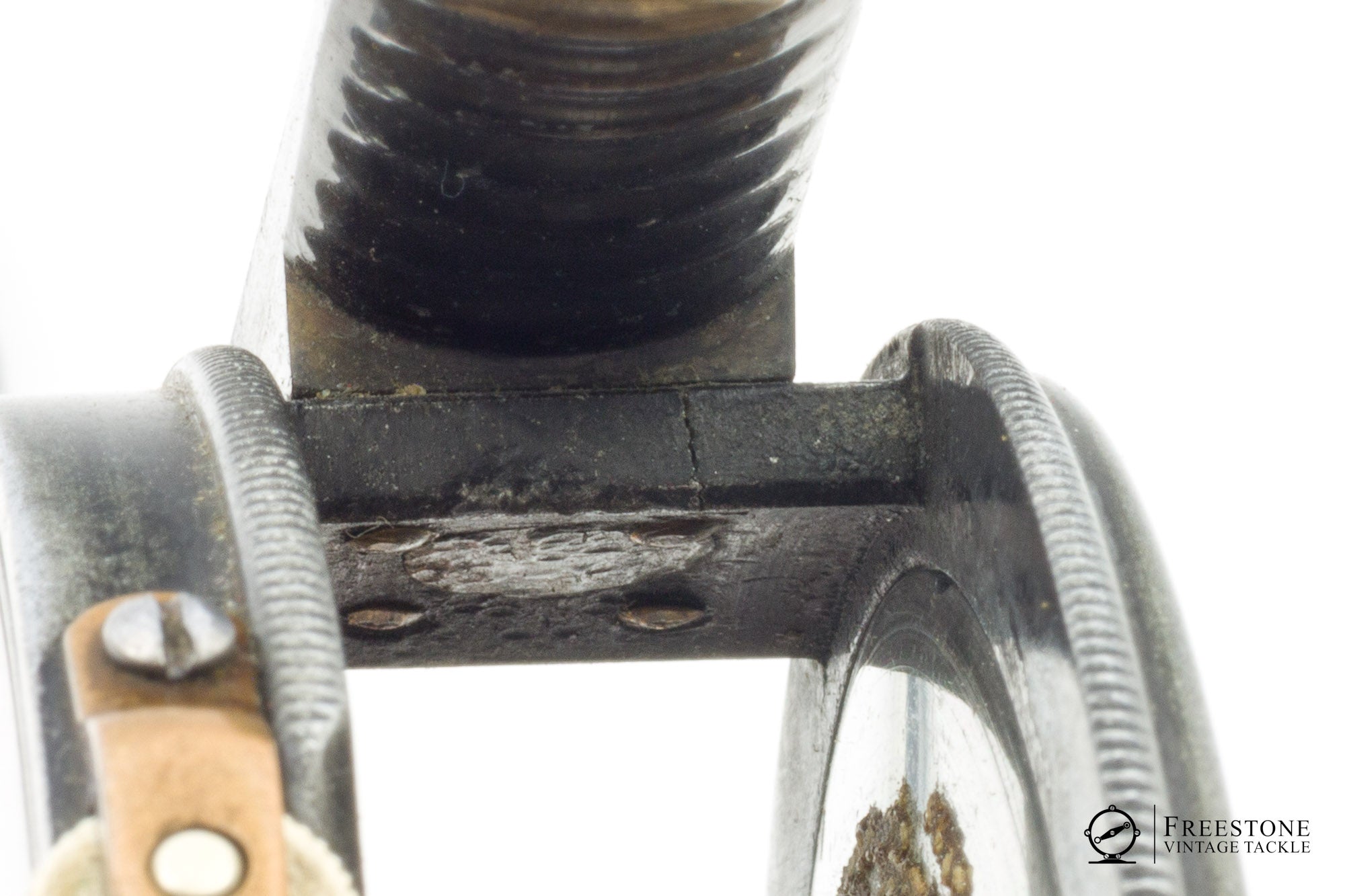 For sale here is an early Hardy Perfect 3 5/8" fly reel in very good condition. Featuring "Rod in Hand" and straight-line logos, Ivorine handle grasp and brass receiver. 4 cusp spool is fixed by a nickel silver retaining screw (reverse threaded), and the strap-over tensioner works as intended with strong RHW check. The ribbed brass foot looks like a Hardy factory replacement. The reel foot pillar has a small crack on one side. From the looks of it, it has probably been there for a very long time and appears stable. Weight is 7.31oz. A nice early Hardy Perfect, fitted with the flat-caliper 1896 checkwork. Sold in a Farlows block leather case with the letters "W. McC." inked on the lid.