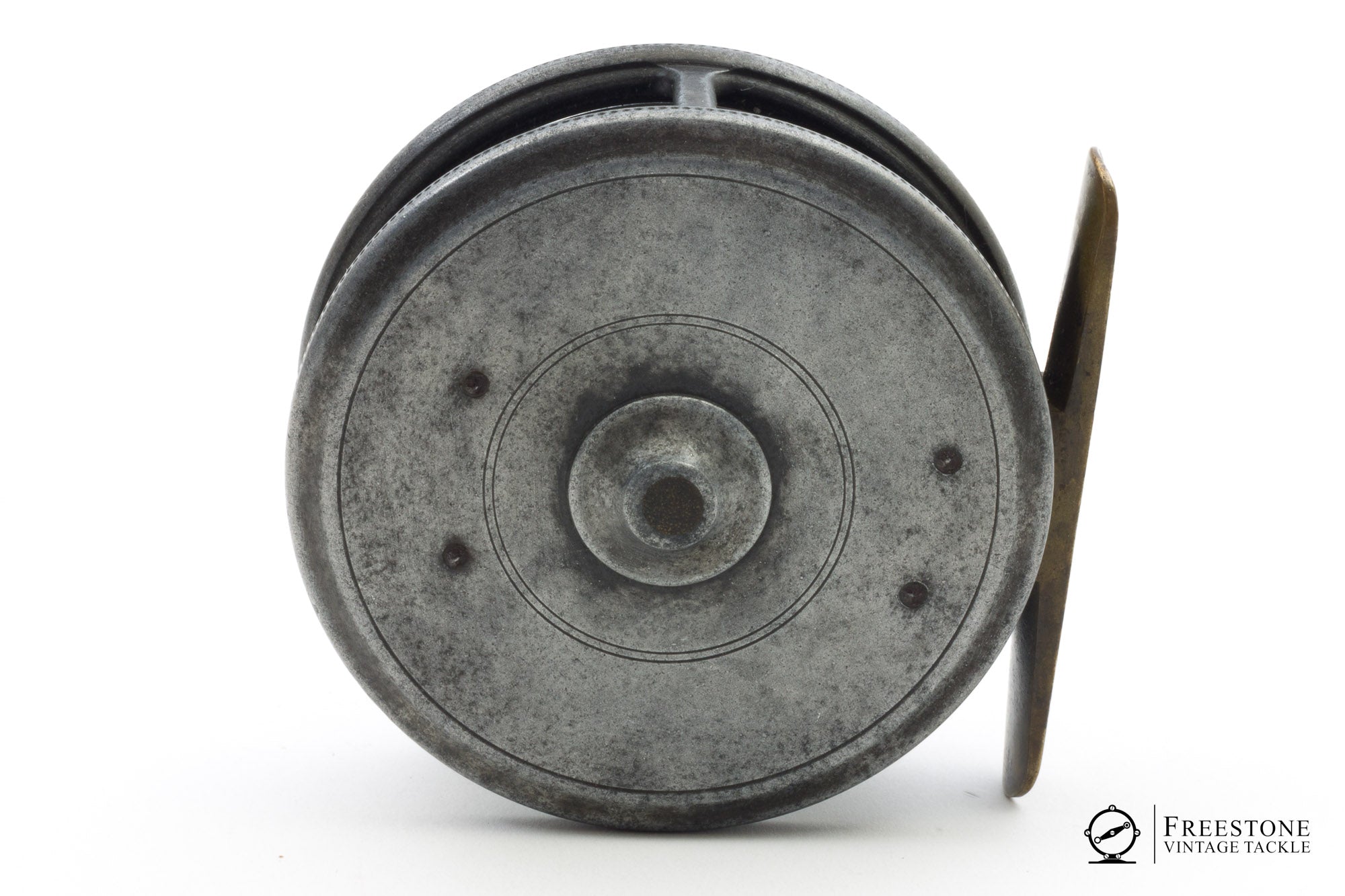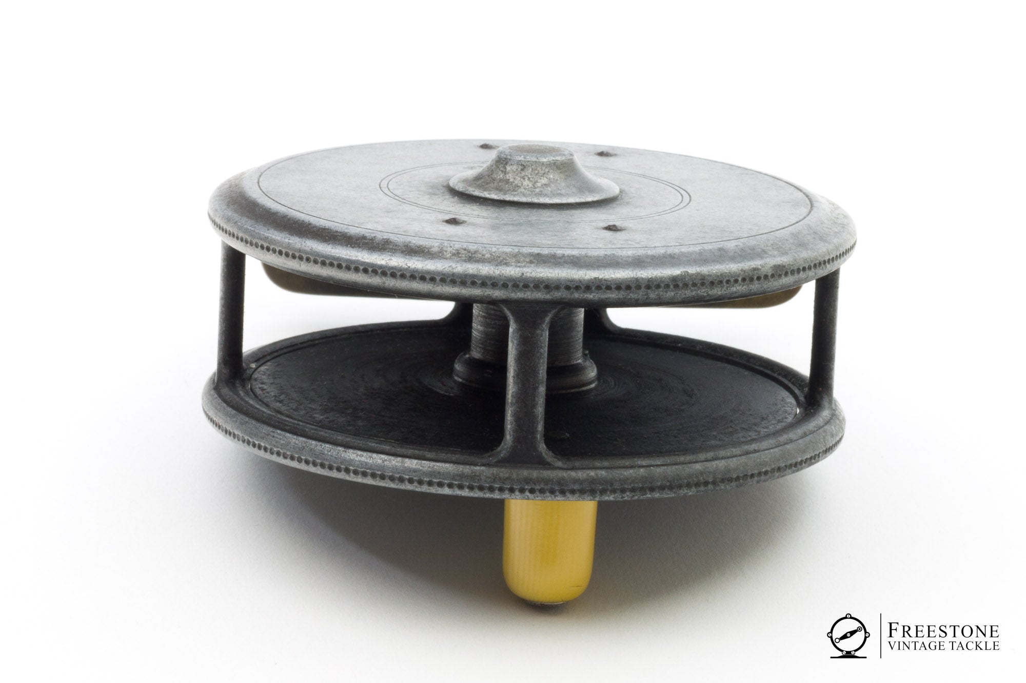For sale here is a scarce early Hardy Uniqua 3 1/8" fly reel in very good original condition. Made for a few short years between 1903 and about 1910, this one features a smooth brass foot, ivorine handle grasp and "horseshoe" spool latch. Fixed, flat caliper check with slight RHW bias. The leaded finish has worn to a gray patina and the stamping on the spool reads "Hardy's Patent - Uniqua Reel". The edges show a bit of wear, but the reel is mechanically tight. Weight is 4.08oz. Sold in a black vinyl Hardy's zippered case.