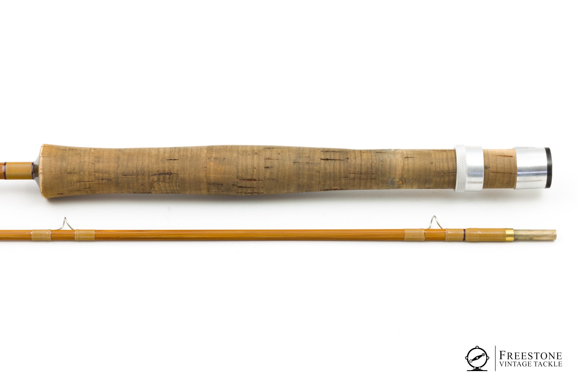 For sale here is a Winston 7'6" 2-piece / 1 tip 4wt, 3oz bamboo rod in excellent original condition. Serial #1092, made just after Winston's serial numbers rolled over from #9999 to #1000 in 1972. Hollow-fluted construction with medium tempered cane, bright guides and "putty" colored windings with oxblood accents. Both sections are full length & serialized, and the tip has a slight downward set. Duronz ferrules fit perfectly. Strap & ring hook keeper, Bakelite winding check and skeleton cork grip & reel seat. The cork is soiled but smooth. Scripted weight is 3oz, but my scale reads just under. Medium action, a delightfully smooth caster. The 7'6" 3oz rod is 1/8oz lighter than the cataloged "Leetle Feller". Sold in the original gray rod bag and aluminum tube with 80% label.