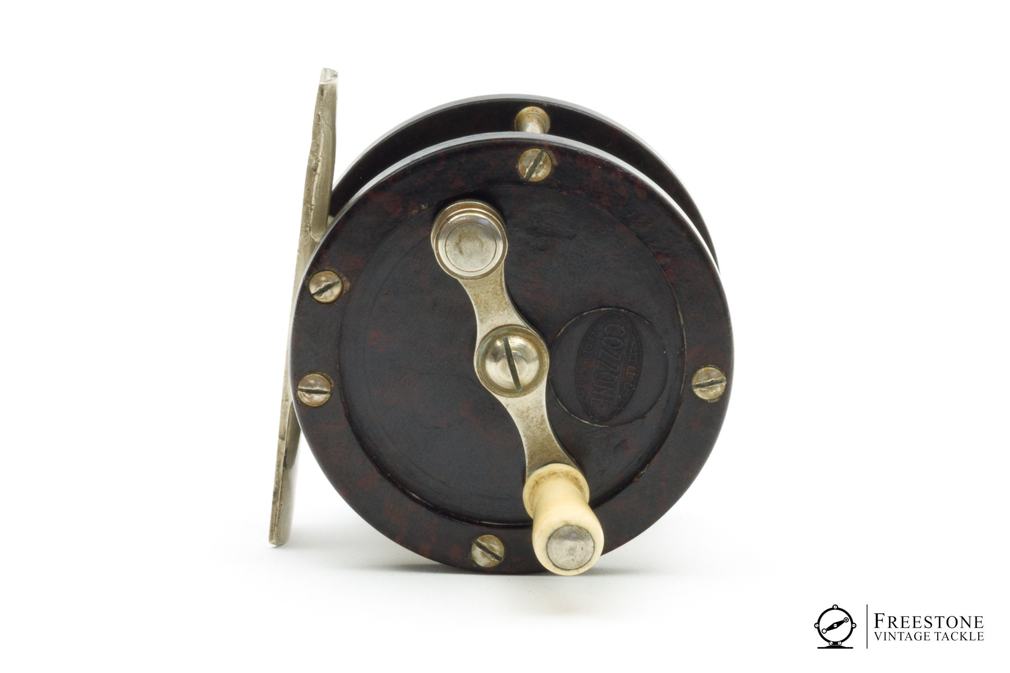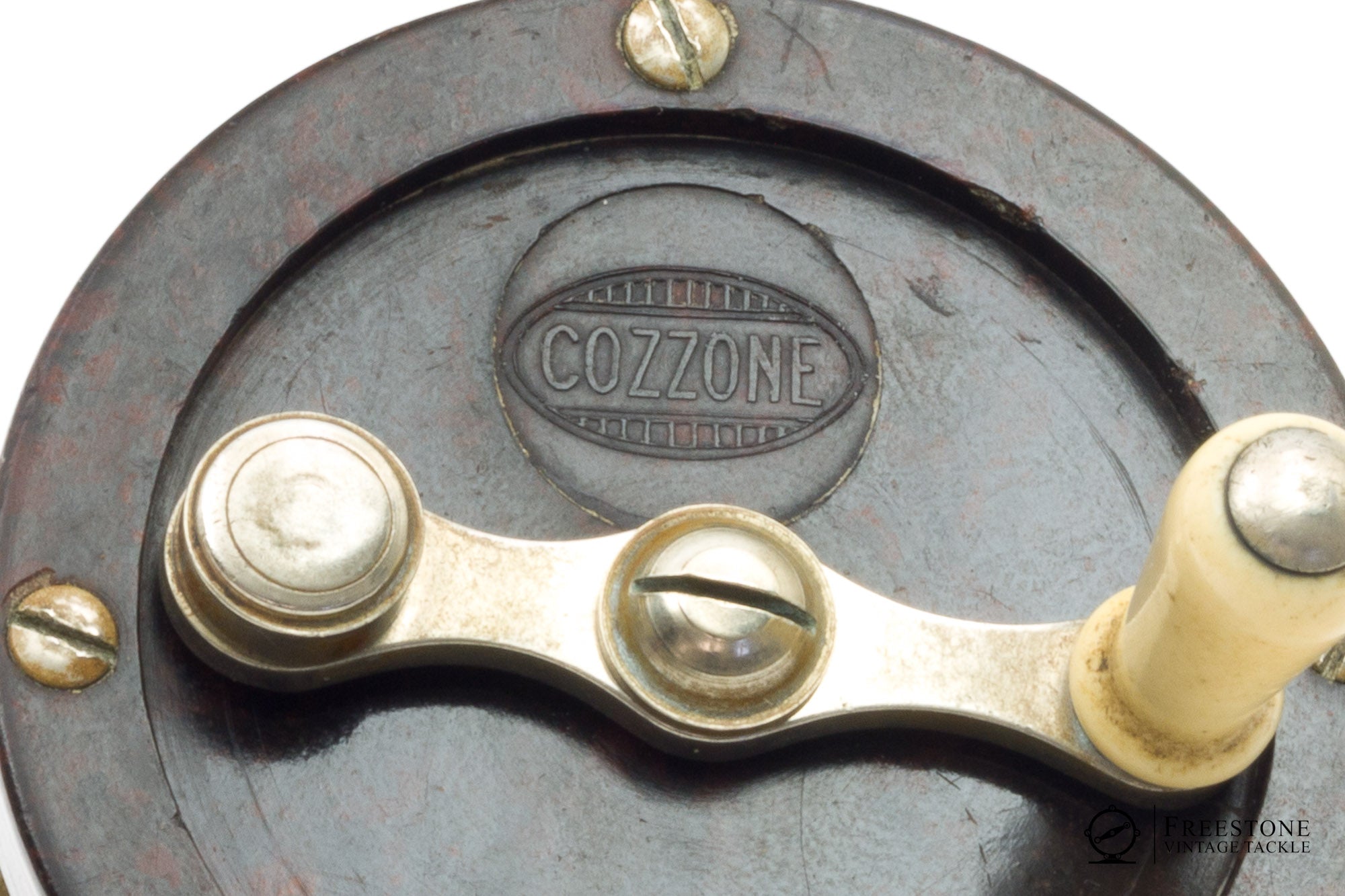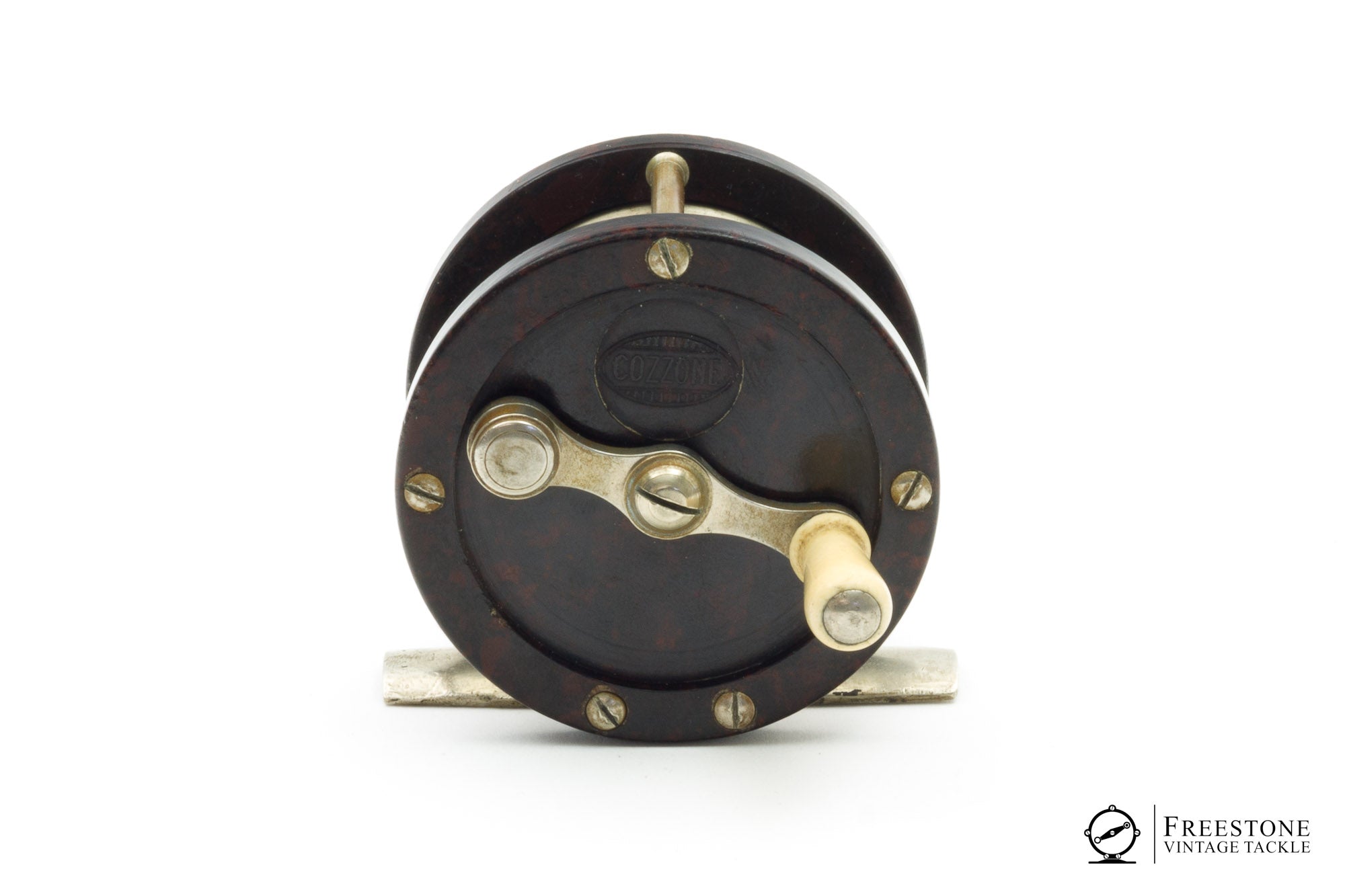 For sale here is a rare marbleized Cozzone 60yd fly reel in very good used condition. Oxblood & black marbleized Bakelite (not as pronounced as the more famous Philbrook & Payne reels, but still a beautiful coloration). Counterbalanced nickel silver handle with ivorroid grasp and fixed RHW check.   The back of the reel features a nickel silver oil cap & star washer, and the on/off clicker works as intended. The Cozzone logo is crisp and clear on the face plate. 2 1/4" diameter with a spool width of 1", the reel weighs 4.09oz. The only condition notes I have are some tool marks on one end of the reel foot and a tiny chip to the Bakelite around one of the reel foot screws on the back. I would characterize both as minor cosmetic issues. The Cozzone reels enjoyed a short production run beginning in the early 1920's and ending with the onset of the Great Depression in the early 1930's. Cozzone trout reels are cherished by collectors and the marbleized reels are particularly rare.