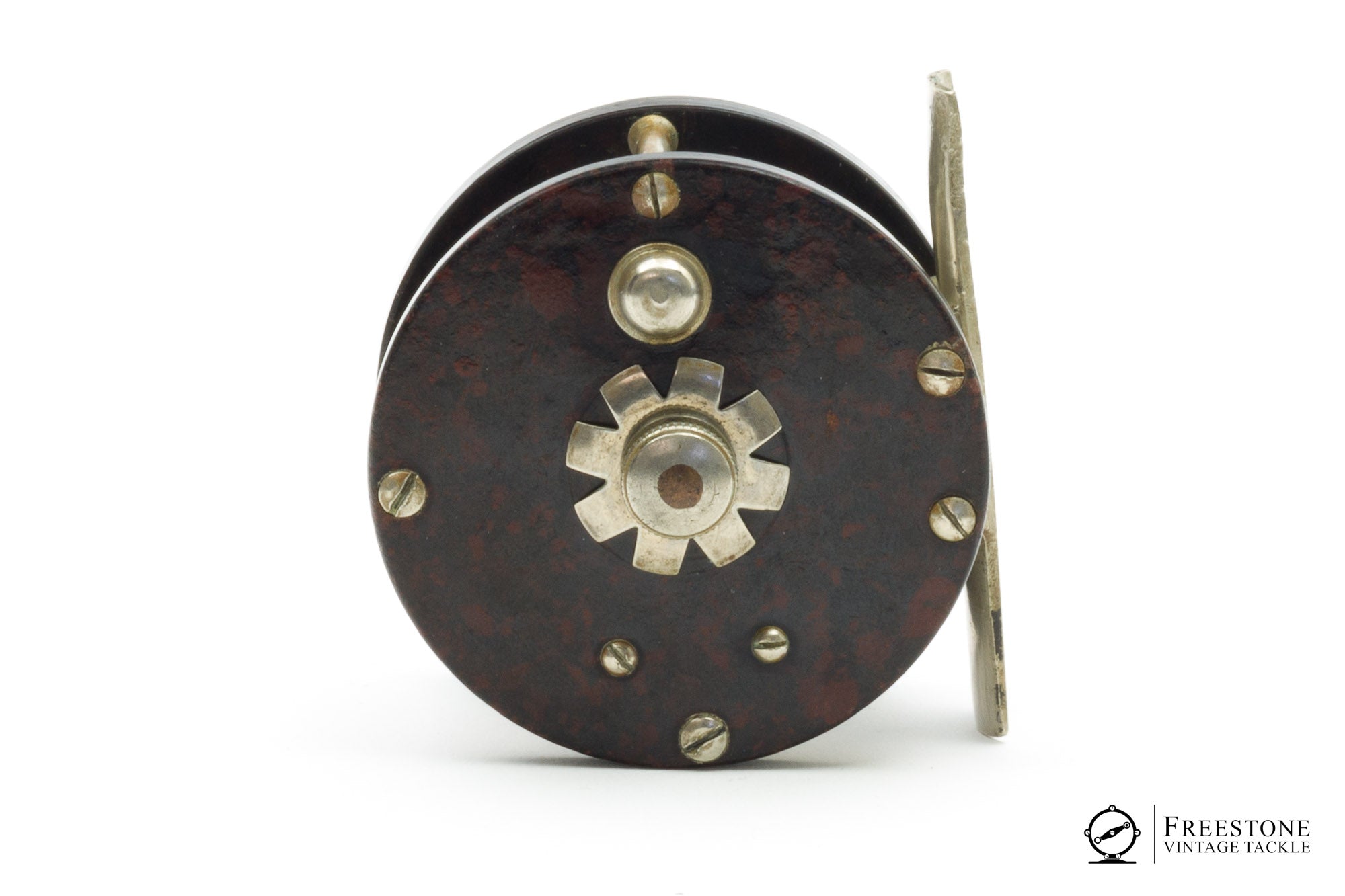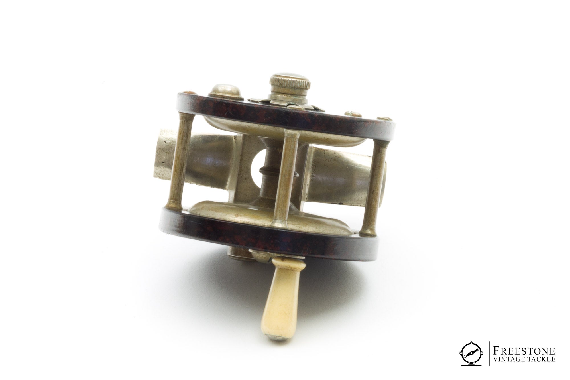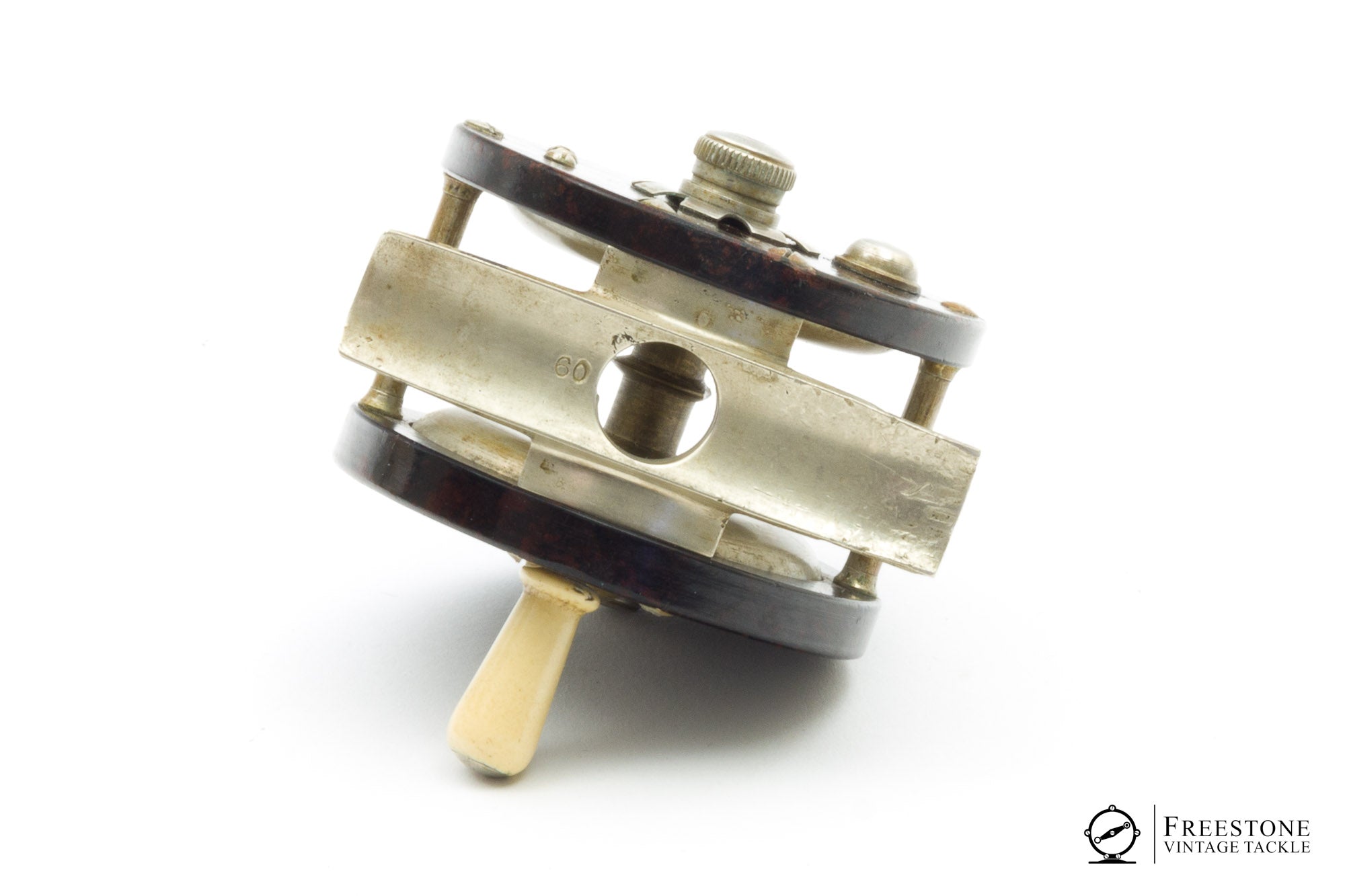 For sale here is a rare marbleized Cozzone 60yd fly reel in very good used condition. Oxblood & black marbleized Bakelite (not as pronounced as the more famous Philbrook & Payne reels, but still a beautiful coloration). Counterbalanced nickel silver handle with ivorroid grasp and fixed RHW check.   The back of the reel features a nickel silver oil cap & star washer, and the on/off clicker works as intended. The Cozzone logo is crisp and clear on the face plate. 2 1/4" diameter with a spool width of 1", the reel weighs 4.09oz. The only condition notes I have are some tool marks on one end of the reel foot and a tiny chip to the Bakelite around one of the reel foot screws on the back. I would characterize both as minor cosmetic issues. The Cozzone reels enjoyed a short production run beginning in the early 1920's and ending with the onset of the Great Depression in the early 1930's. Cozzone trout reels are cherished by collectors and the marbleized reels are particularly rare.
