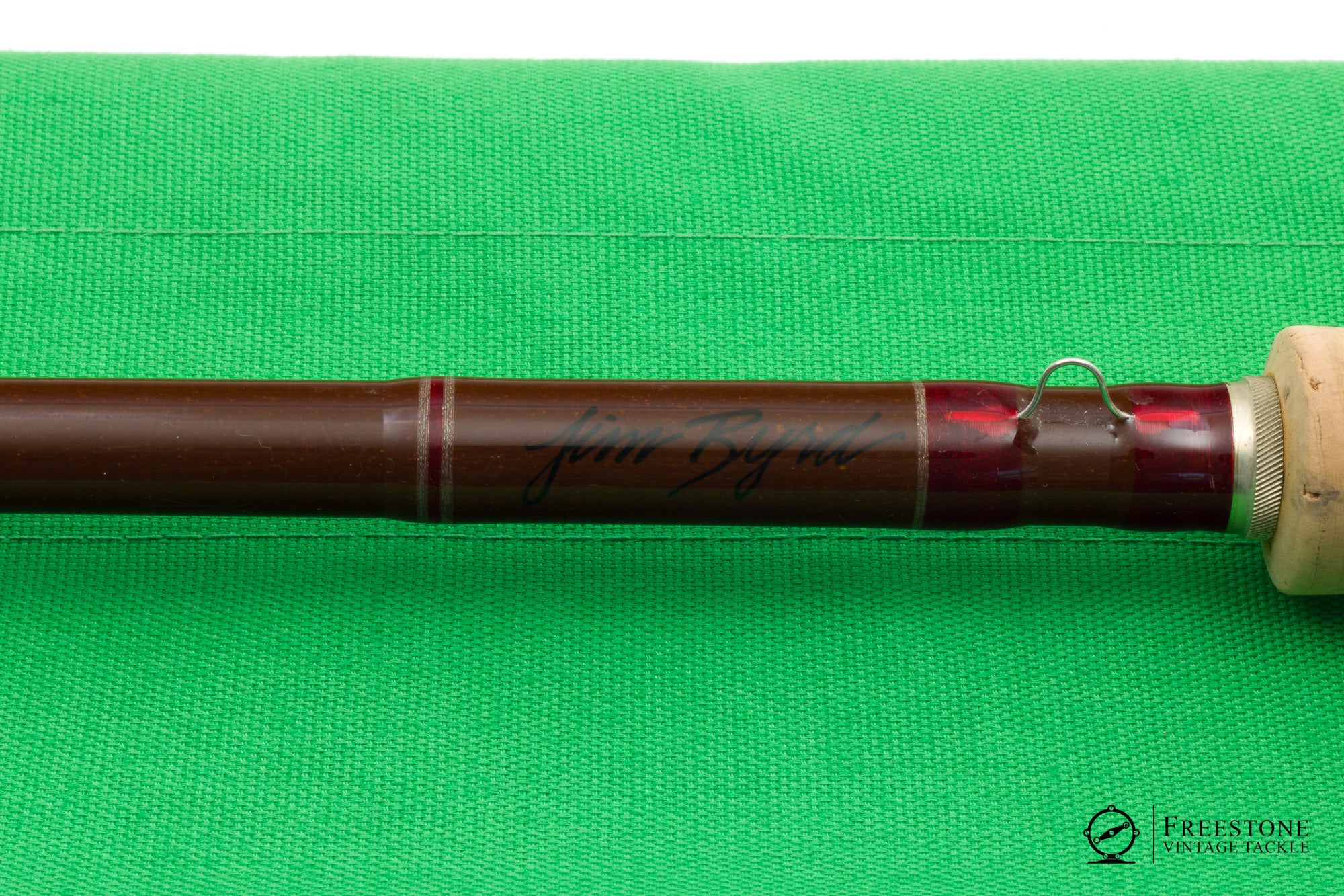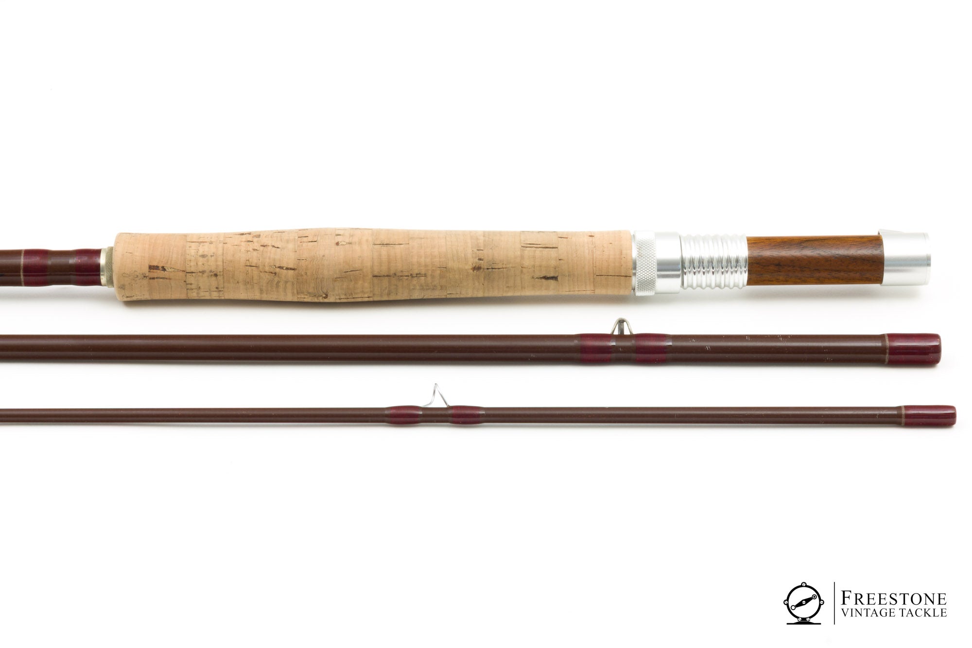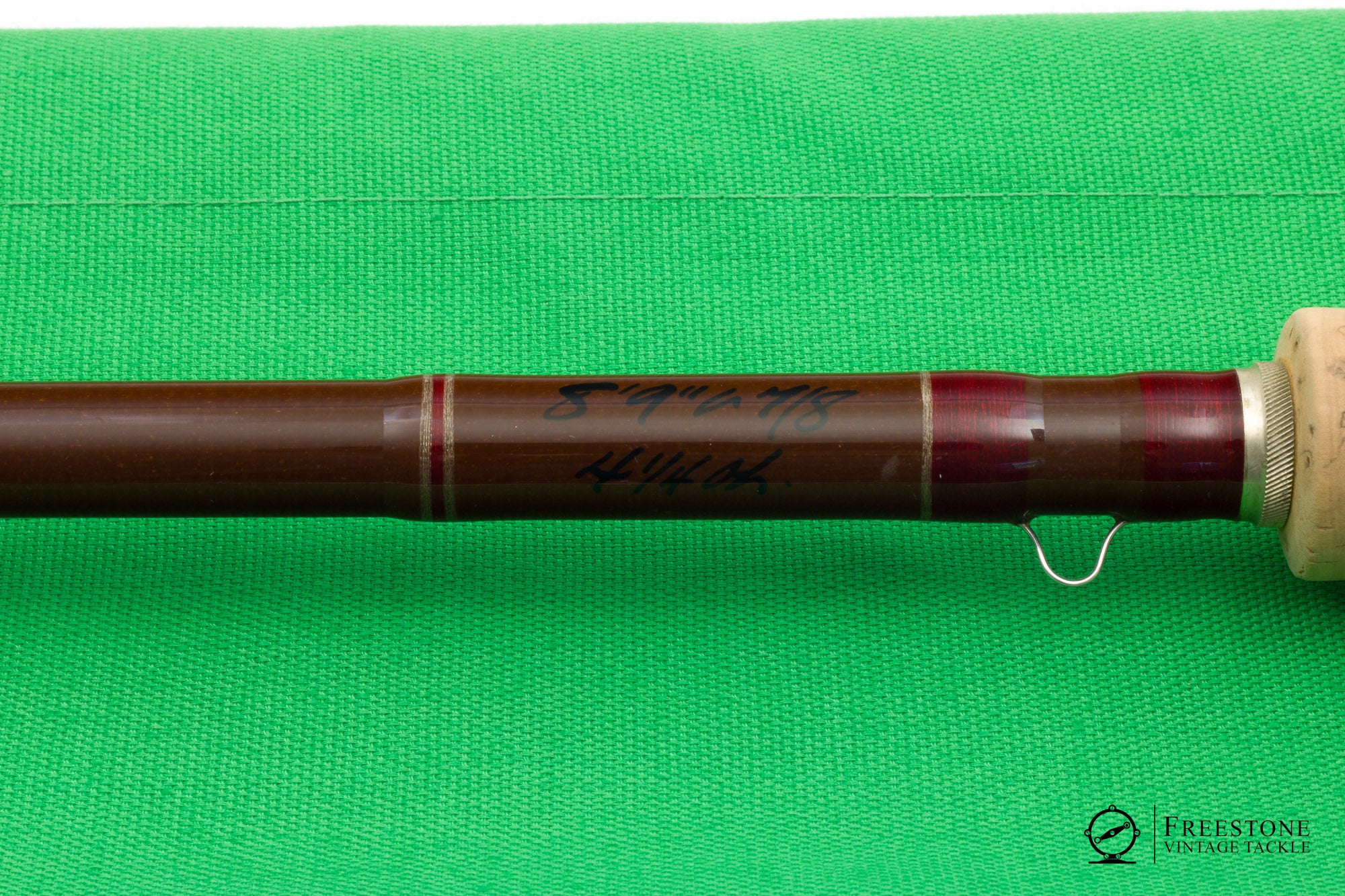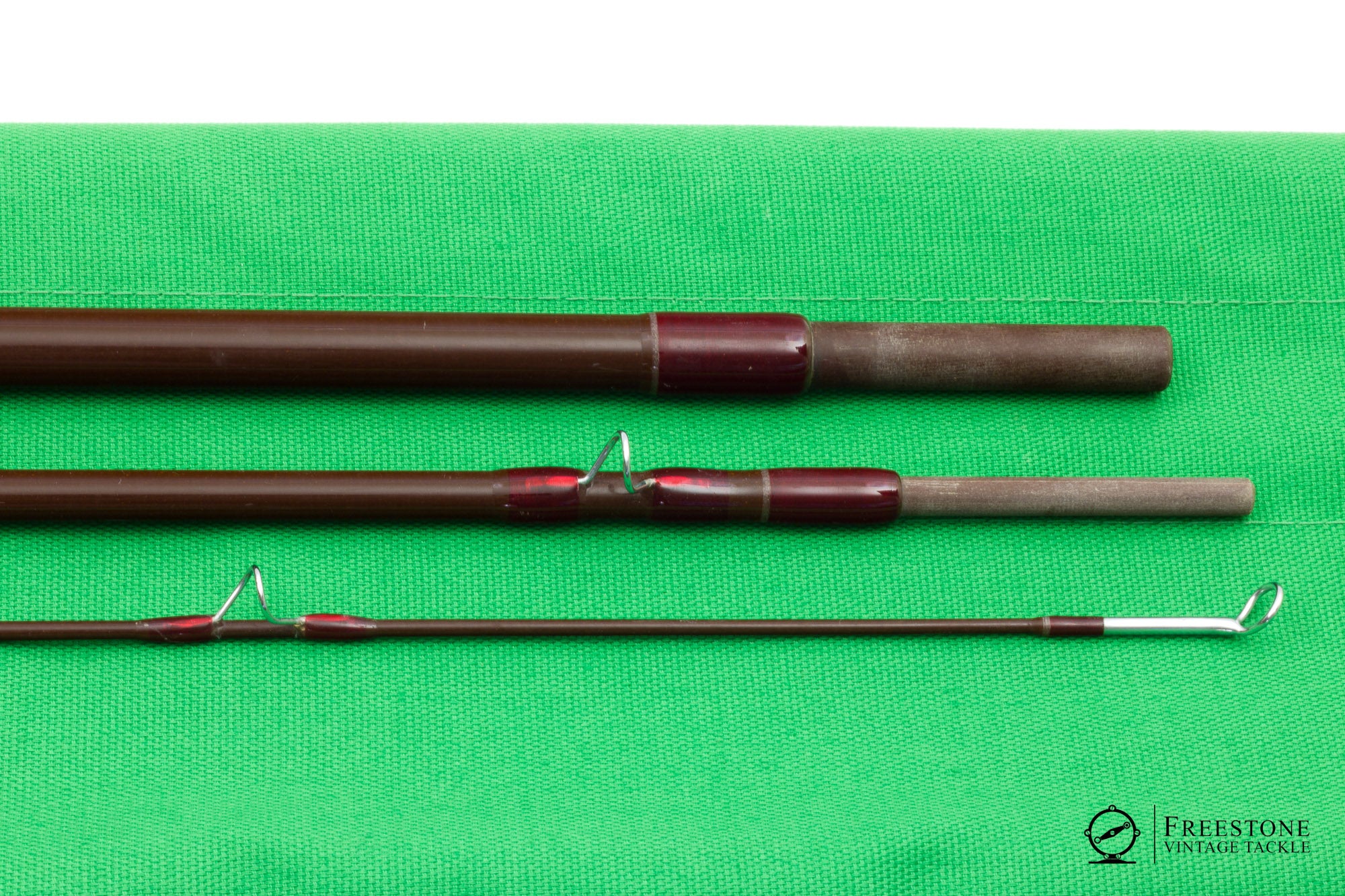 For sale here is an R.L. Winston 8'9" 3pc 7/8wt fiberglass rod in excellent used condition. This is a Montana-era steelhead rod, built on a sanded brown blank with bright guides and crimson wraps. Spigot ferrules fit perfectly with small gaps to allow for wear. Scripted weight is 4 1/4oz but my scale reads 3.9oz. The script on the butt is bold and clear, and the original owner's name is inked next to the hook keeper (slightly bent). 7" grip is smooth with light soiling, and the rod is fitted with a bright aluminum reel seat over dark wood spacer. Powerful, medium fast fiberglass action. I like it with a DT7, especially at distances longer than 35'. A fun option for targeting bigger fish. Sold in the original bag and tube.